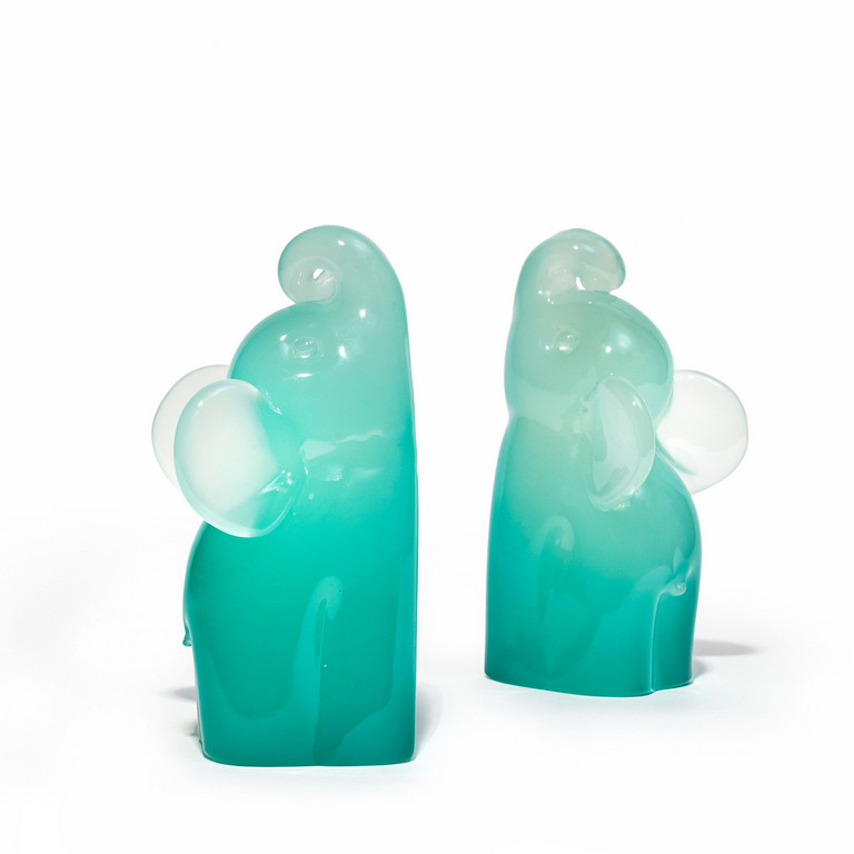 Una coppia di elefantini reggilibro in vetro opalino sfumato verdemare circa 1955.