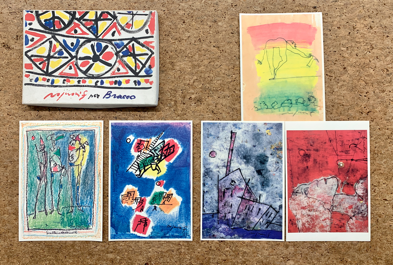 Cofanetto in cartone contenente 5 riproduzioni fotolitografiche sciolte di opere dell’Artista, cenni biografici e un colophon con testo di Angelo Mistrangelo.