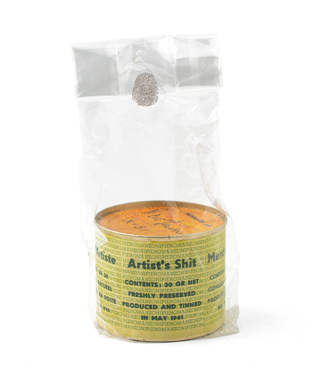 Firma stampata sul tappo, impronta digitale dell'artista serigrafata sul sacchetto