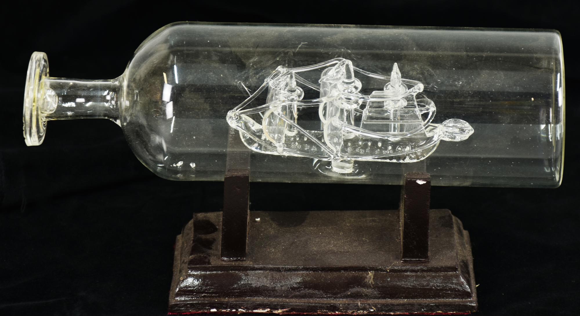 NAVE IN BOTTIGLIA nave in bottiglia in vetro soffiato con supporto in legno...