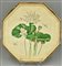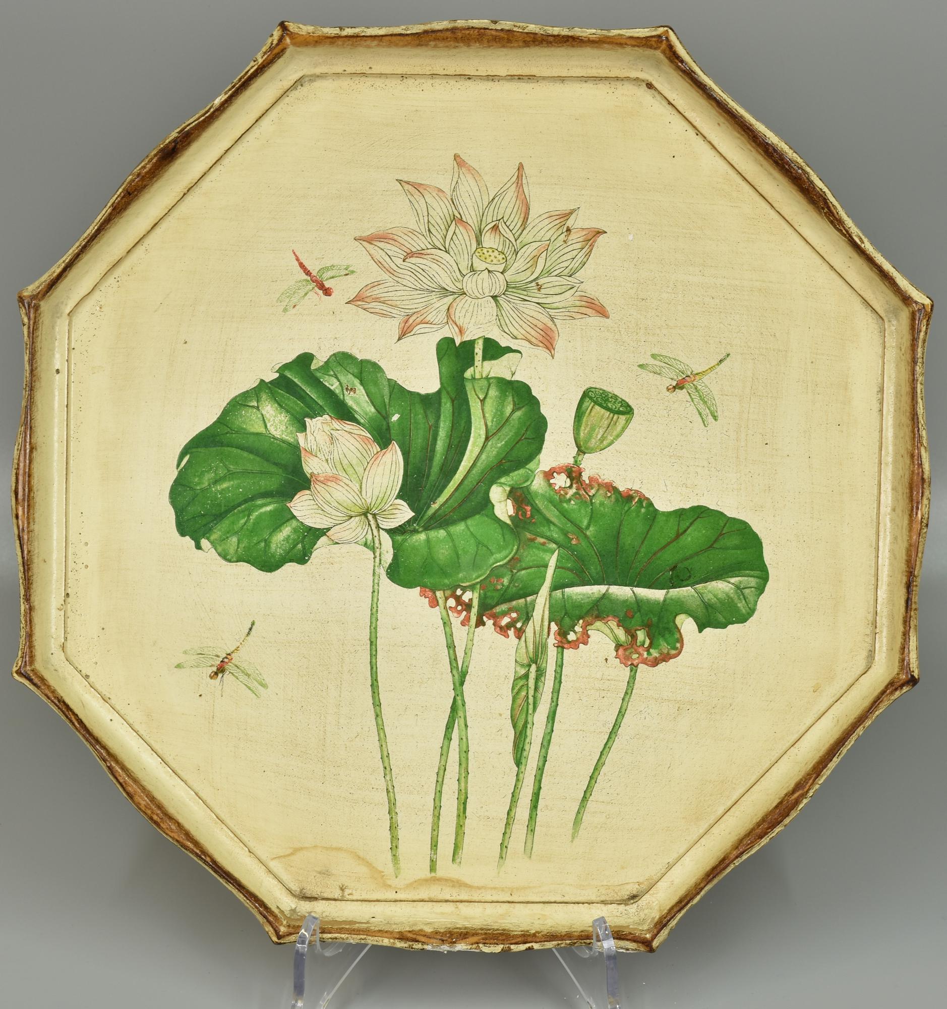 vassoio in legno di forma ottagonale decorato con foglie e libellule