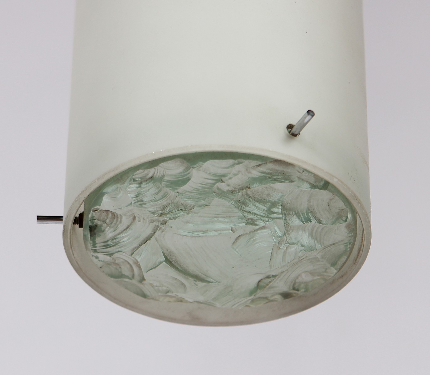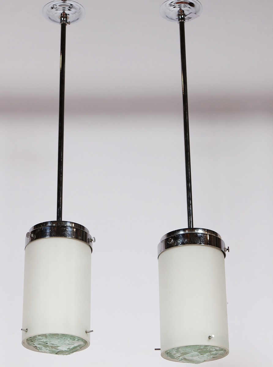 FONTANA ARTE Coppia di lampadari. Metallo e vetro martellato. Cm 66,00 x 11,00. Anni '60.