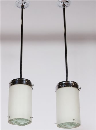 FONTANA ARTE Coppia di lampadari. Metallo e vetro martellato. Cm 66,00 x...