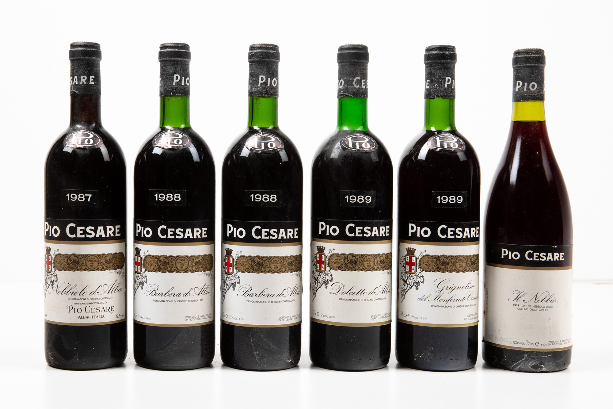 Pio Cesare, Nebbiolo d'Alba Pio Cesare, Barbera d'Alba Pio Cesare, Dolcetto d'Alba Pio Cesare, Grignolino del Monferrato Casale Pio Cesare, Il Nebbio, (6 Bts), Nebbiolo d'Alba, 1987, 1 Bt TS, Barbera d'Alba, 1988, 2 Bts TS, Dolcetto d'Alba, 1989, 1 Bt TS, Grignolino del Monferrato Casale, 1989, 1 Bt TS, Il Nebbio, 1989, 1 Bt BN, , , (etichette e capsule con segni d'usura del tempo)