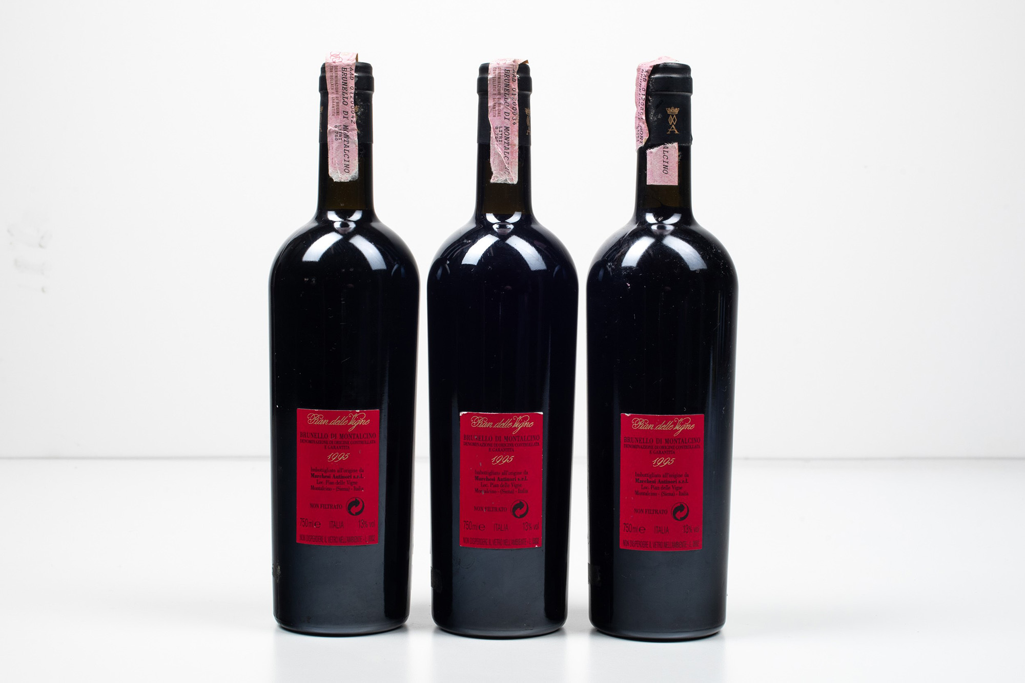 Antinori, Brunello di Montalcino Pian delle Vigne, (3 Bts), 1995, 3 Bts TS, , (etichette e capsule con segni d'usura del tempo)