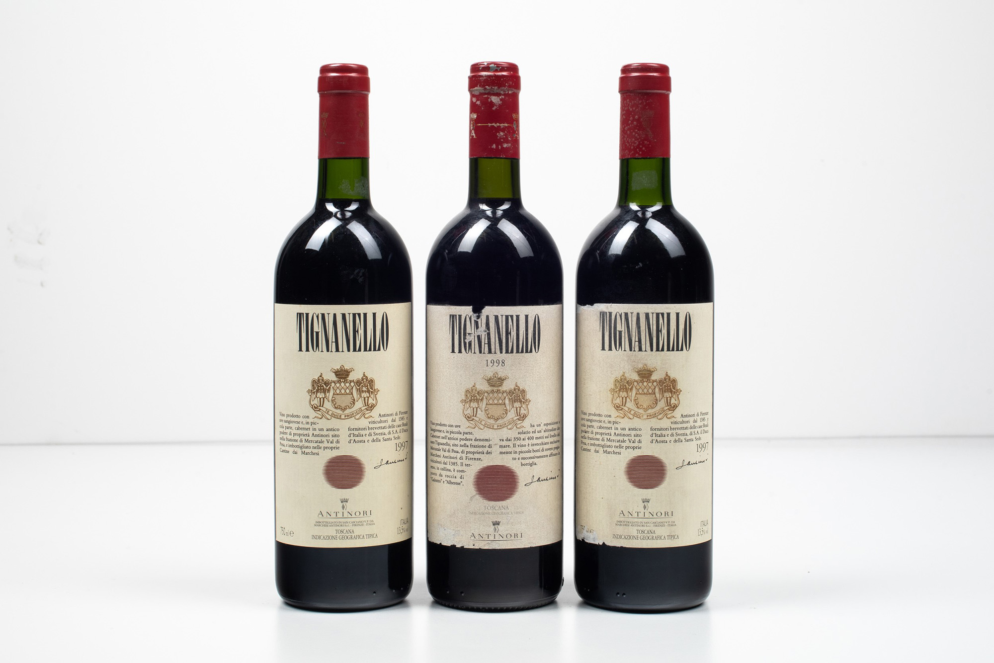 Antinori, Tignanello, (3 Bts), 1997, 2 Bts BN, 1998, 1 Bt BN, (etichette danneggiate e capsule con segni d'usura del tempo)