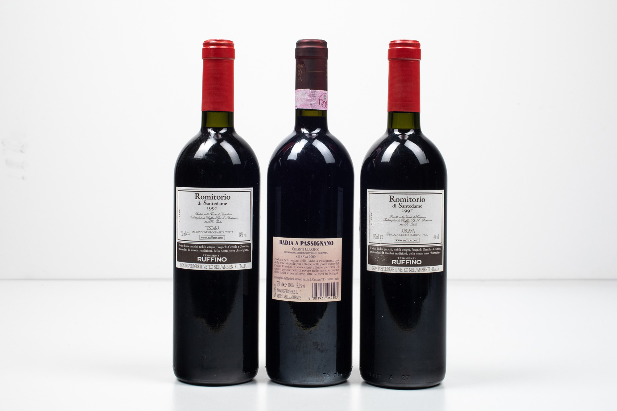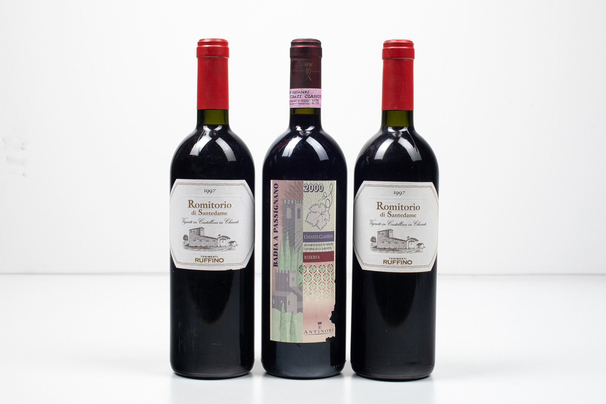 Tenimenti Ruffino, Romitorio Santedame Antinori Badia a Passignano, Chianti Classico Riserva, (3 Bts), Romitorio Santedame, 1997, 2 Bts BN, Chianti Classico Riserva, 2000, 1 Bt WN, (etichette e capsule con segni d'usura del tempo)