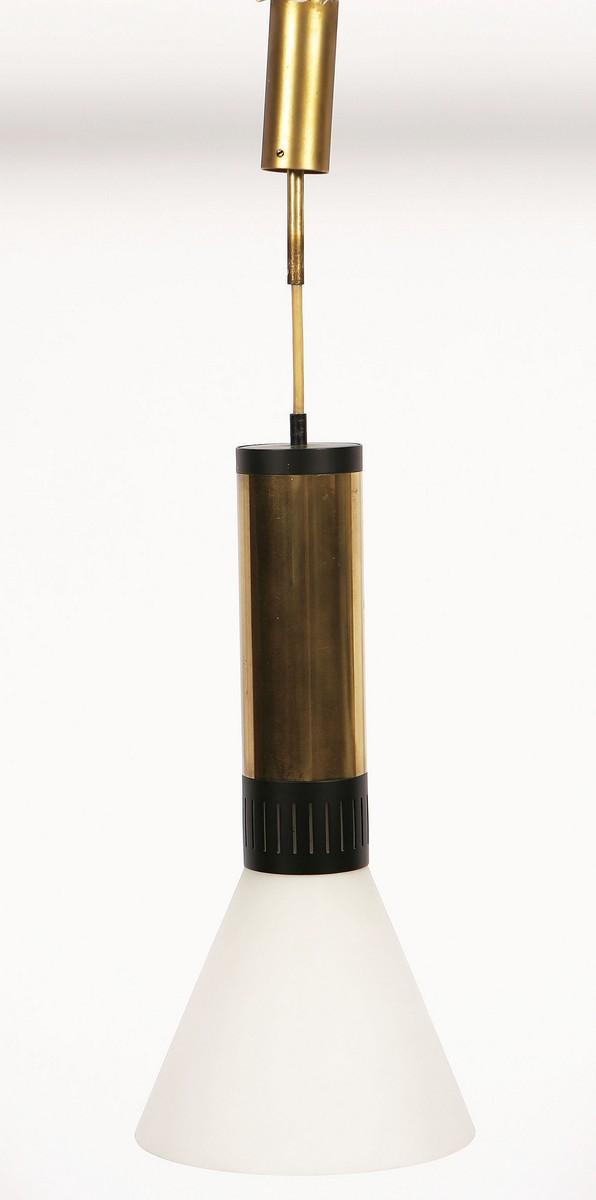 STILNOVO Sospensione a una luce. Metallo e vetro. Cm 20,00 x 44,00. Anni '50. Etichetta Stilnovo.