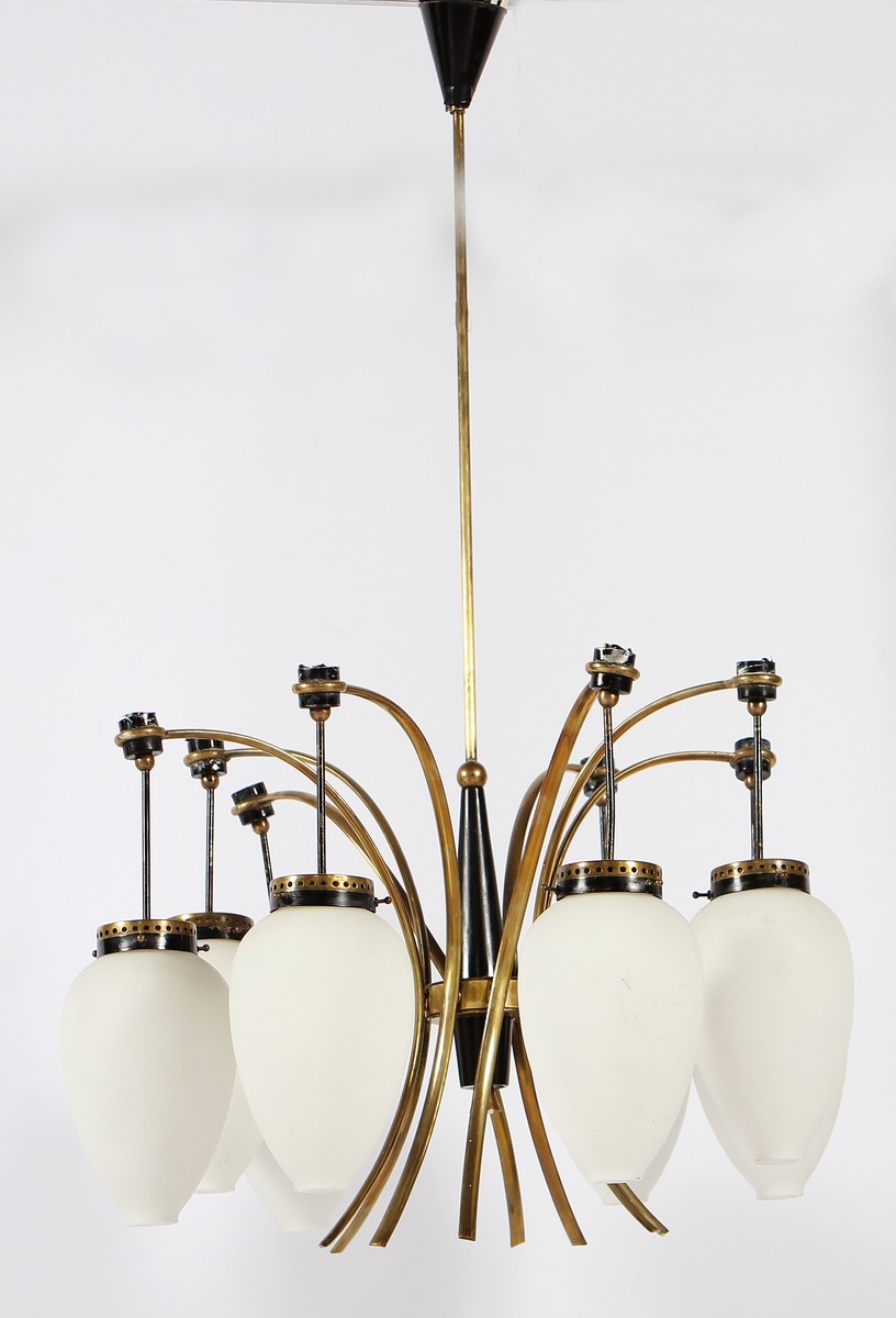 STILNOVO Lampadario. Metallo e vetro. Cm 56,00 x 100,00. Anni '50.