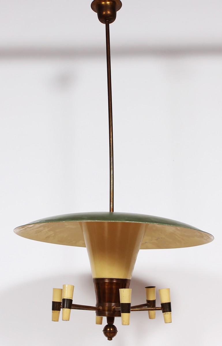 BIANCARDI & JORDAN Lampadario. Ottone e metallo laccato. Cm 63,00 x 111,00. Anni '50.