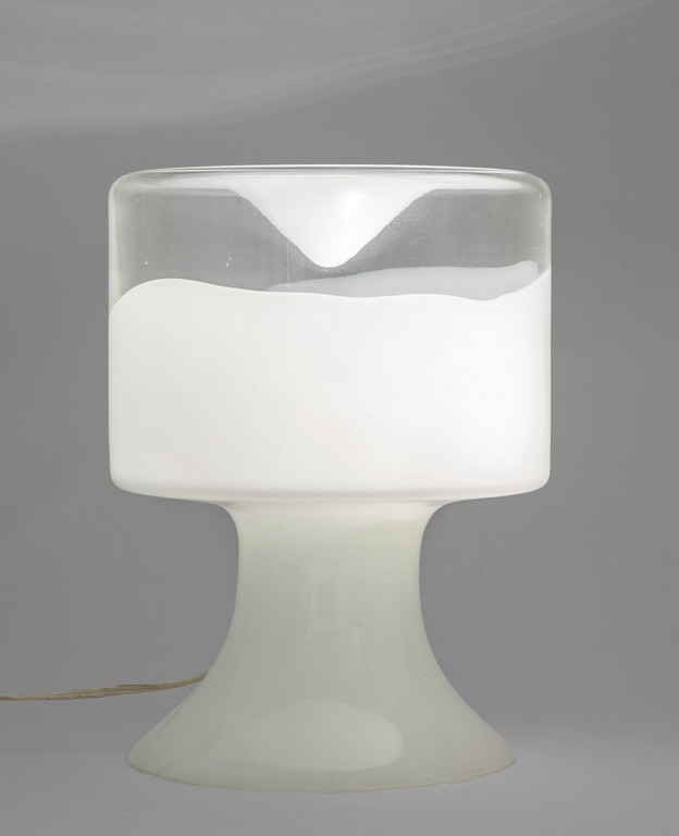 Una lampada da tavolo in cristallo e vetro lattimo.