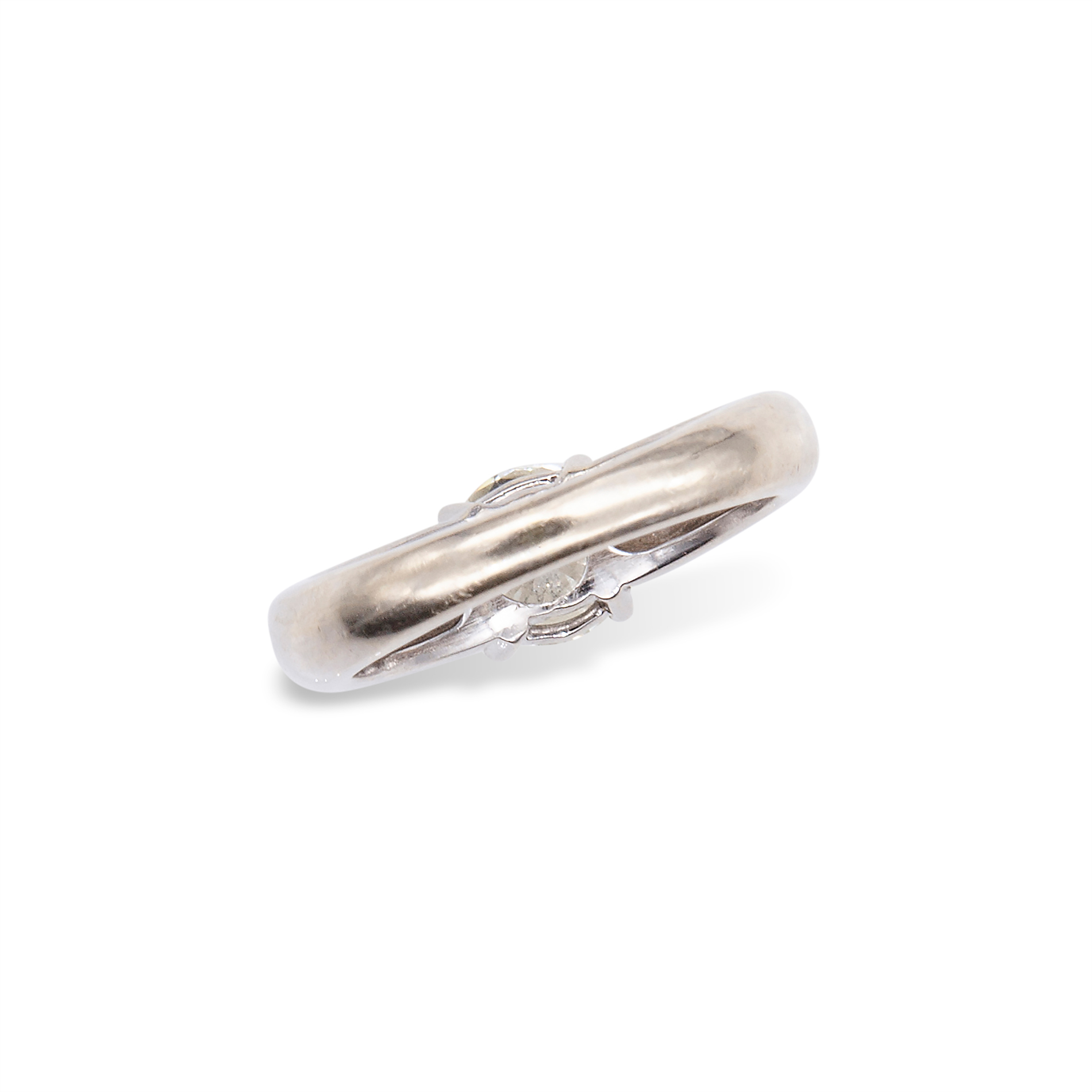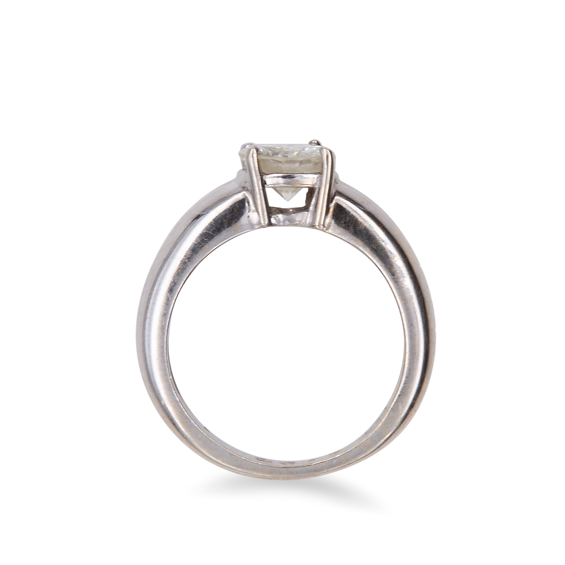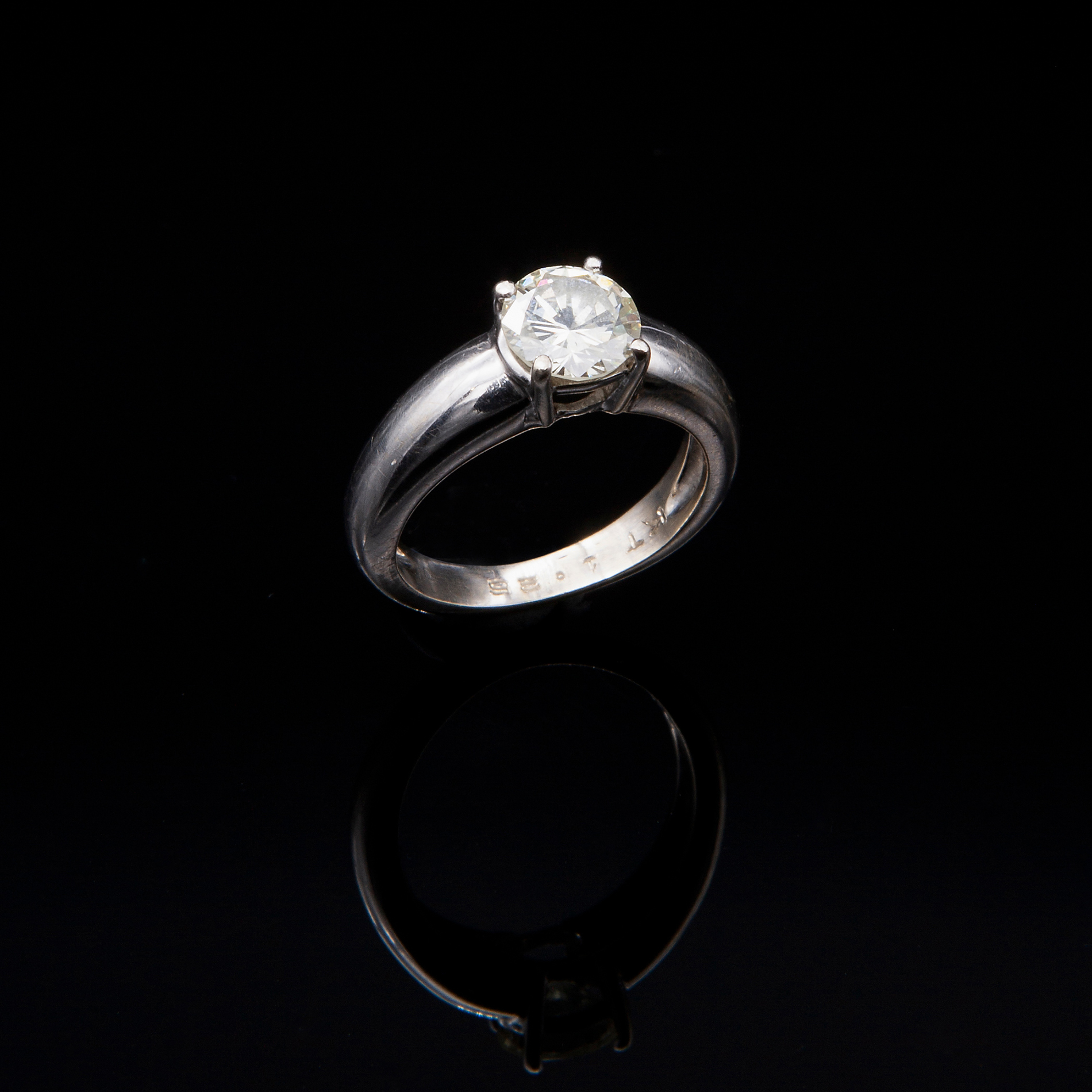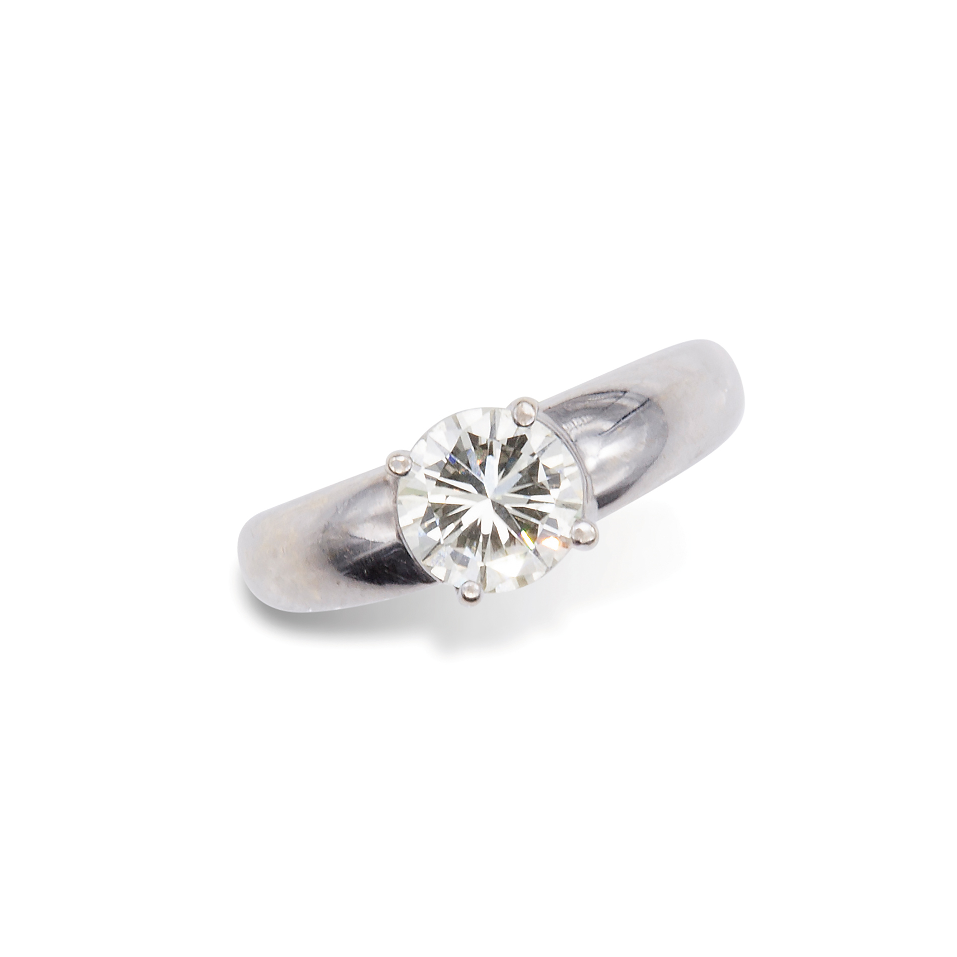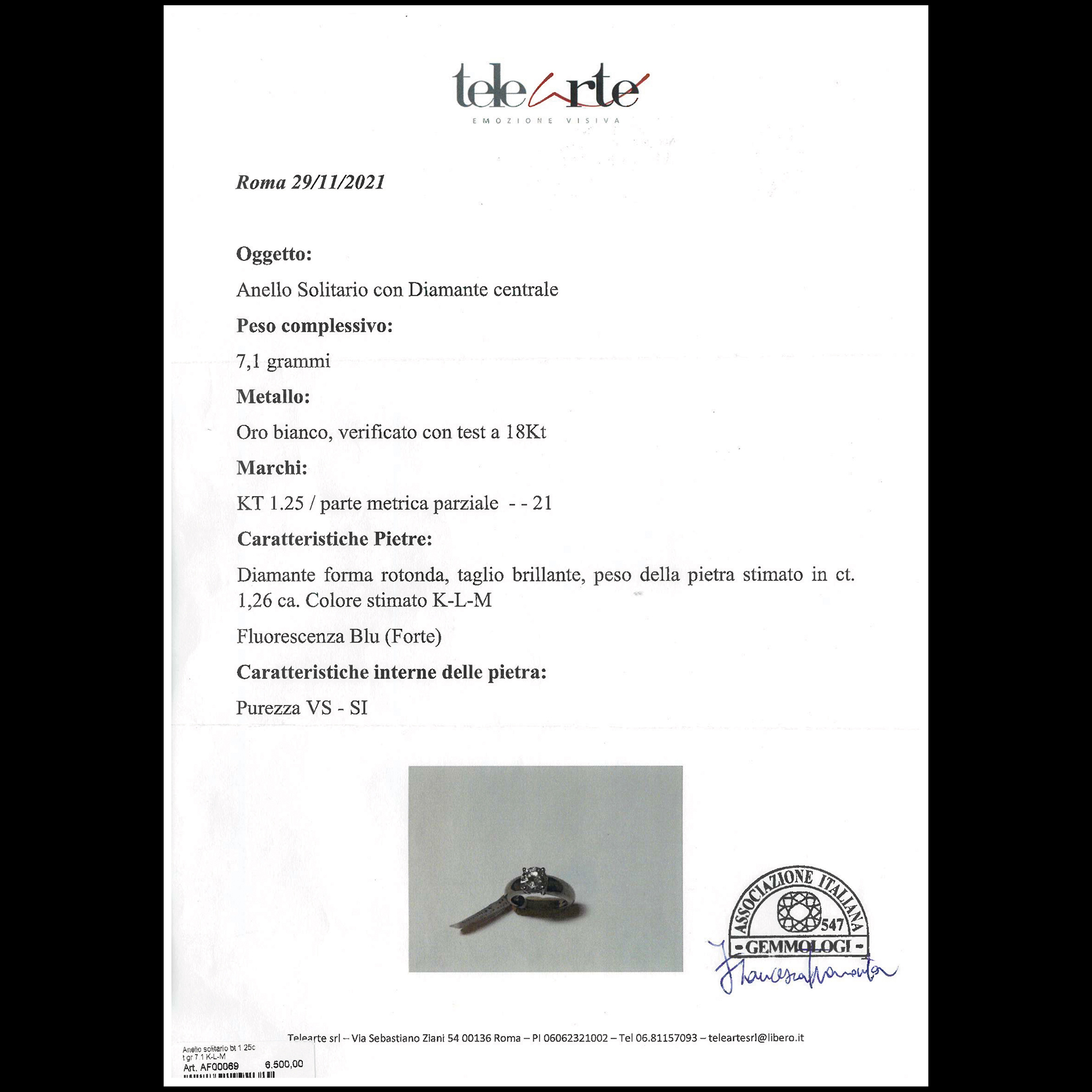 Anello solitario in oro bianco con diamante centrale Diamante di forma rotonda taglio brillante di circa 1,26 ct. Peso complessivo gr. 7,1, misura 13