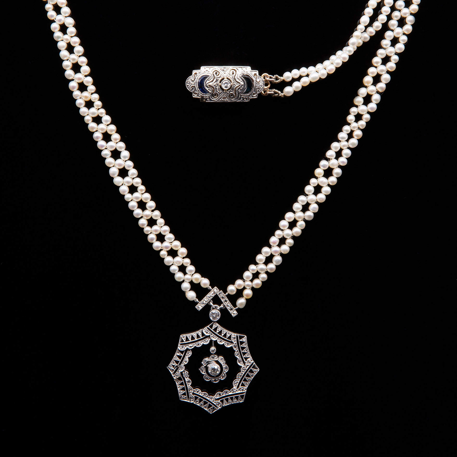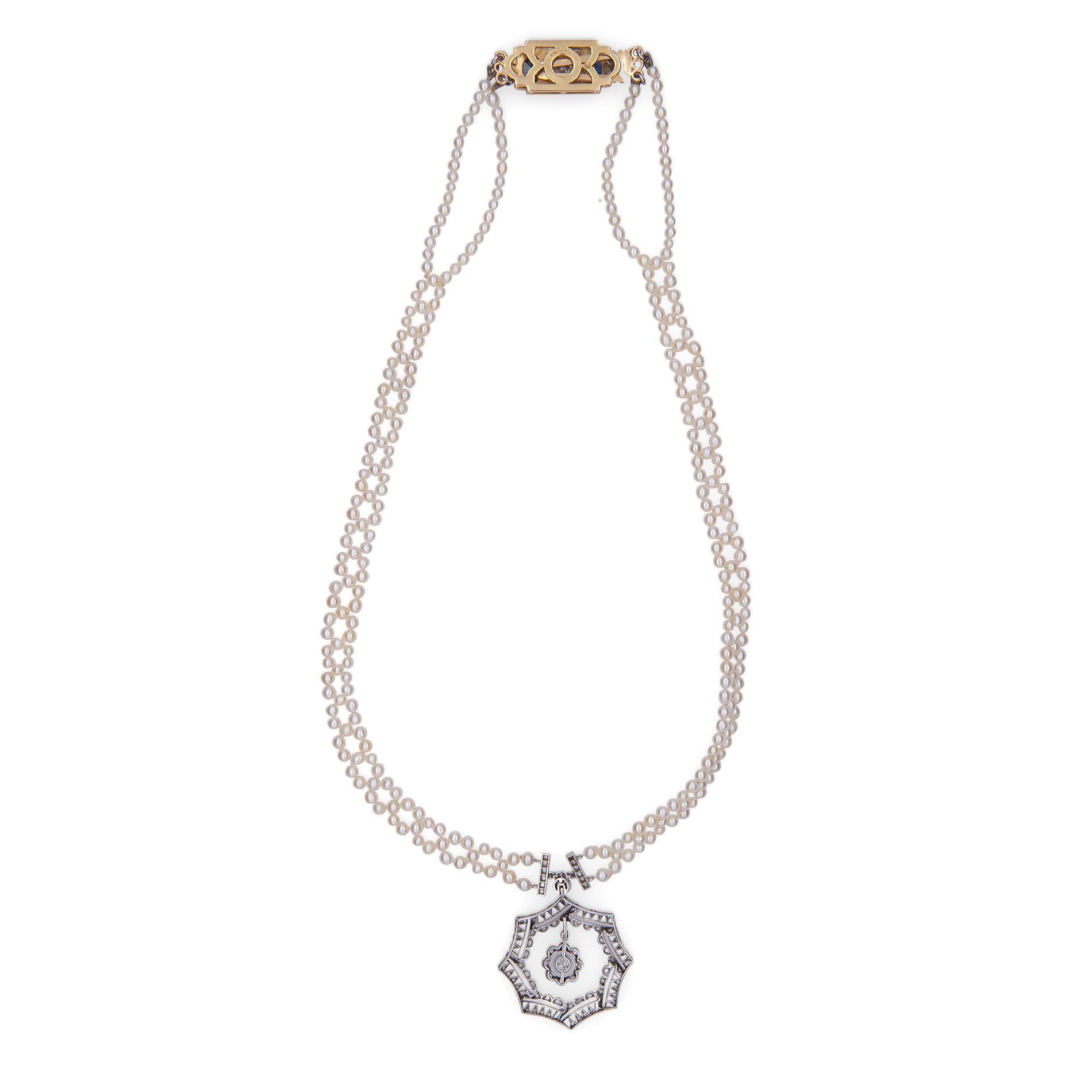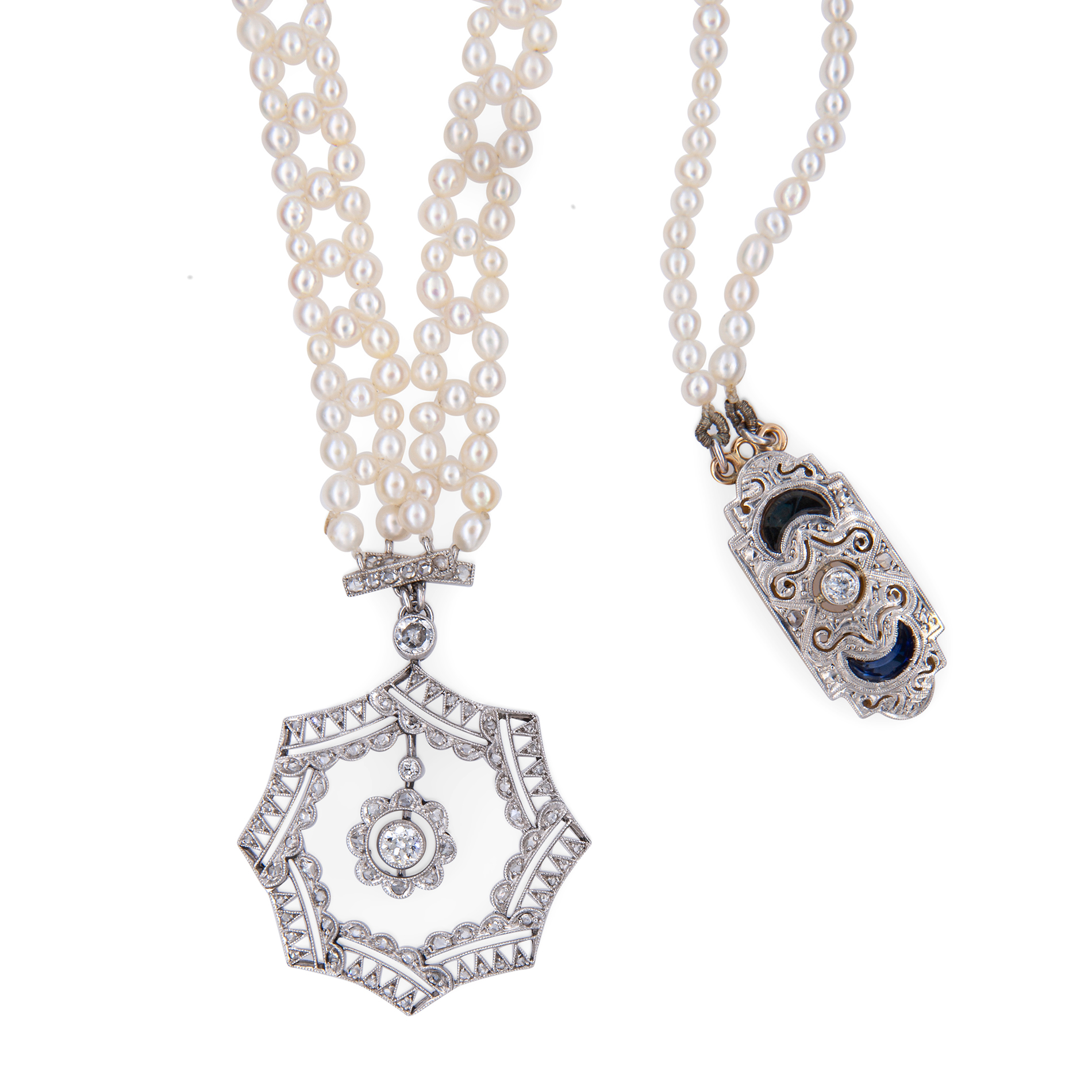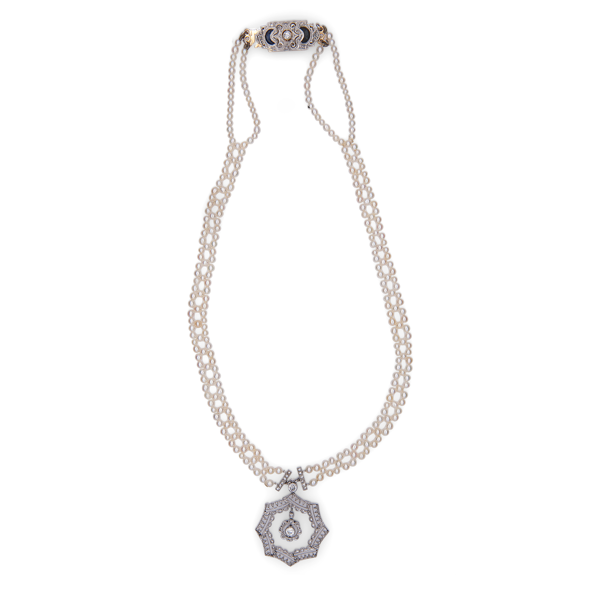 Girocollo con pendente in oro bianco, diamanti, due fili di perle e zaffiri Oro bianco 18 kt, con due fili di perle coltivate, con chiusura in oro bianco e giallo incisa, decorata da 3 diamanti e 2 zaffiri. 87 diamanti, taglio a brillante antico e a ros