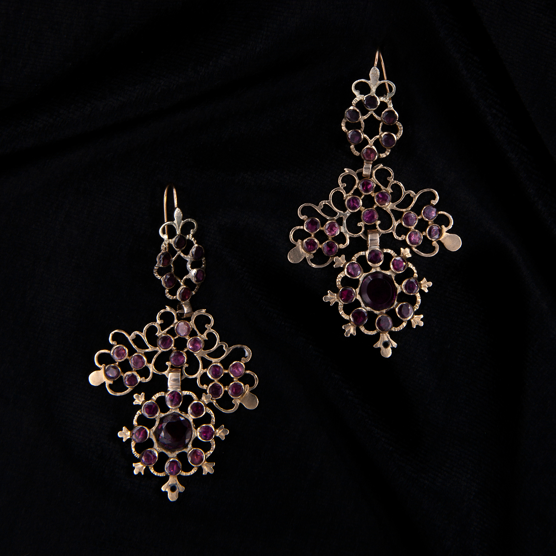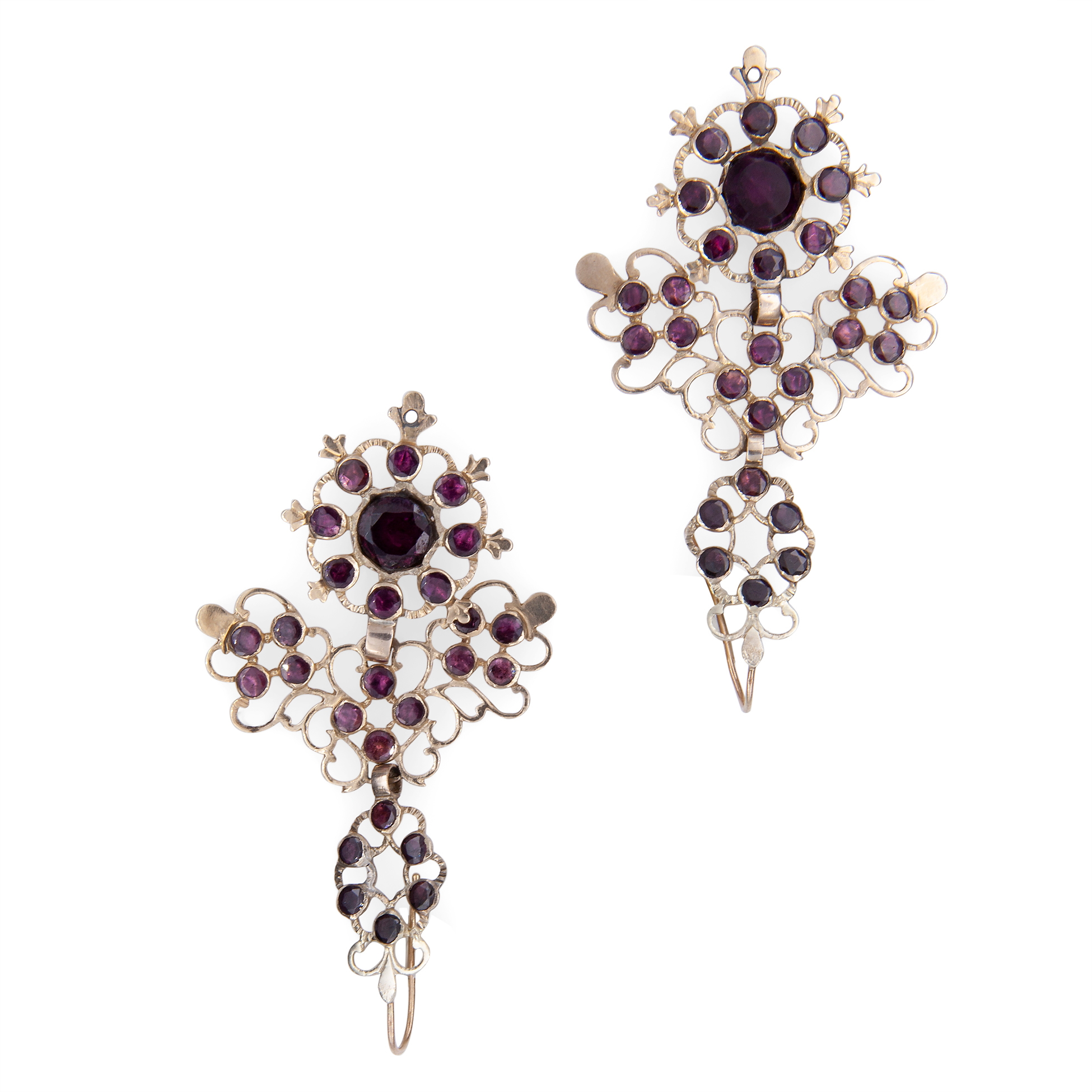 Coppia di orecchini pendenti in oro giallo e granati, antica manifattura siciliana del XVII secolo Oro giallo 14 kt, 54 granati rotondi di taglio composito. Peso complessivo gr. 14,90