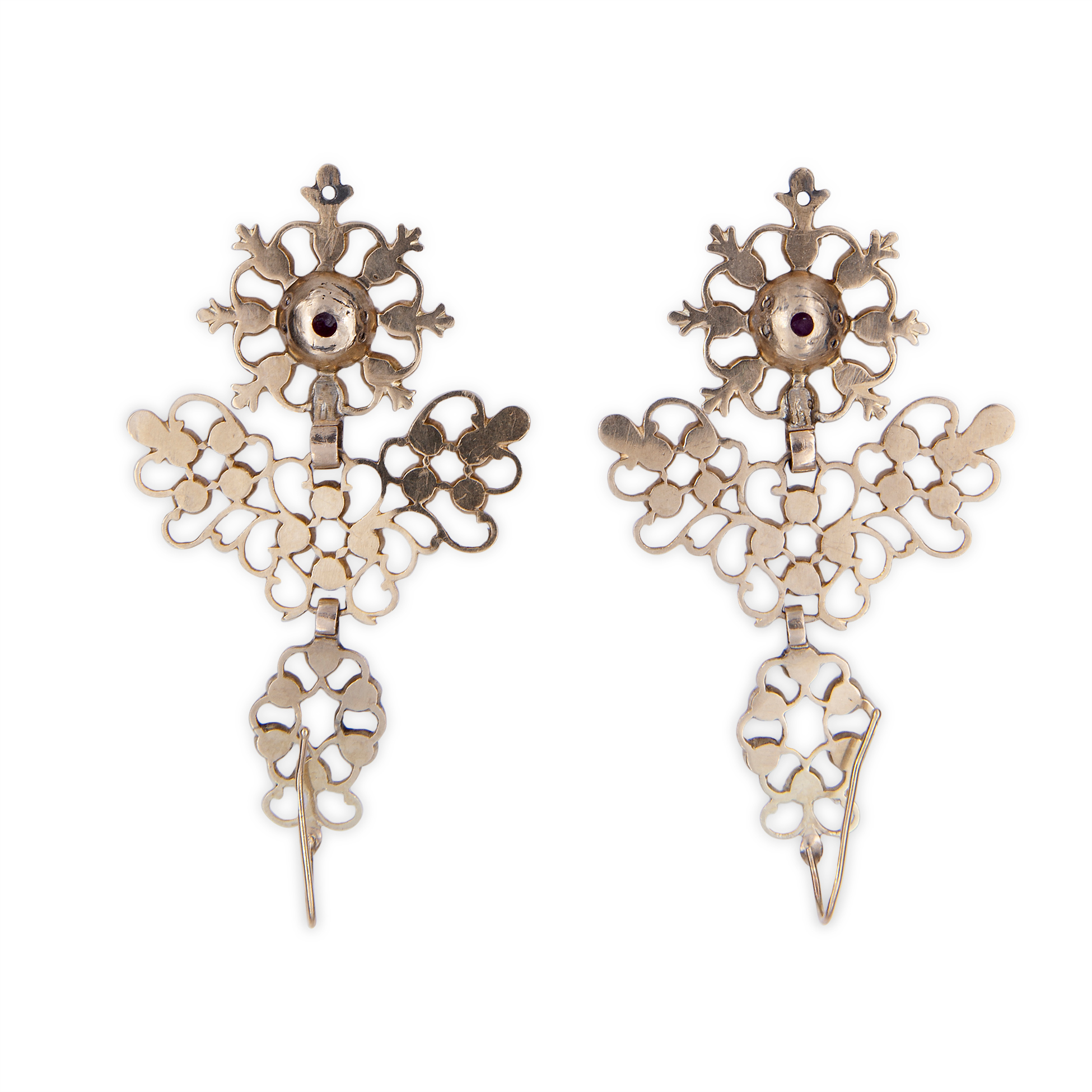 Coppia di orecchini pendenti in oro giallo e granati, antica manifattura siciliana del XVII secolo