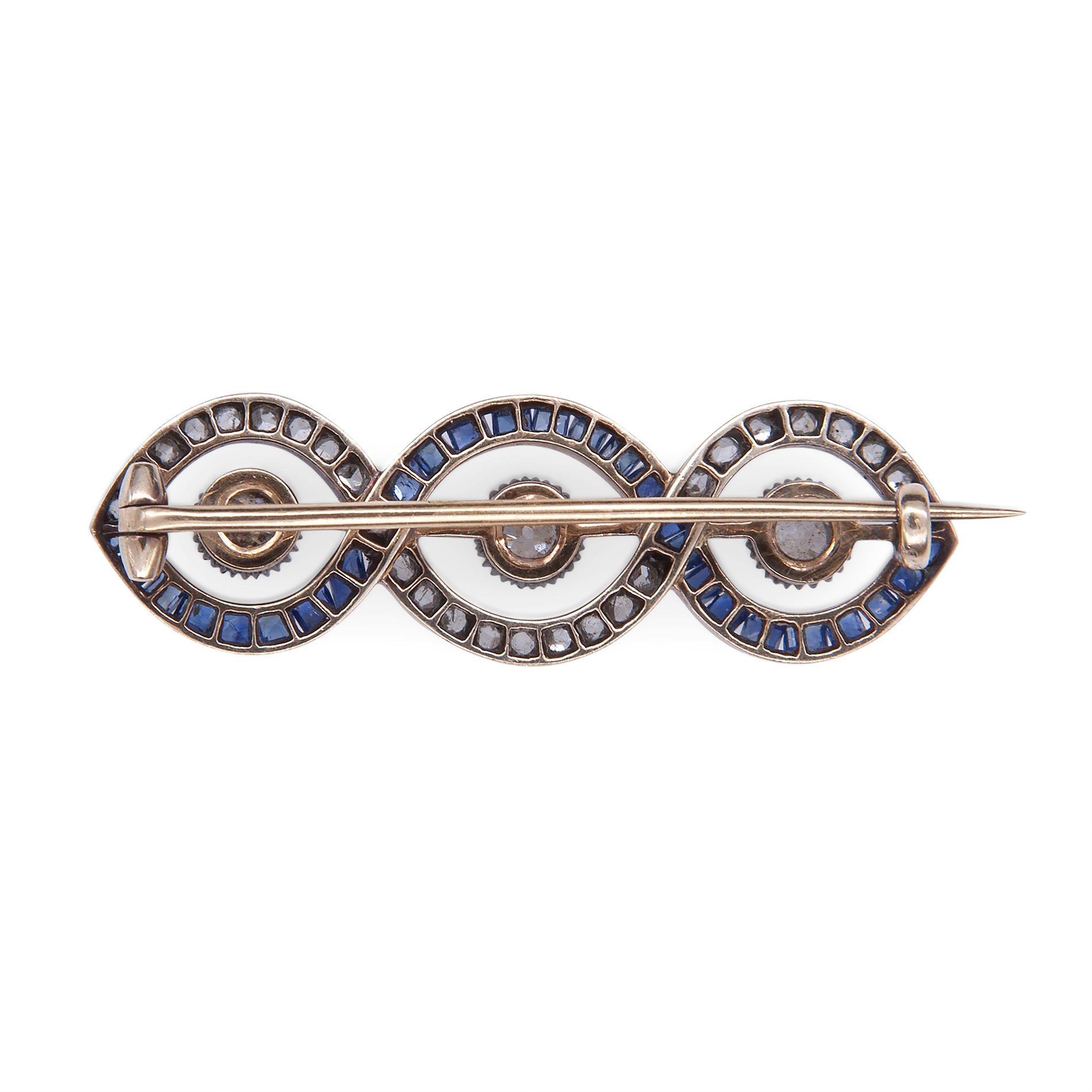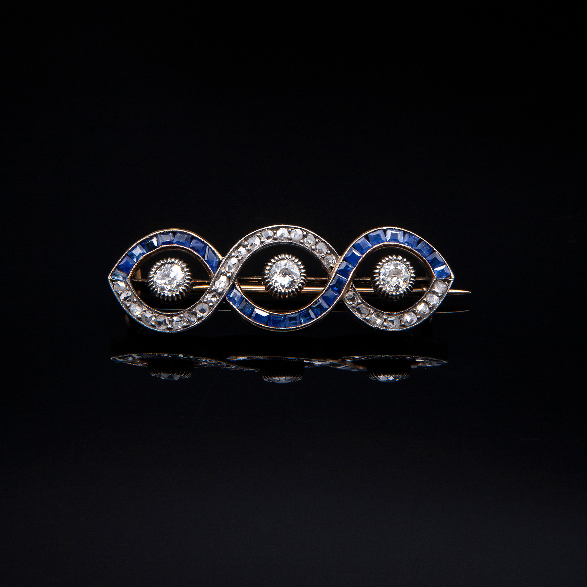 Spilla in oro giallo, argento diamanti e zaffiri Argento e oro giallo 18 kt, 30 diamanti rotondi taglio brillante antico e a rosa, peso totale stimato 1,20 ct; 26 zaffiri quadrati taglio carrè, peso totale stimato ct 2,34. peso complessivo gr. 9,70