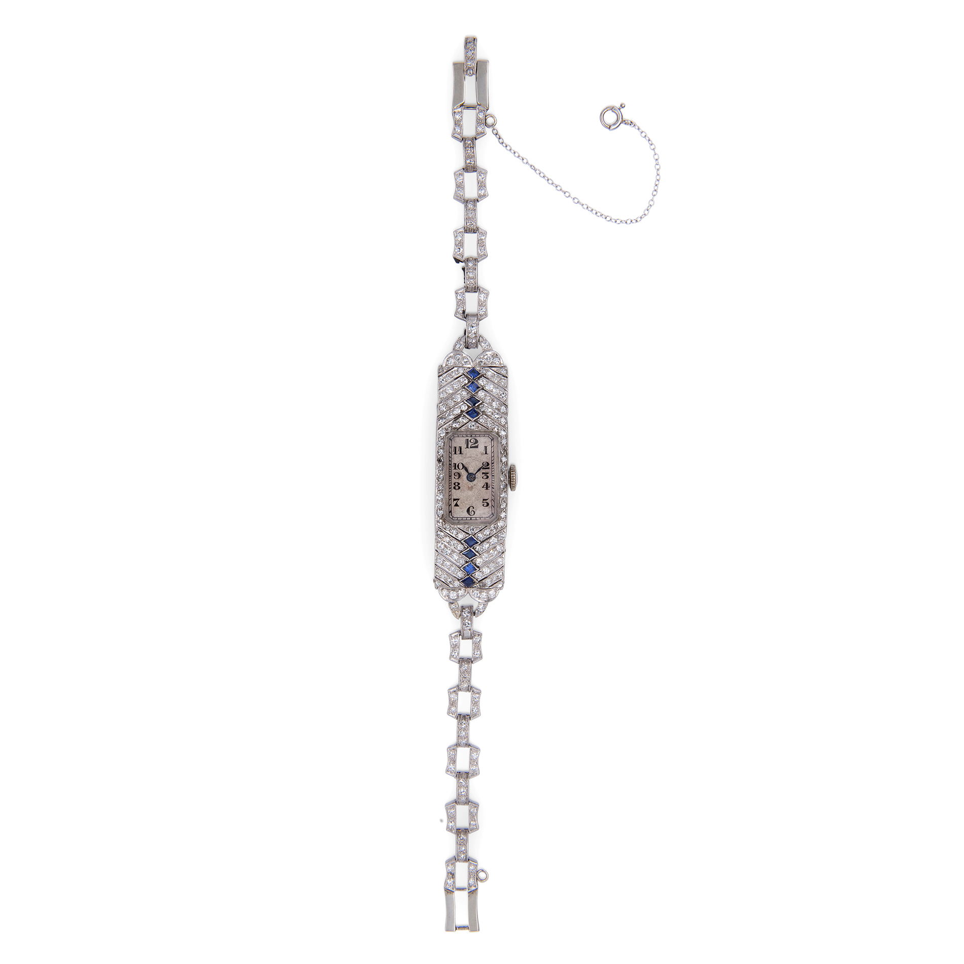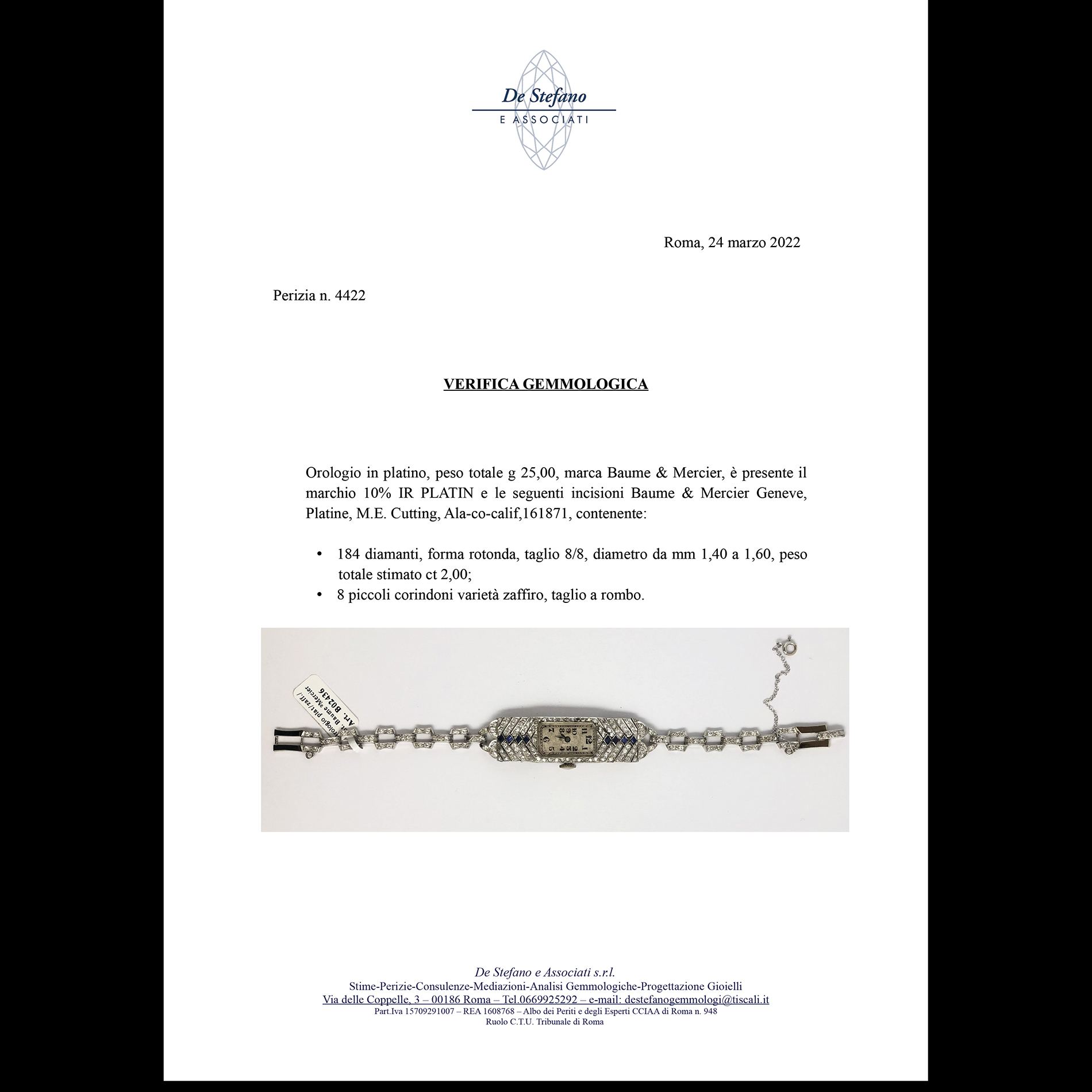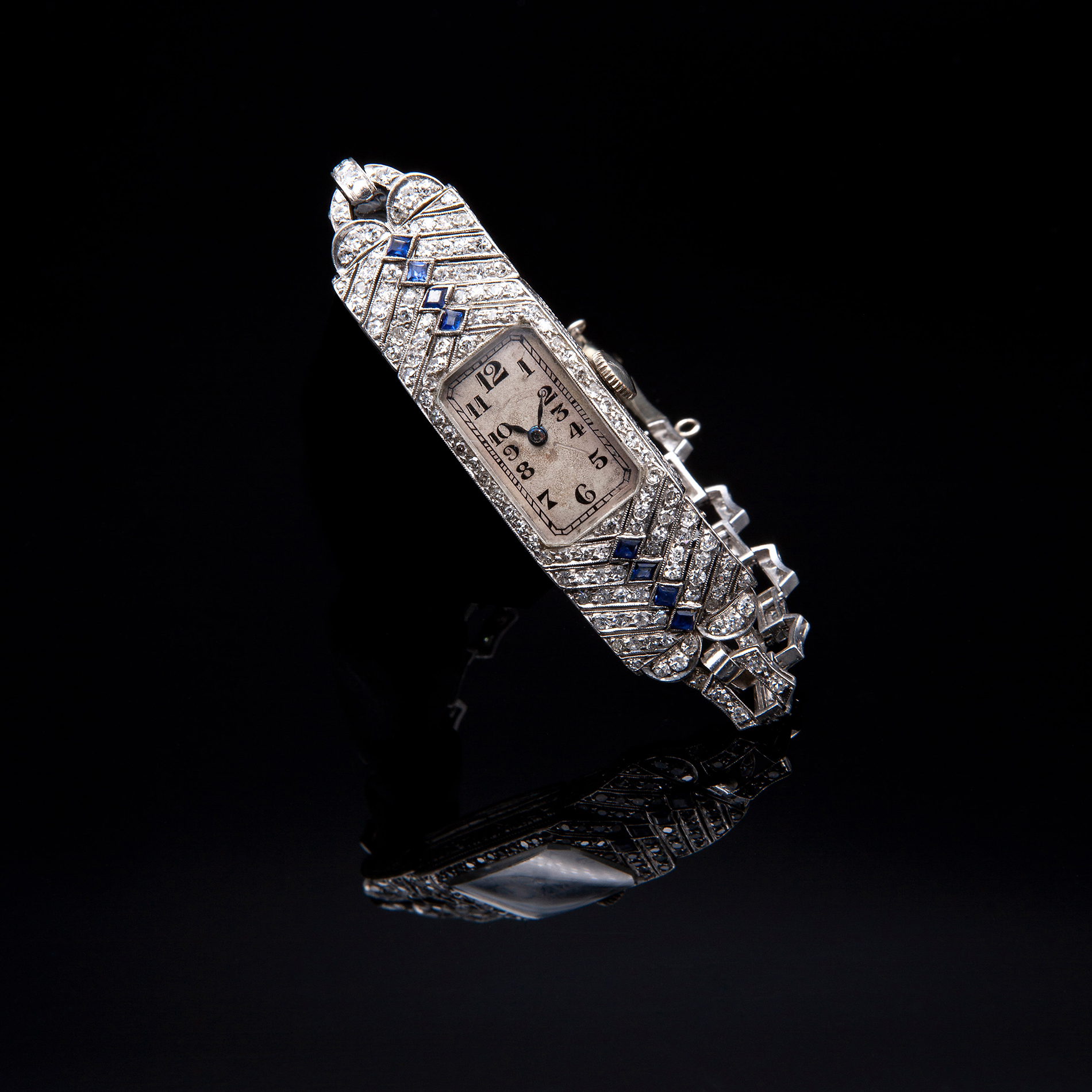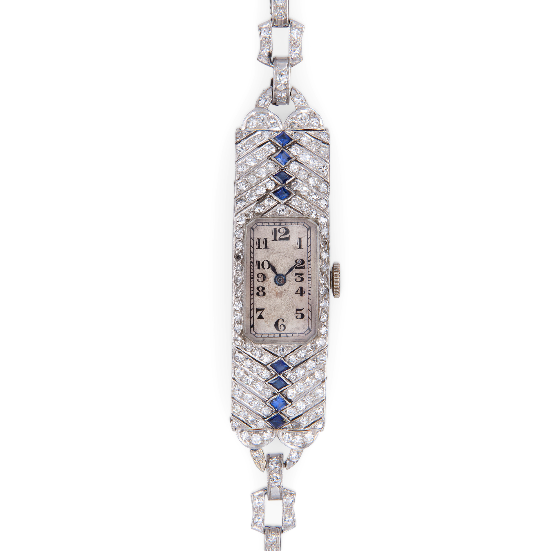 Orologio decò in platino, diamanti e zaffiri Baume & Mercier Decorato da 184 diamanti rotondi taglio 8/8, peso totale stimato 2 ct e 8 piccoli zaffiri a rombo. Peso totale gr. 25, presente il marchio 10% IR PLATIN e le seguenti incisioni Baume & Mercier