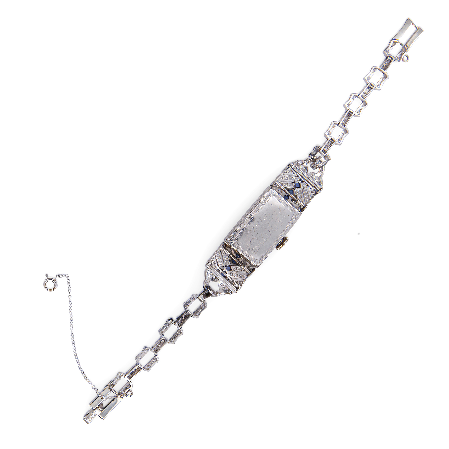 Orologio decò in platino, diamanti e zaffiri Baume & Mercier