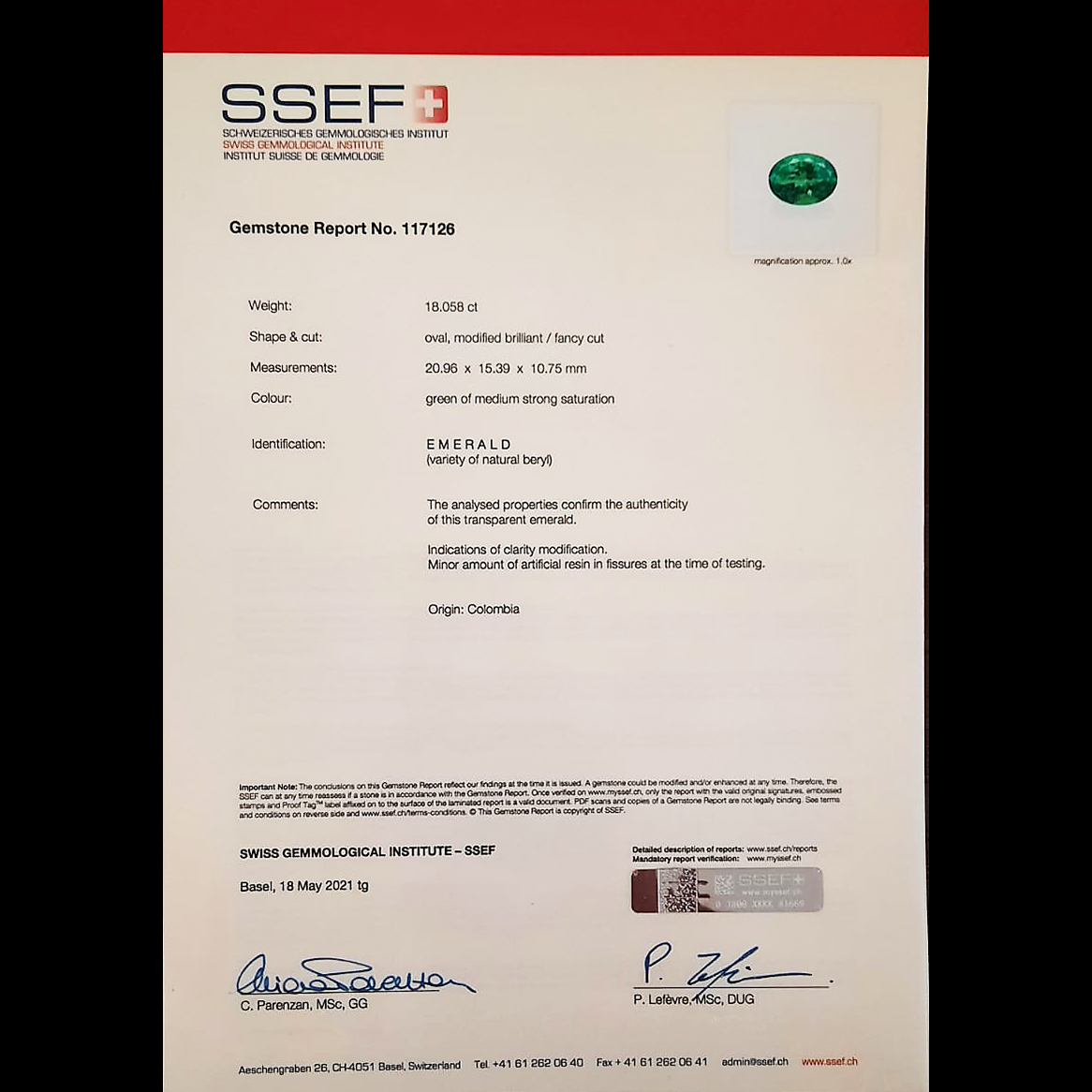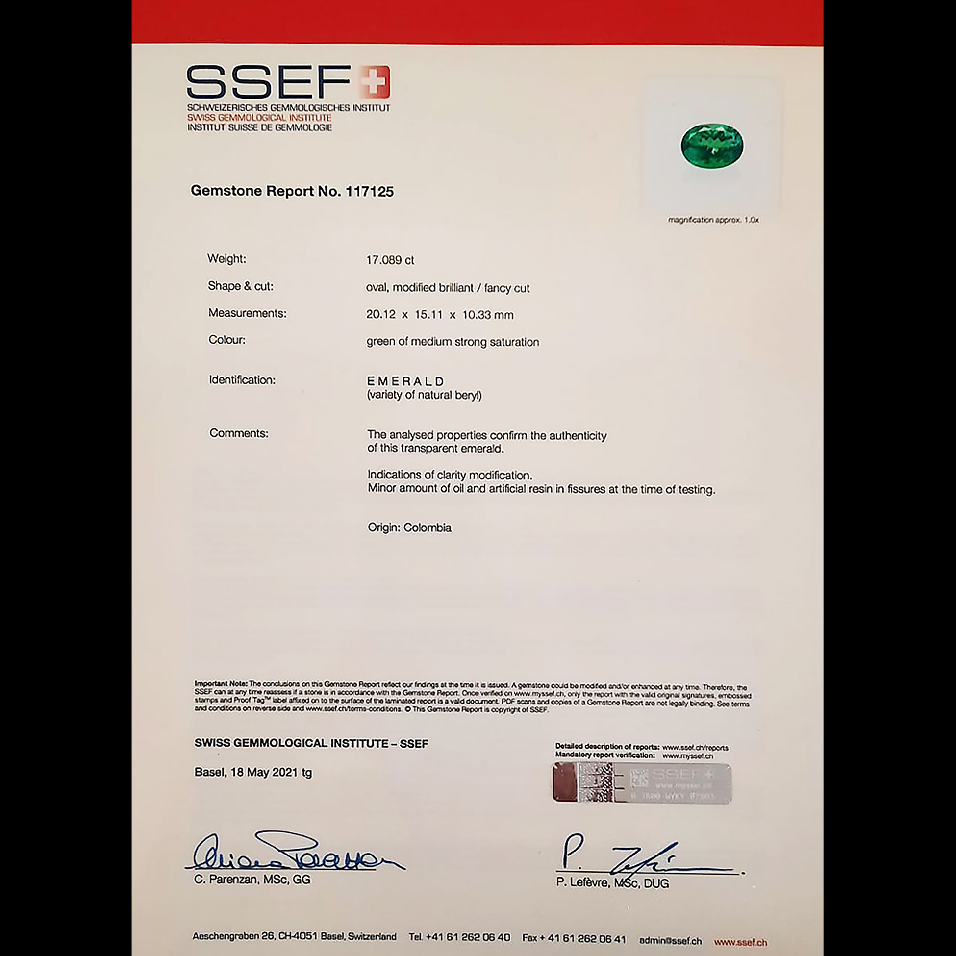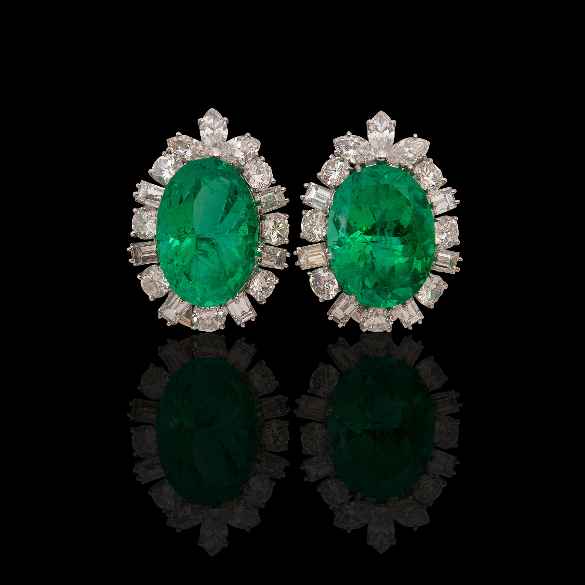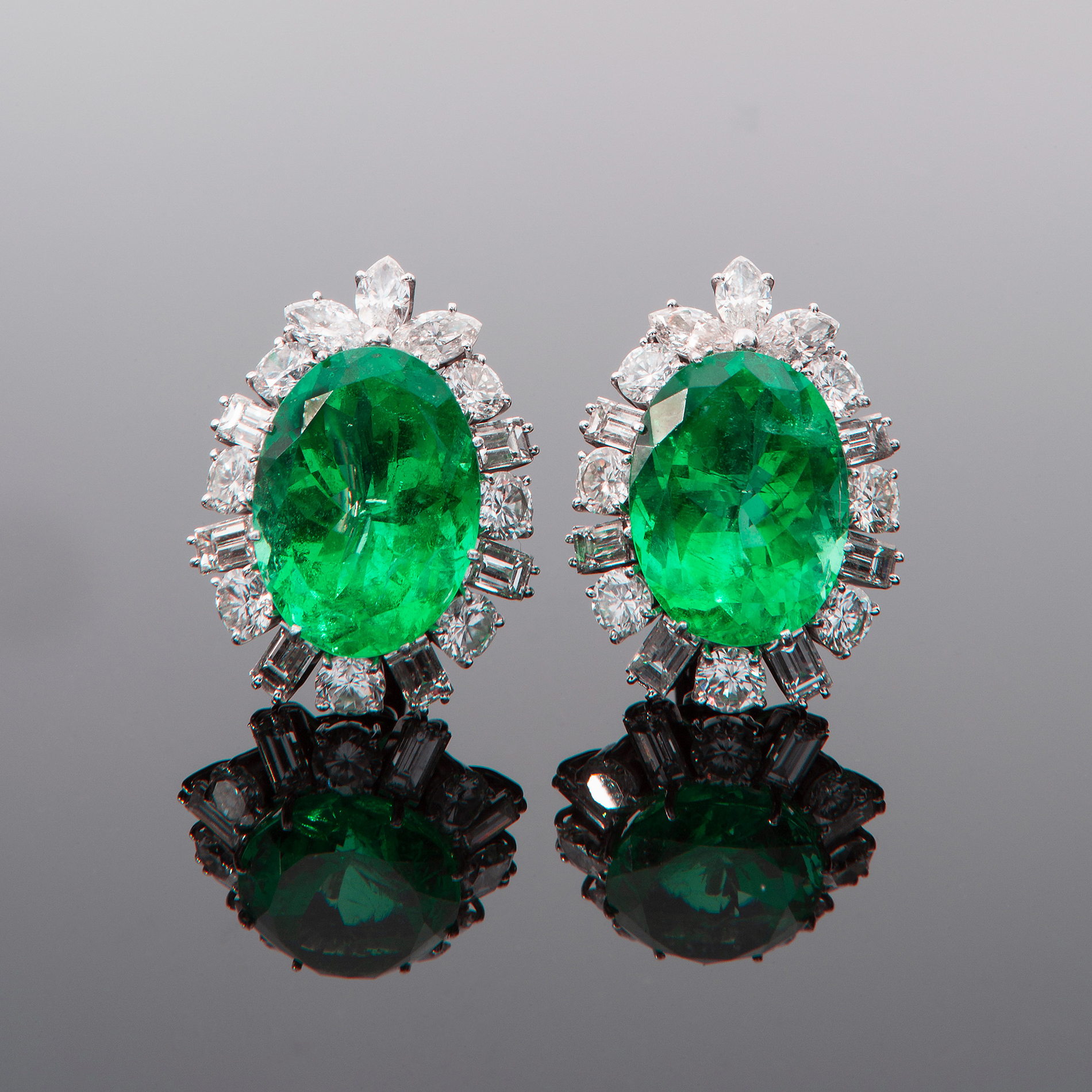 Eccezionale coppia di orecchini in oro bianco, diamanti e due grandi smeraldi colombiani Oro bianco 18 kt, 2 grandi smeraldi taglio ovale del peso - ciascuno - di 17 e 18 ct circa. Diamanti rotondi taglio brillante e baguette a contorno