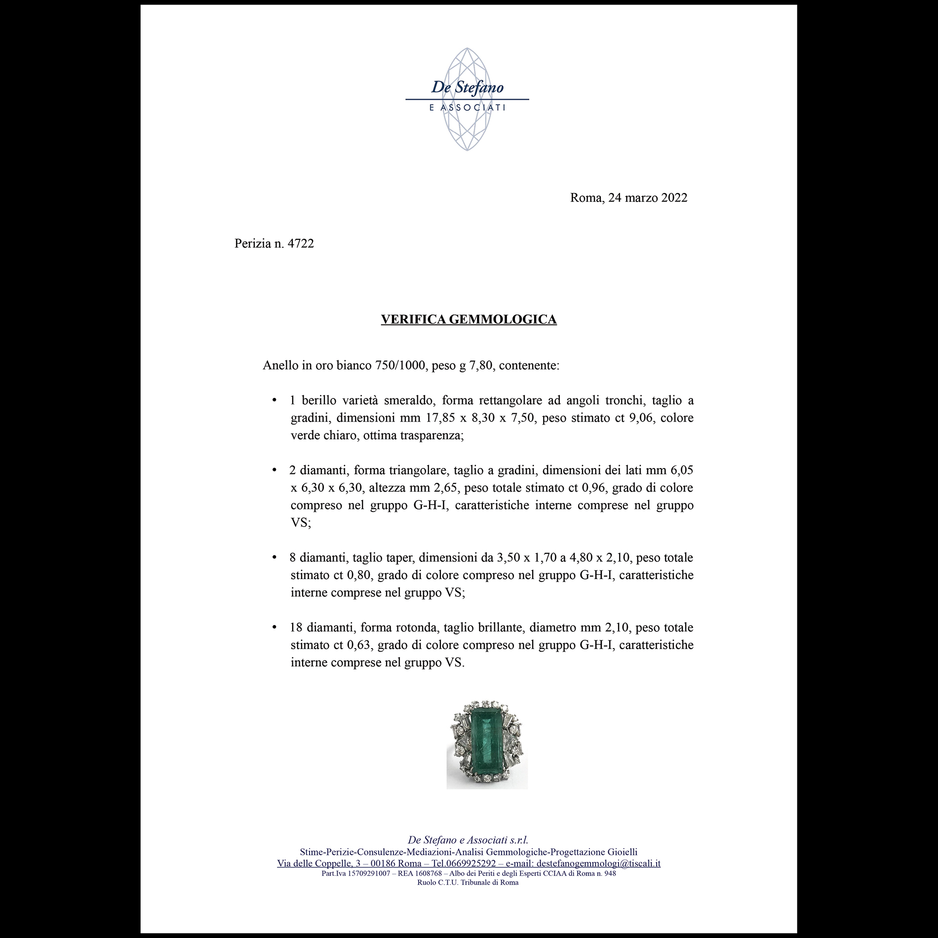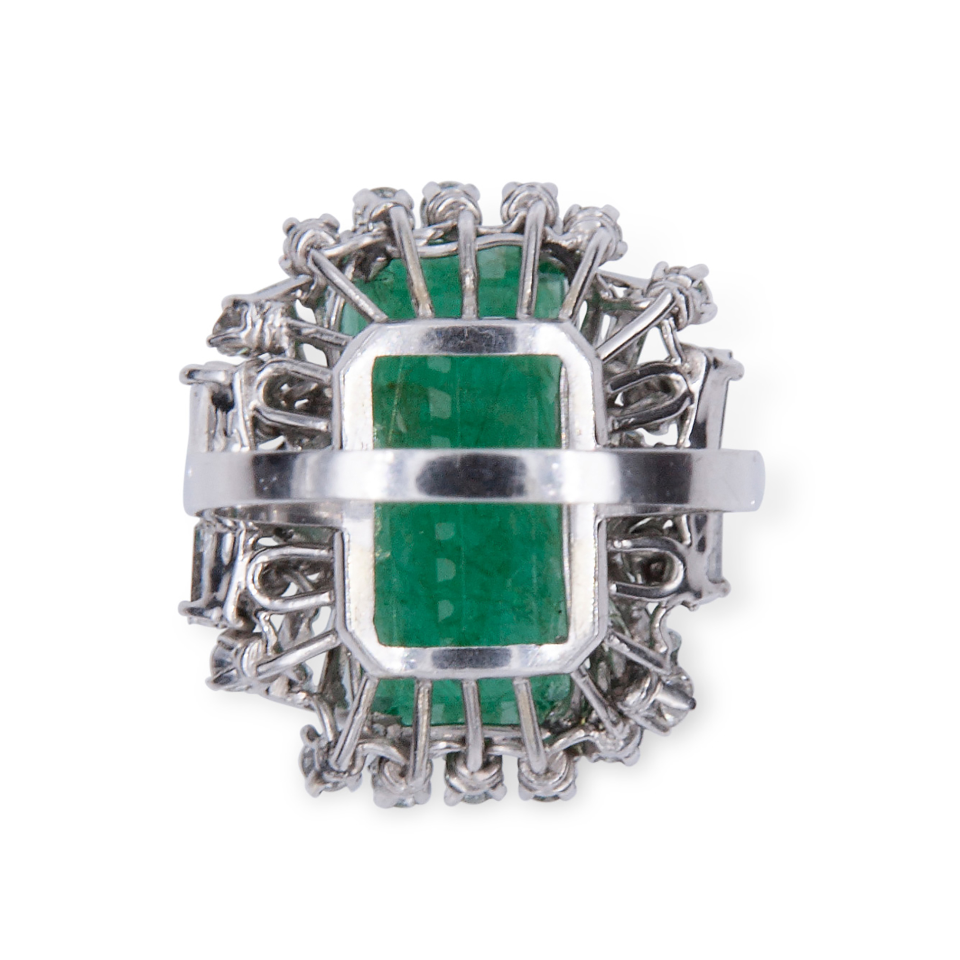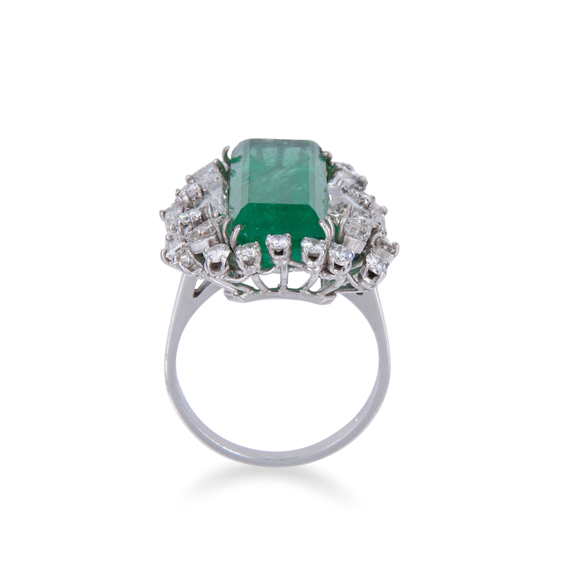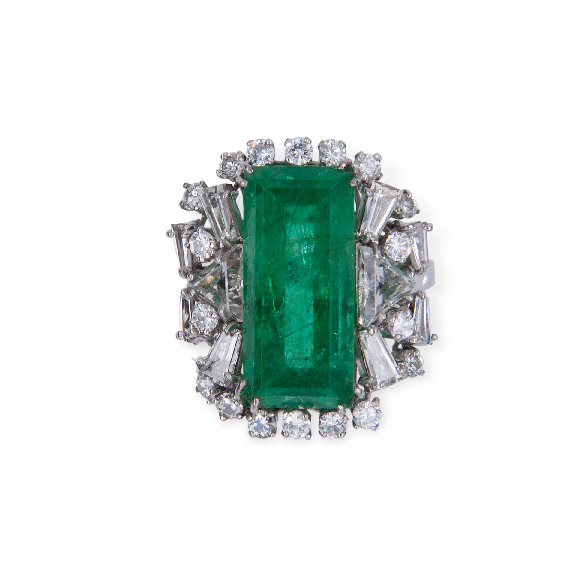 Anello in oro bianco, smeraldo e diamanti Oro bianco 18 kt, 1 smeraldo rettangolare ad angoli tronchi, taglio a gradini, peso stimato 9,06 ct. 28 diamanti triangolari taglio a gradini, rotondi taglio brillante e taglio taper per un peso stimato totale d