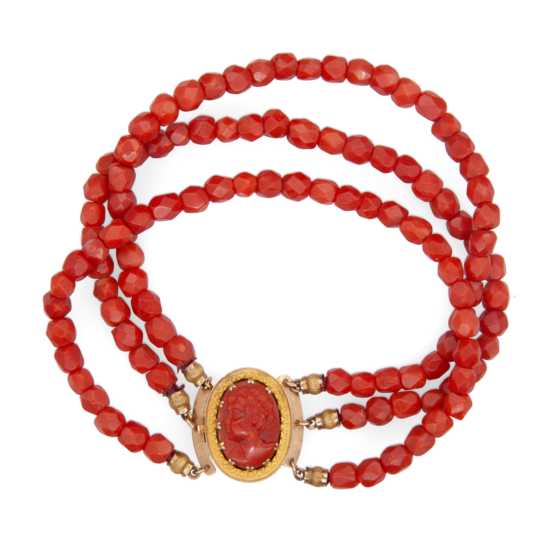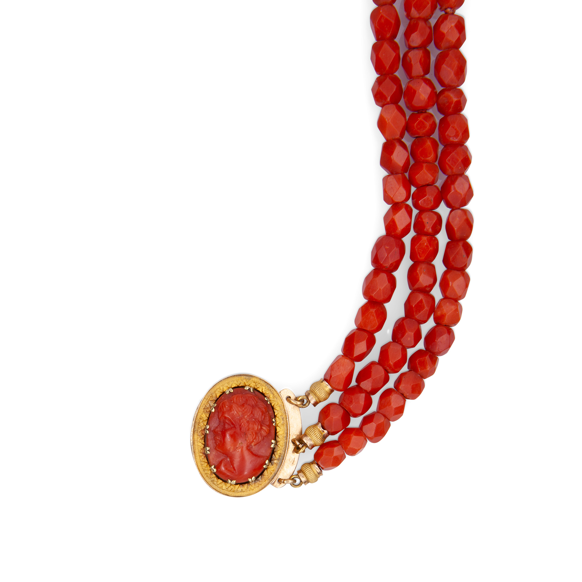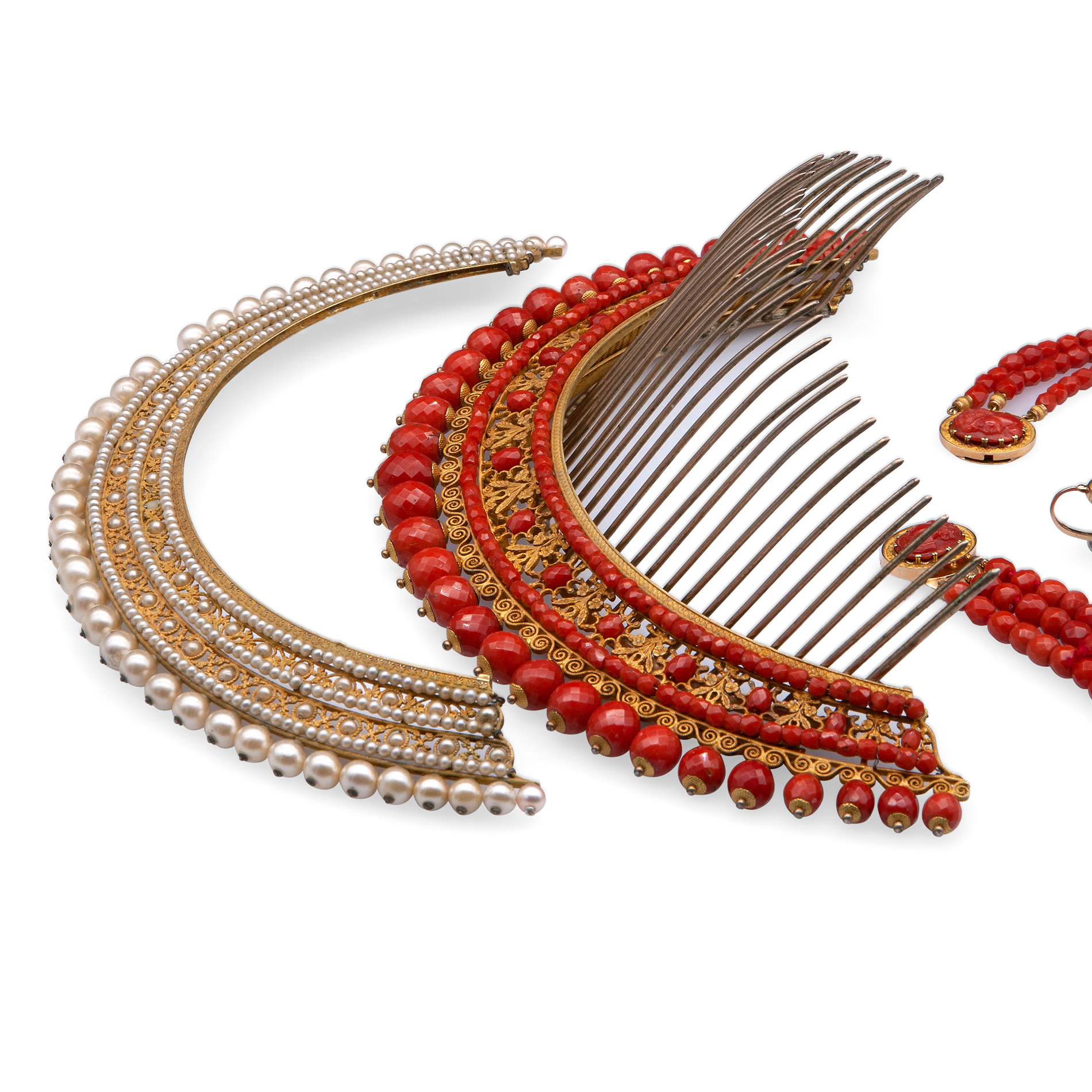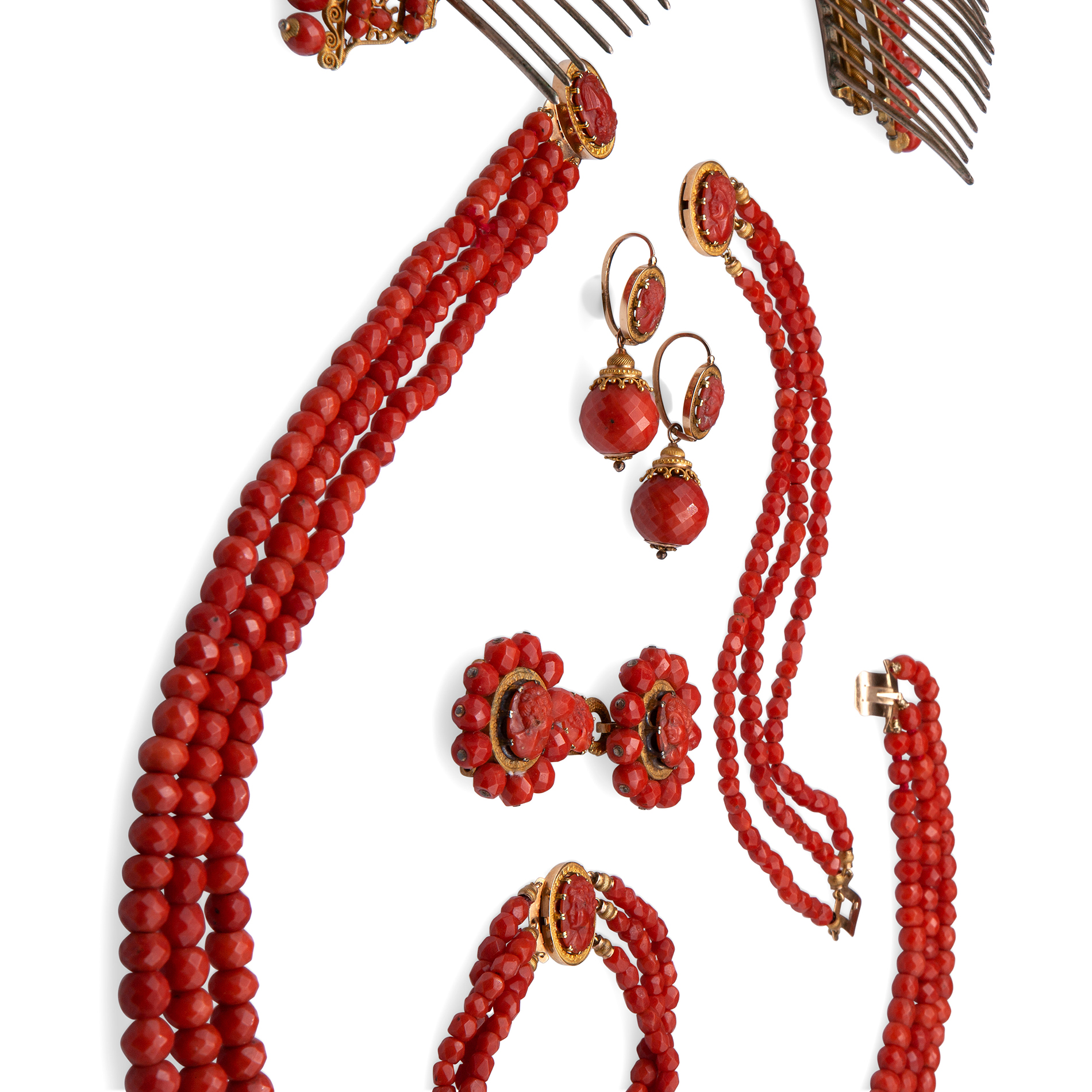 Lot 100 | Grande parure napoleonica in corallo mediterraneo, oro e perle