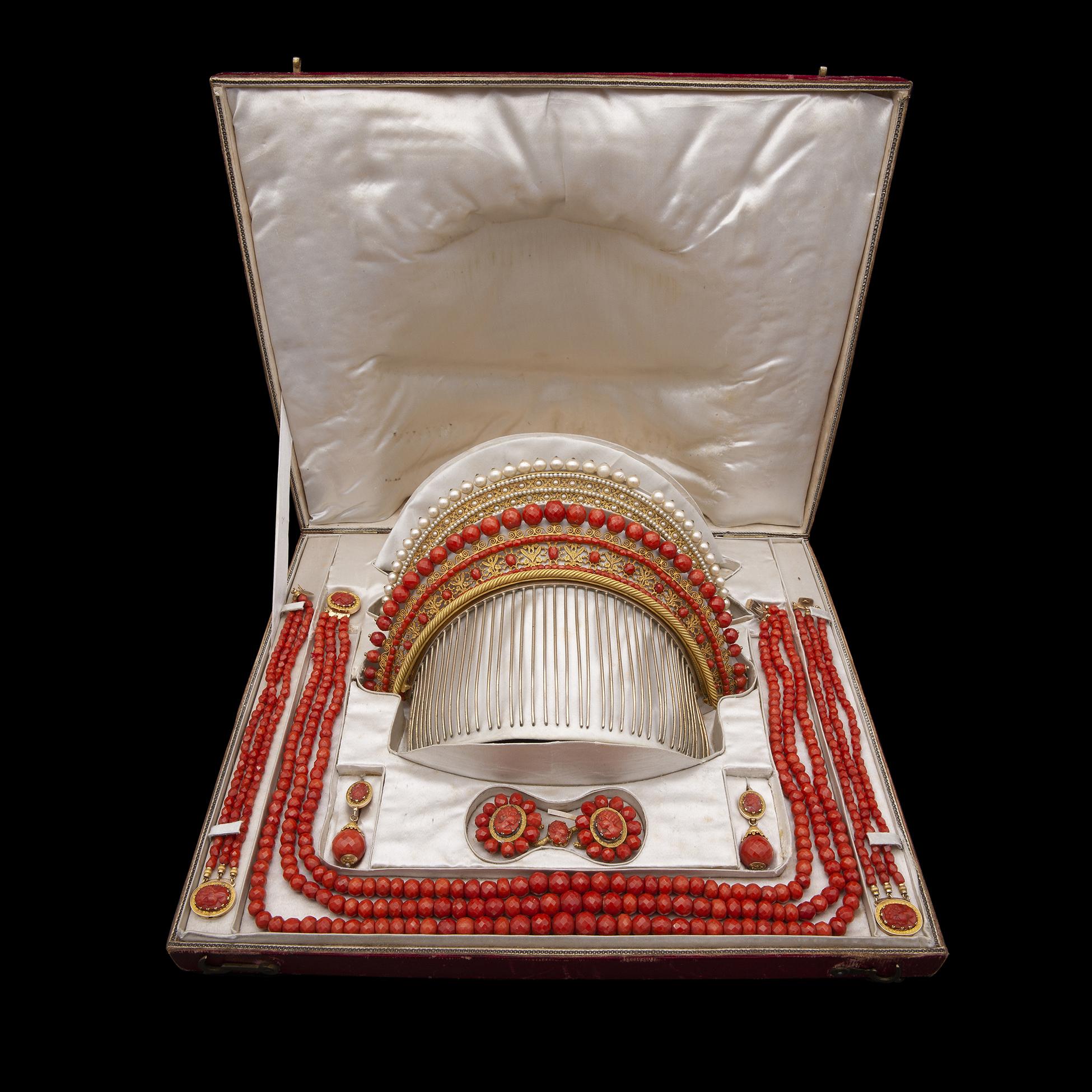 Grande parure napoleonica in corallo mediterraneo, oro e perle