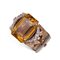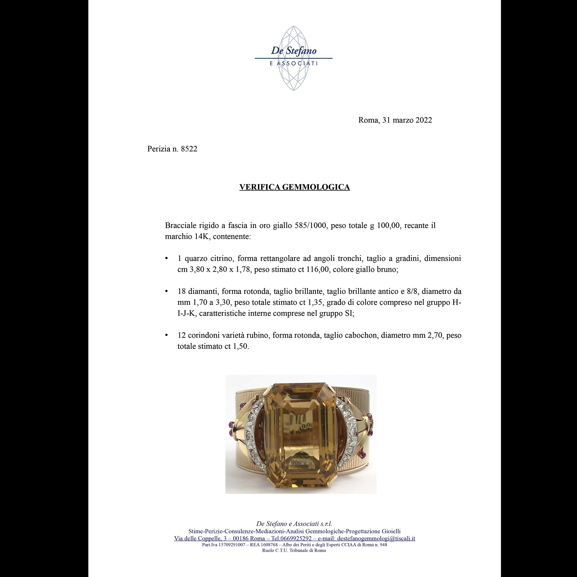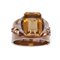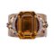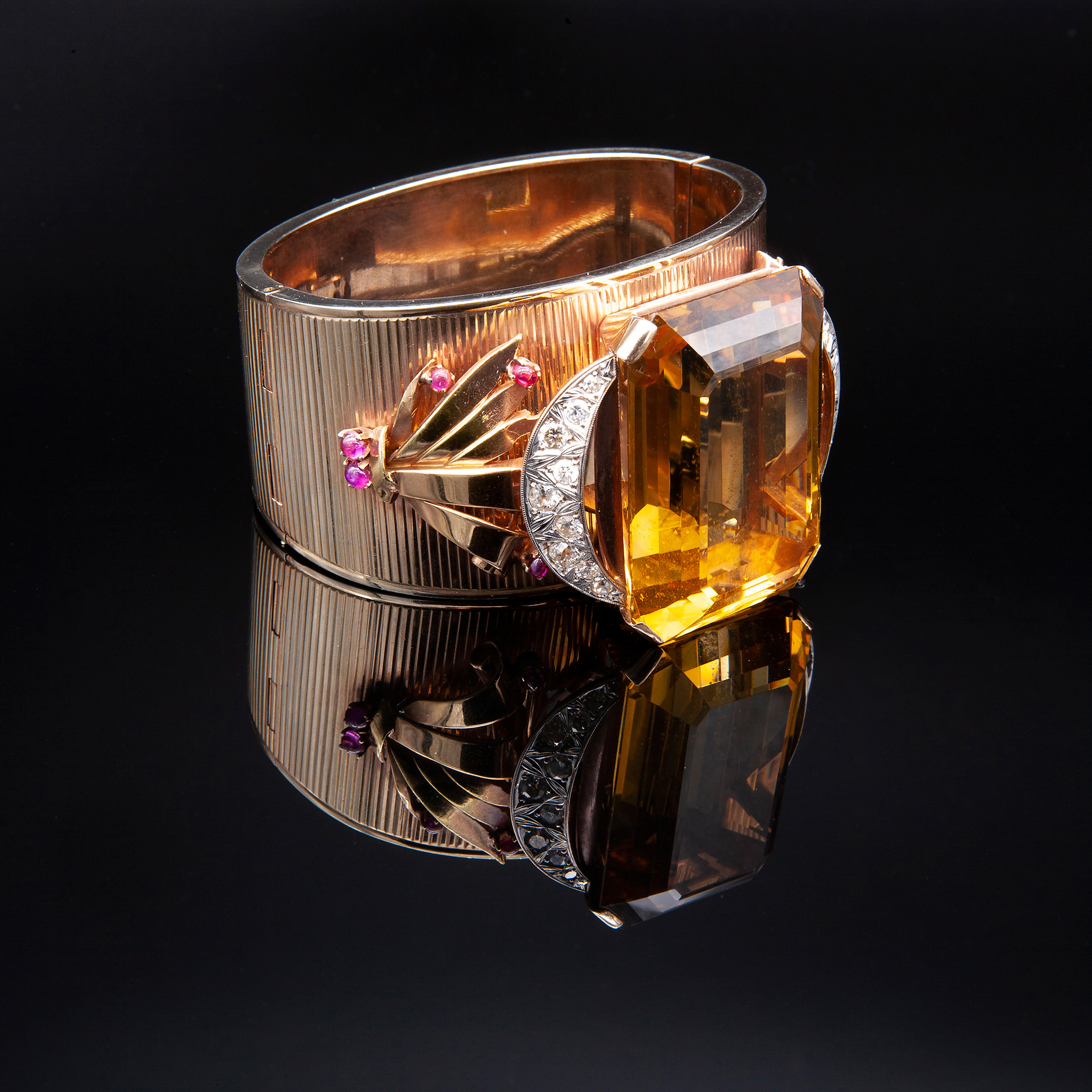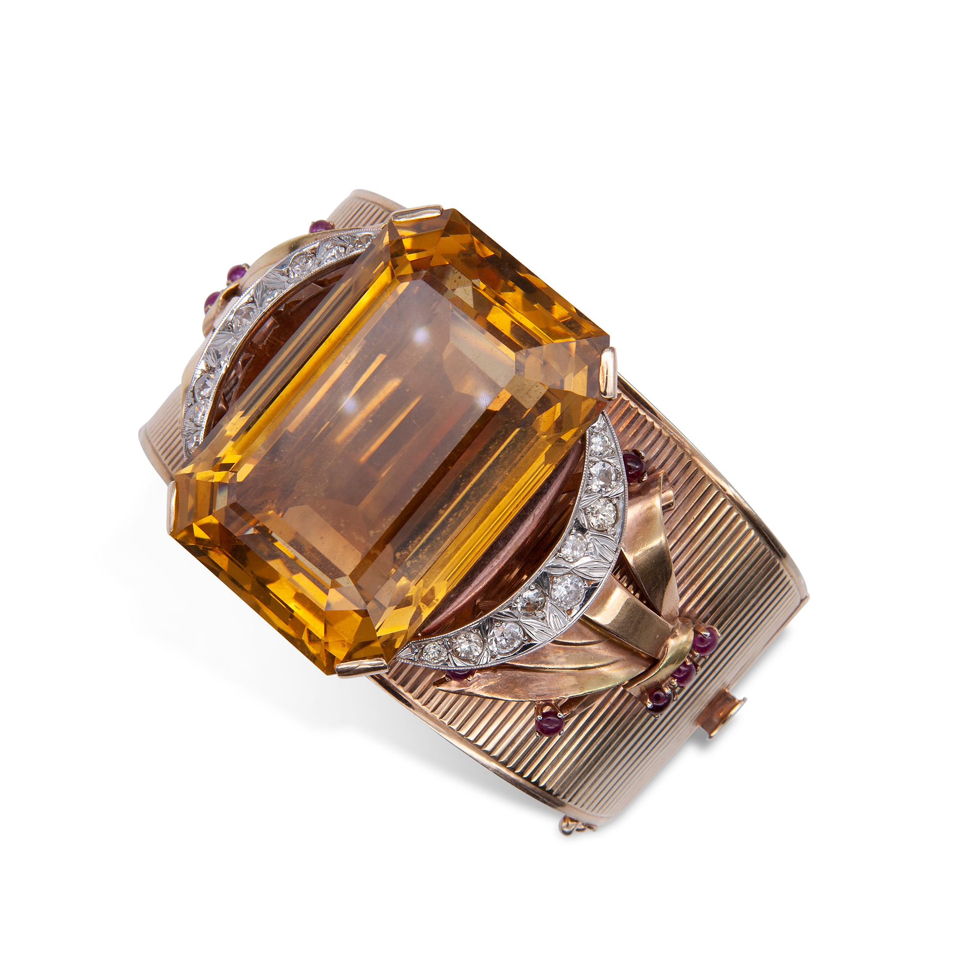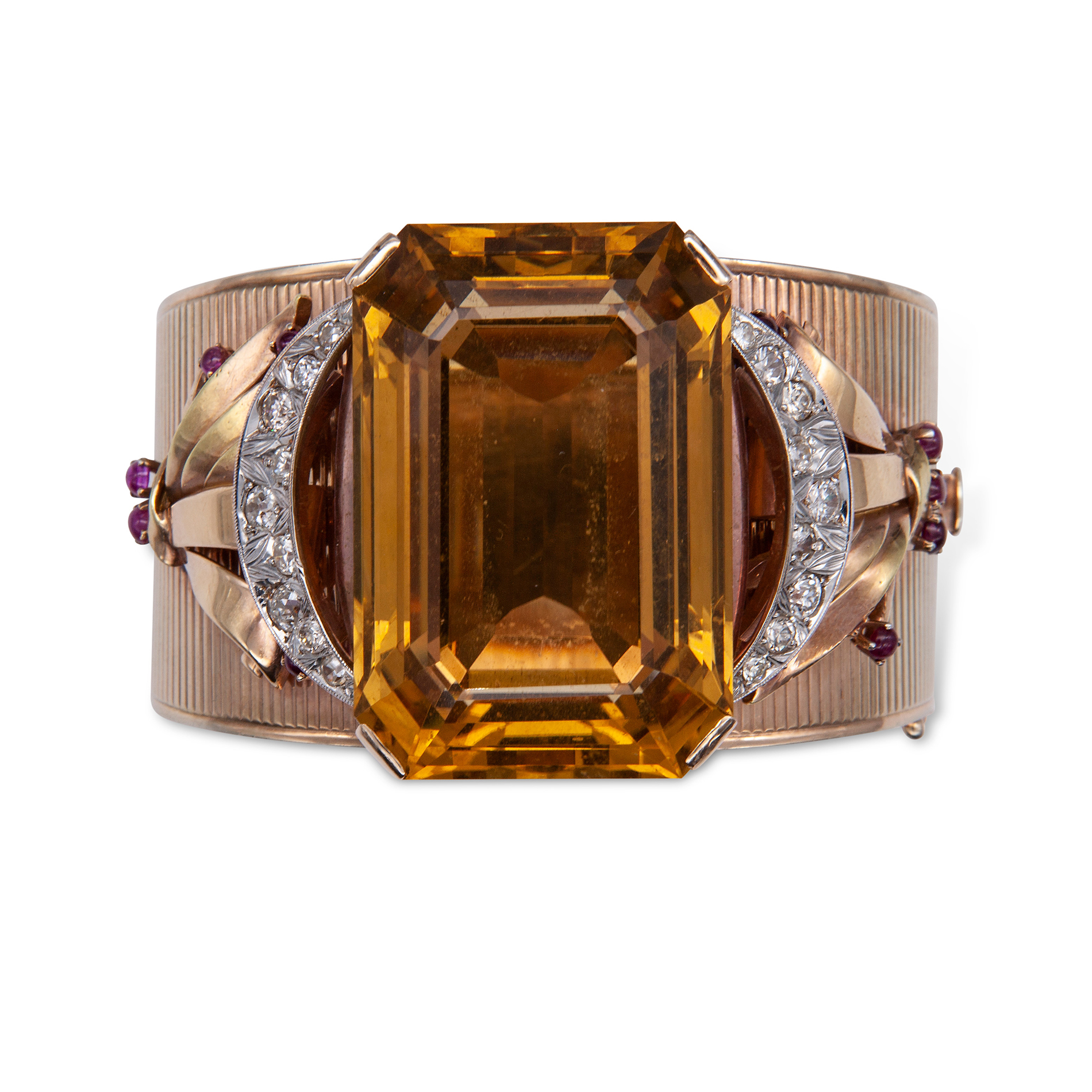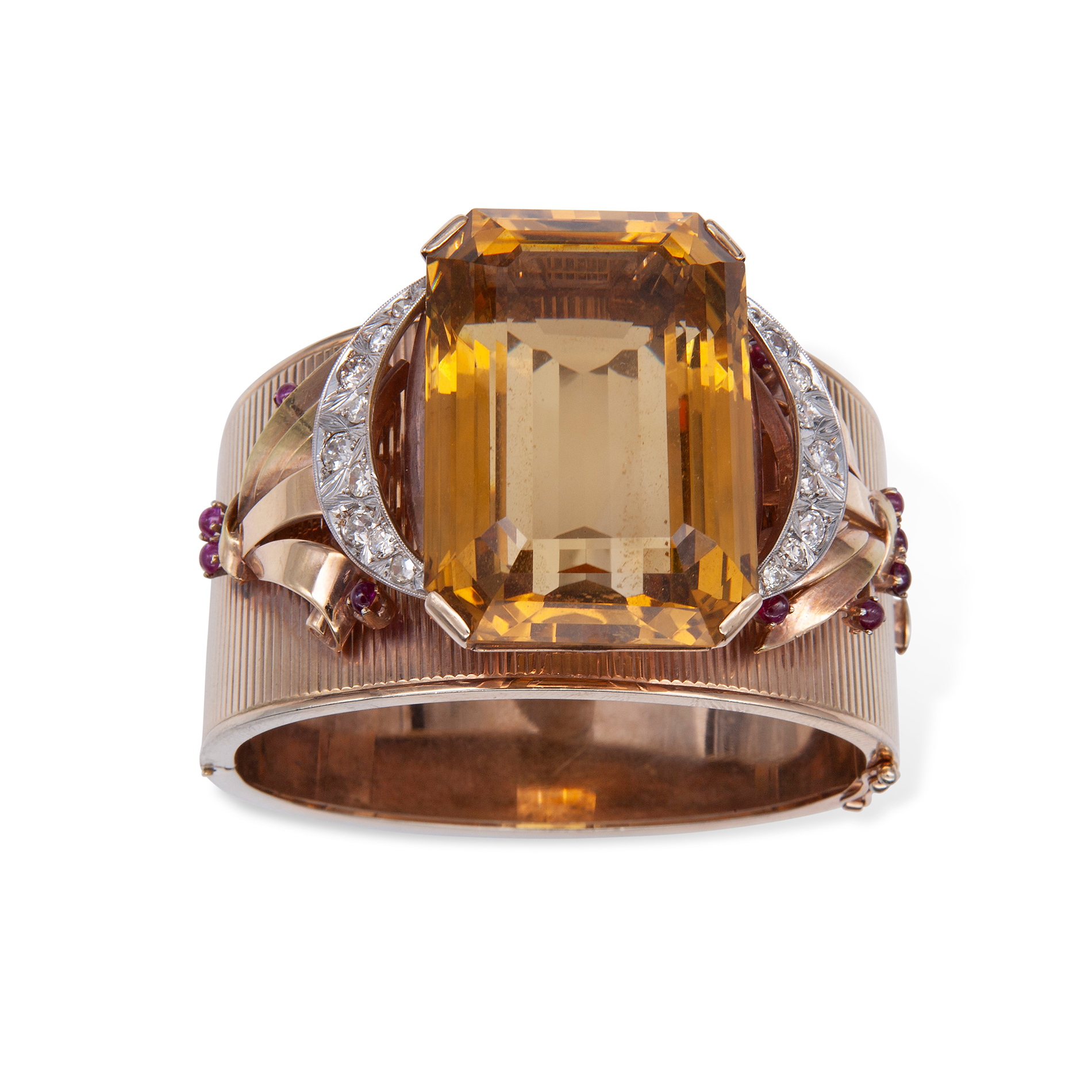 Bracciale rigido a fascia in oro giallo, grande quarzo, diamanti e rubini Oro giallo 14 kt, 1 grande quarzo citrino taglio a gradini peso stimato 116 ct, colore giallo bruno; 18 diamanti rotondi taglio brillante, peso totale stimato 1,35 ct e 12 rubini