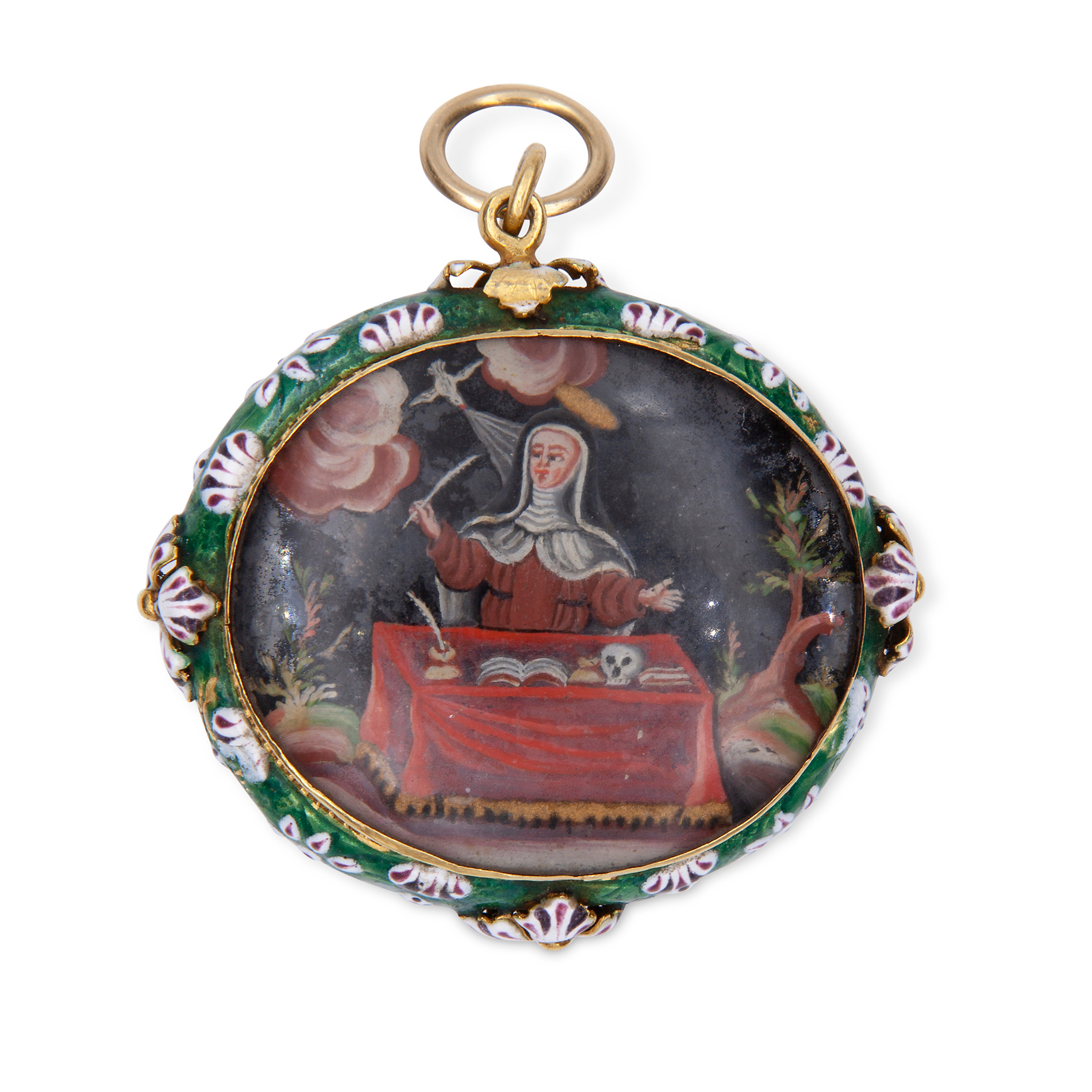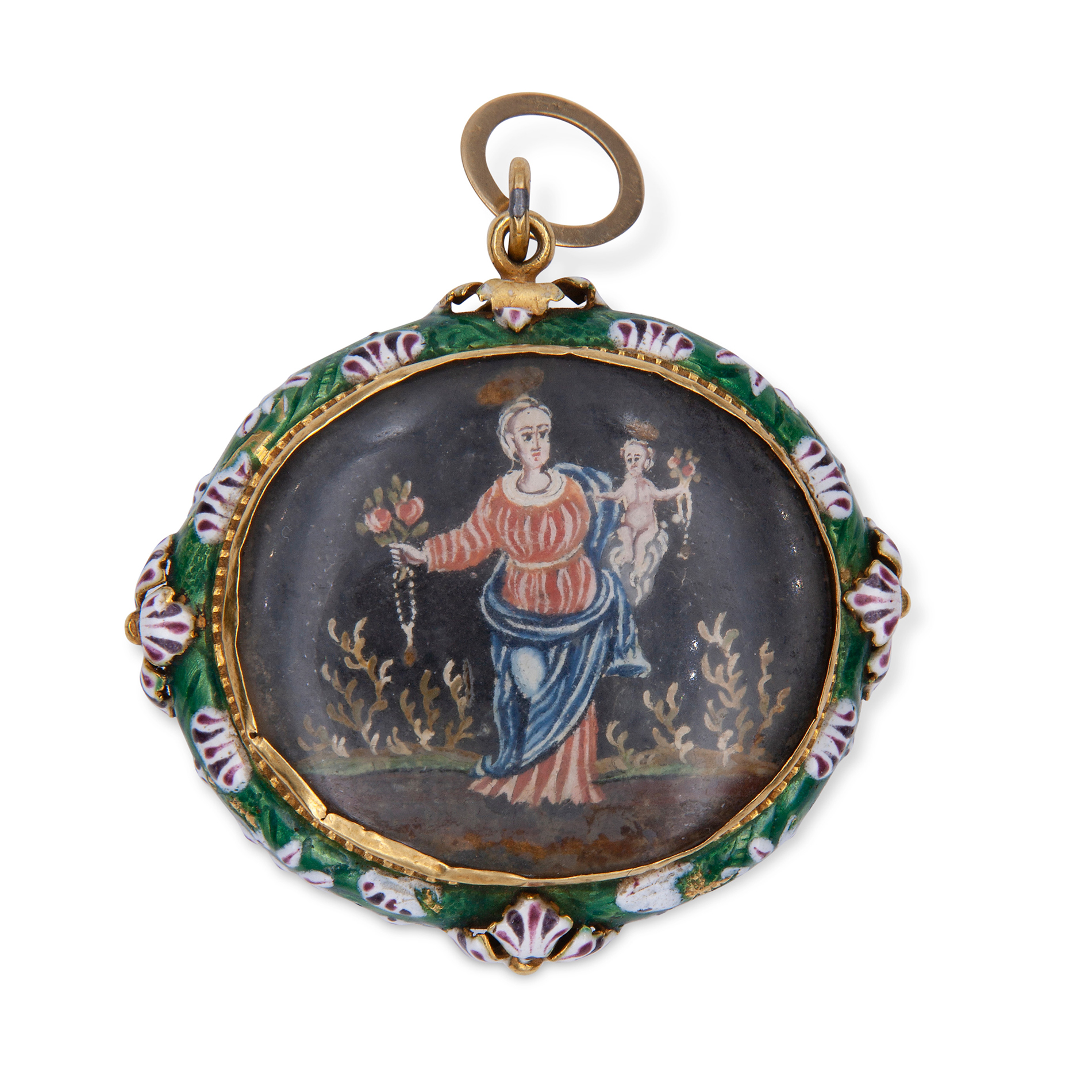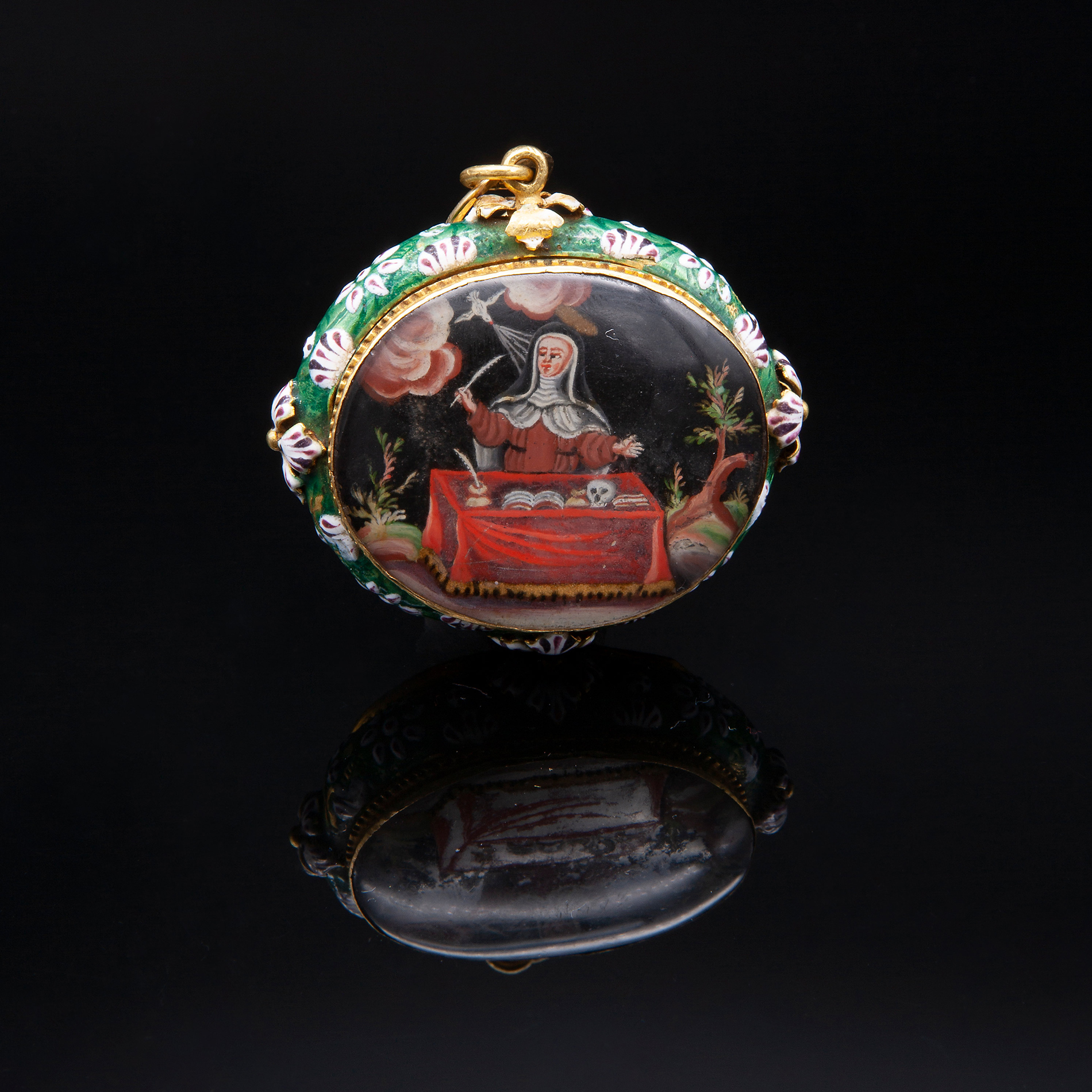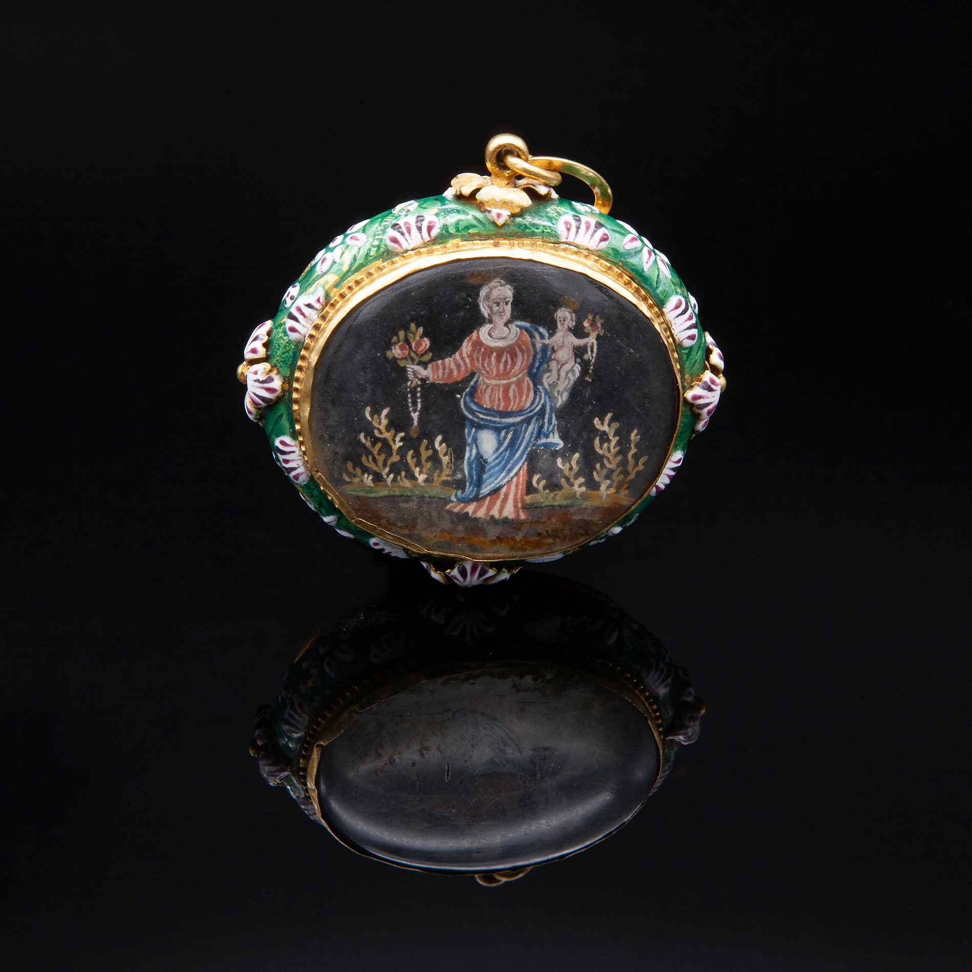 Antico pendente in oro, smalti e cristallo rocca Spagna XVII secolo, peso complessivo gr. 38,4