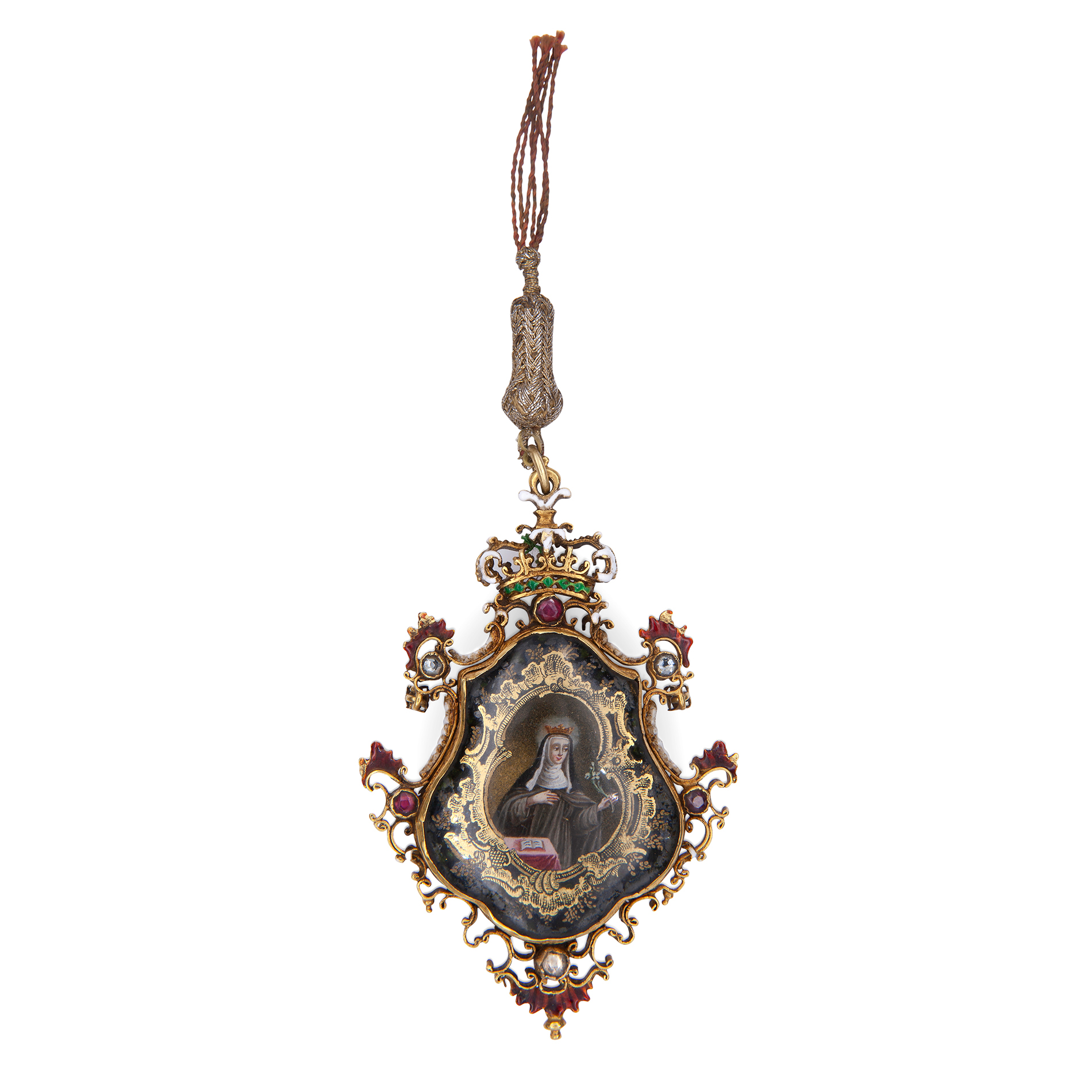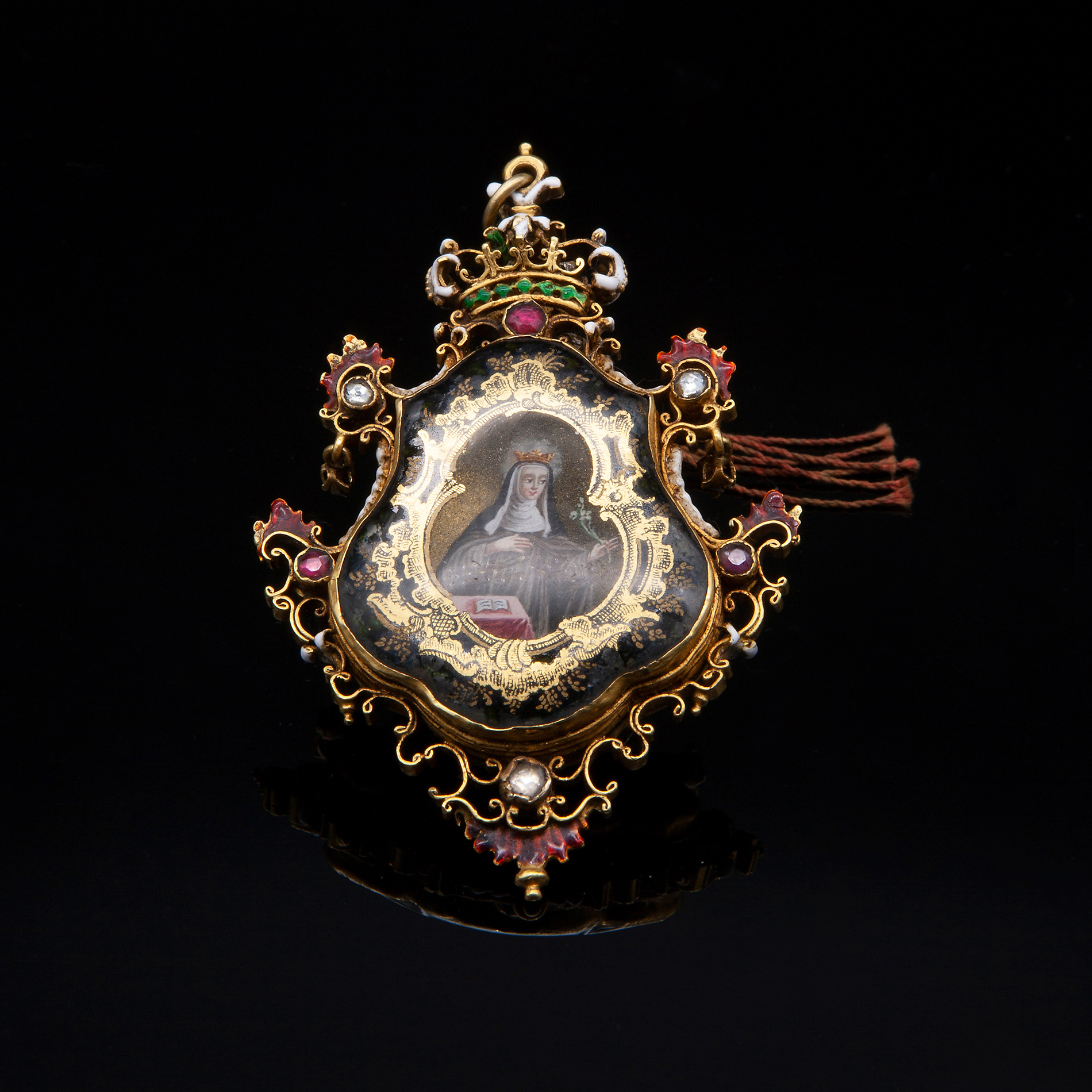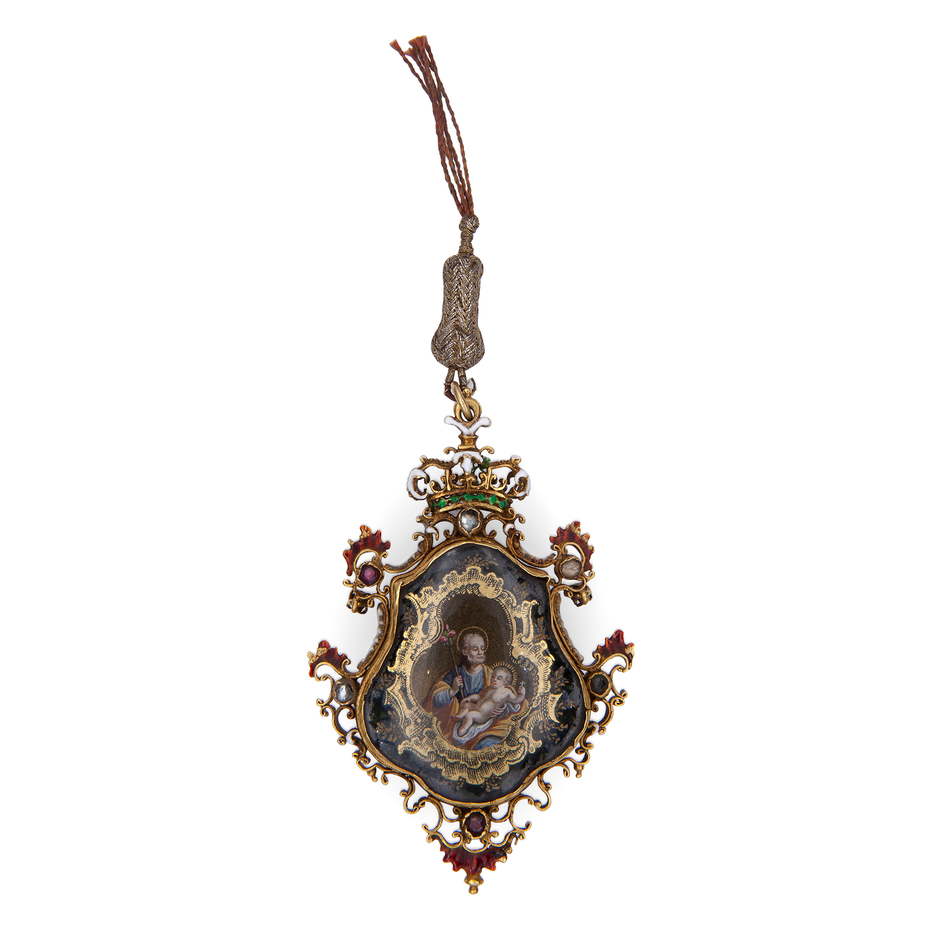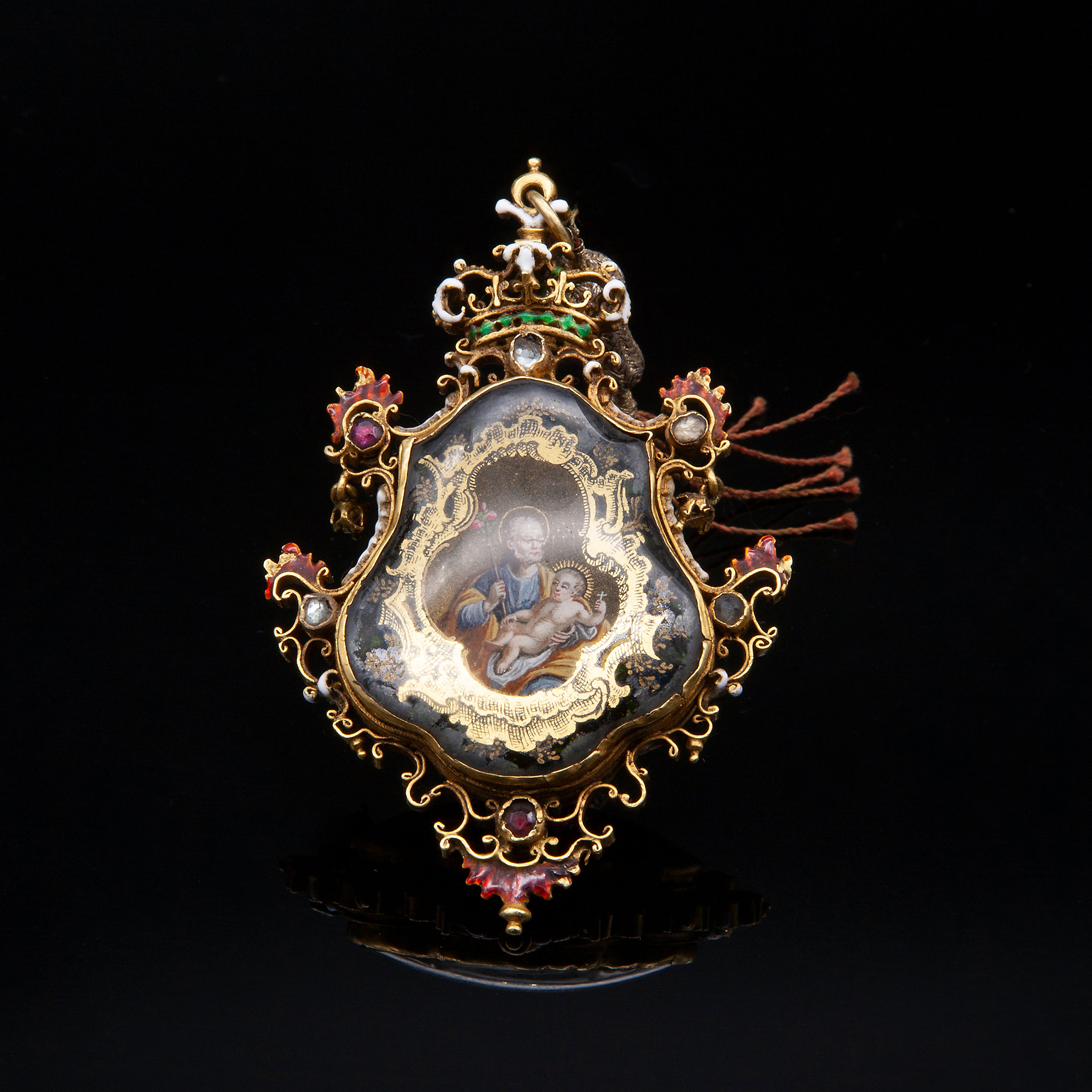 Antico pendente in oro, smalti, pietre preziose e cristallo di rocca Spagna XVII secolo, peso complessivo gr. 46,12