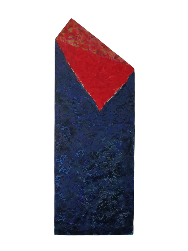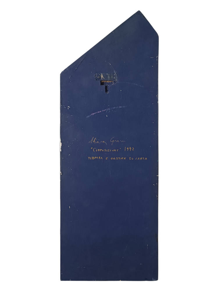 Tempera e collage di carta su legno 49X19x4 cm, firma, titolo e anno al retro.