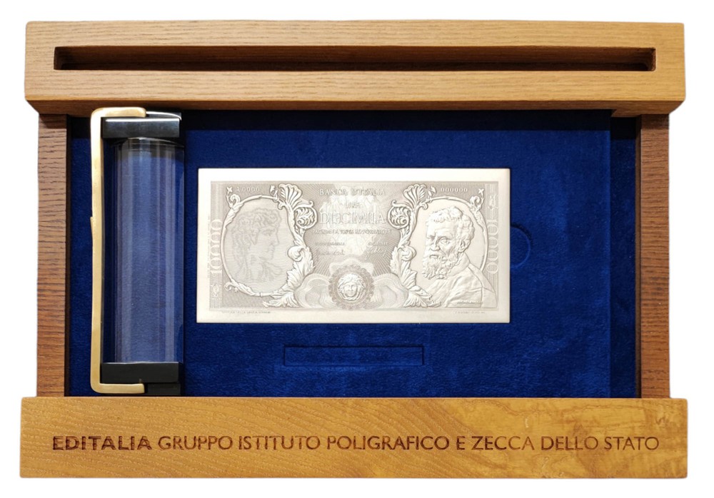 Banconota in argento 999‰; misurante 158x78x1,9 mm, 258 grammi.