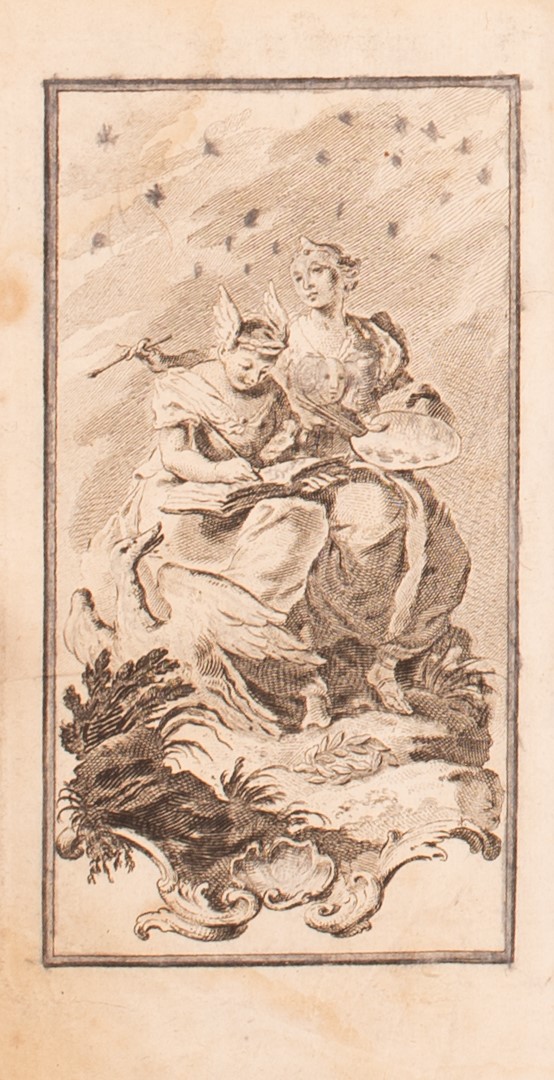 Libro in piena perganena rigida in16° pp. 264, titolo a penna sul piatto e sul dorso, bella antiporta incisa in rame raffigurante l'allegoria della poesia e della pittura, Classica opera anonima, attribuita da Melzi al Pasini (Padova 1687 - Torino 1770); fu più volte ristampata dopo la prima edizione di Torino. Melzi, I, p. 827