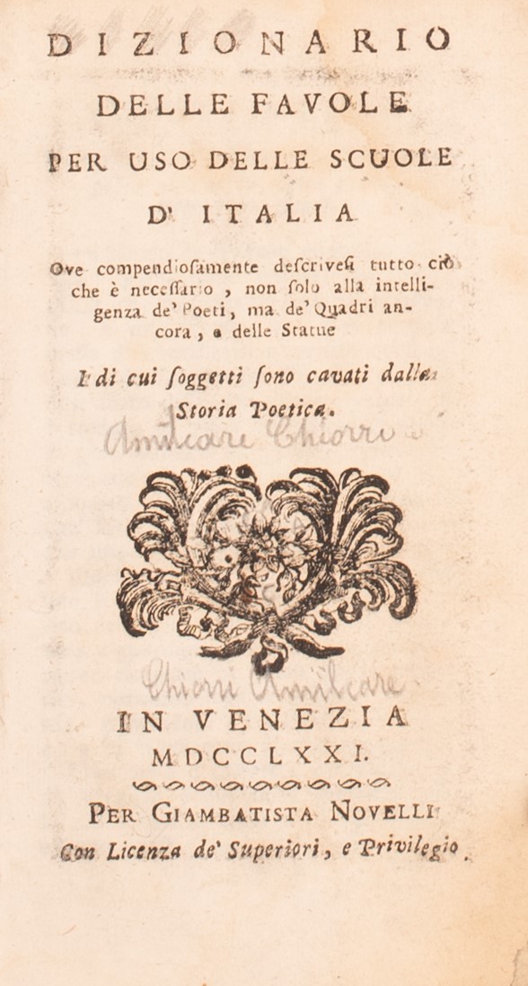 DIZIONARIO DELLE FAVOLE PER USO DELLE SCUOLE D'ITALIA OVE COMPENDIOSAMENTE DESCRIVESI TUTTO CIÒ CHE È NECESSARIO, NON SOLO ALLA INTELLIGENZA DE' POETI, MA DE' QUADRI ANCORA, E DELLE STATUE, I DI CUI SOGGETTI SONO CAVATI DALLA STORIA POETICA