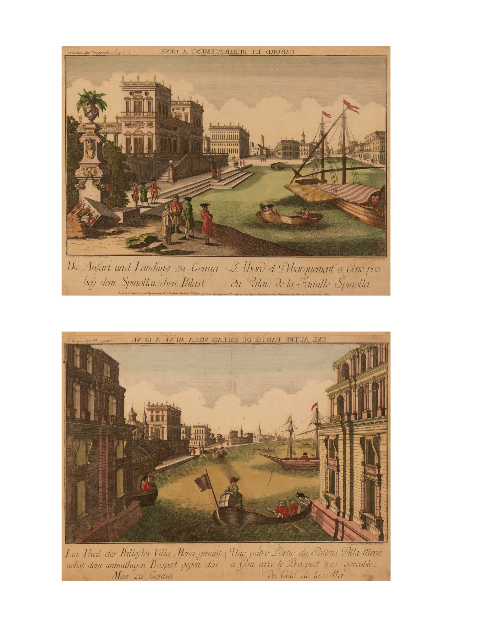 La coloritura di questa stampa antica su Genova è strettamente originale e fa uso con leggerezza dei toni giallo, verde e rosa, quest'ultimo molto sfruttato negli edifici, tipici colori che si ritrovano nelle vedute ottiche.