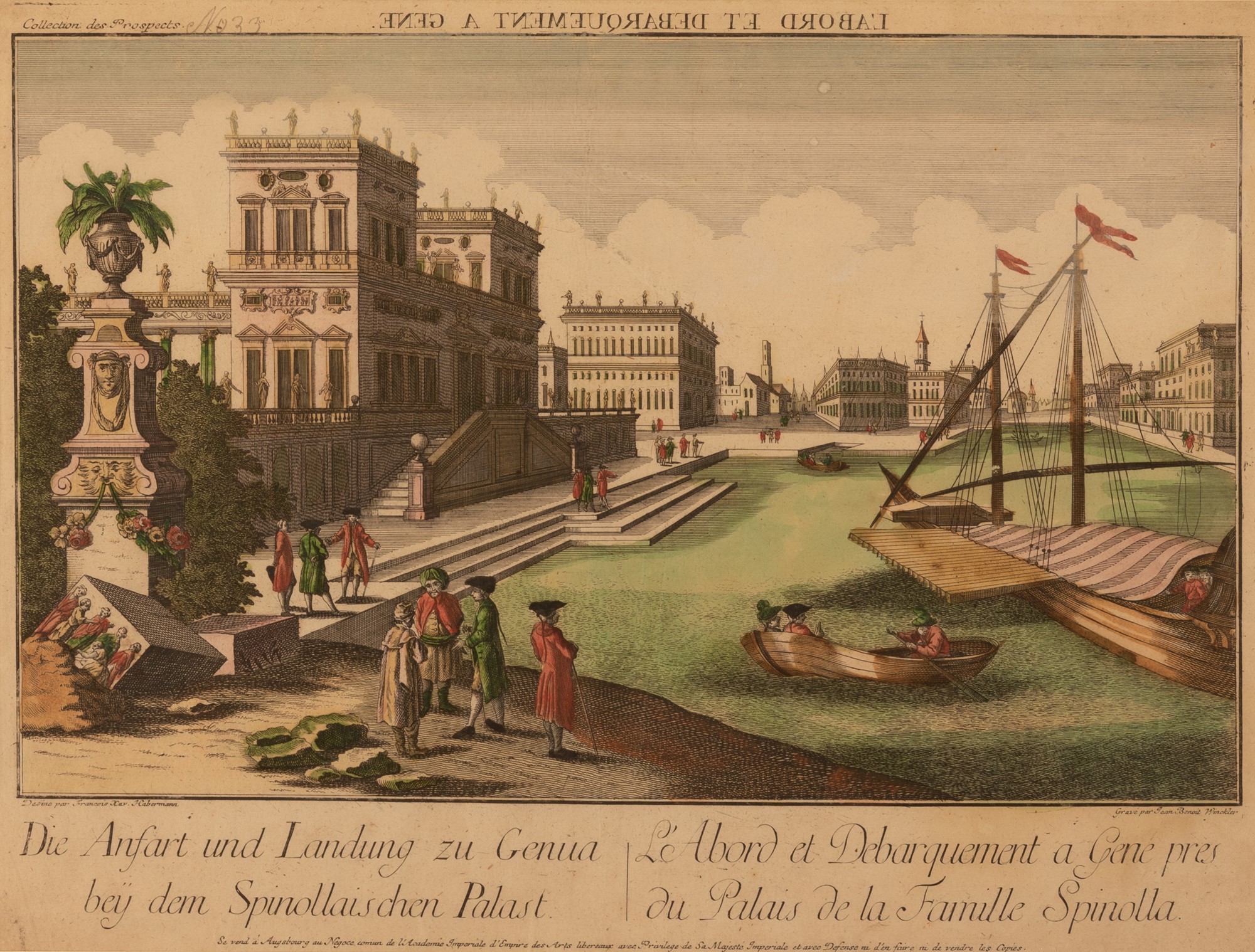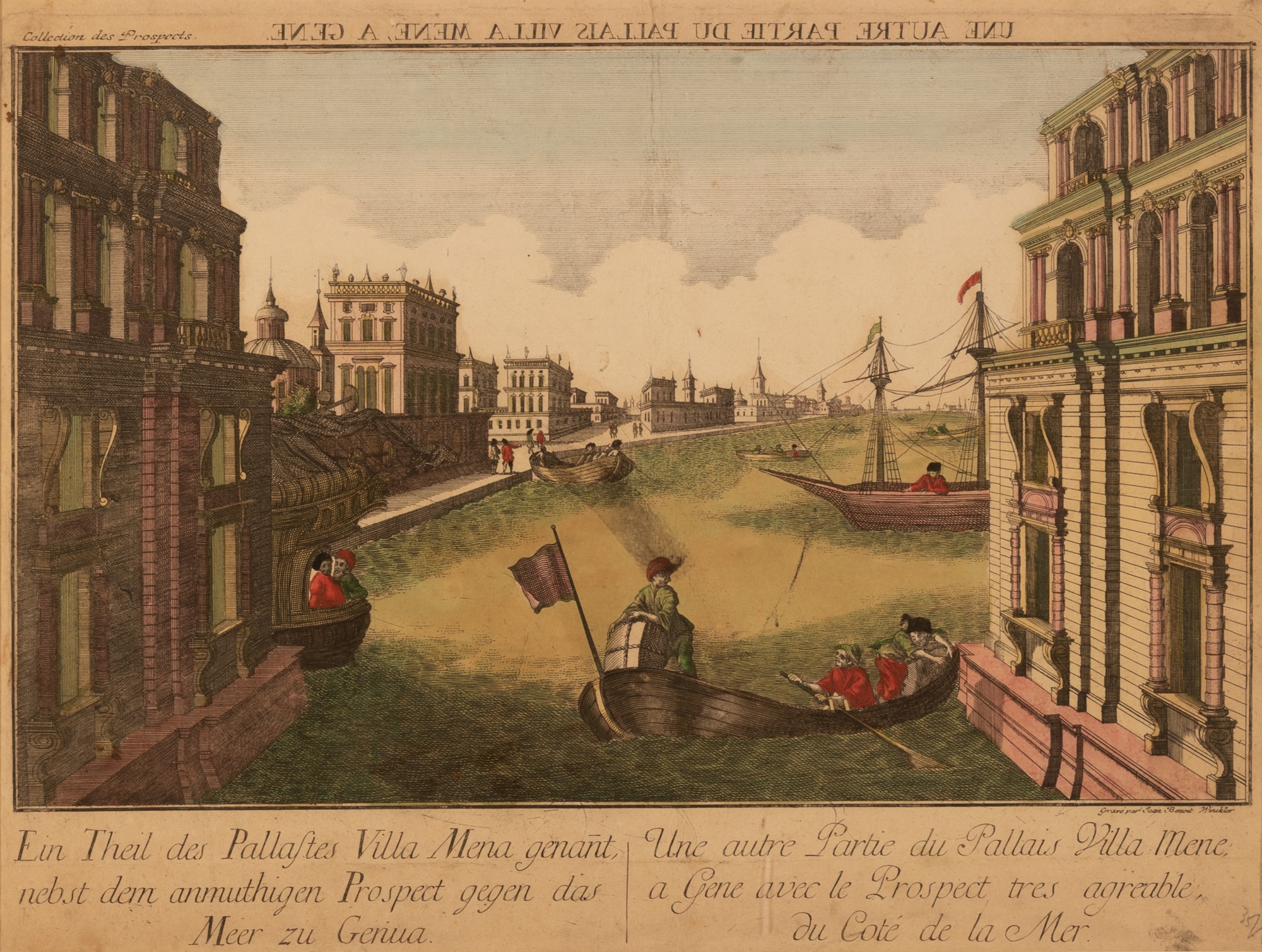 L'incisione è opera di Jean Benoit Winckler, artista attivo ad Augsburg lungo la seconda metà del settecento, particolarmente legato alla preparazione di vedute ottiche, stampe antiche di luoghi lontani pensate per essere viste attraverso un apposito strumento ottico in occasione di feste paesane o in ambienti privati, riconoscibili dal titolo scritto da destra a sinistra, in quanto l'immagine veniva capovolta dalle lenti dello strumento.