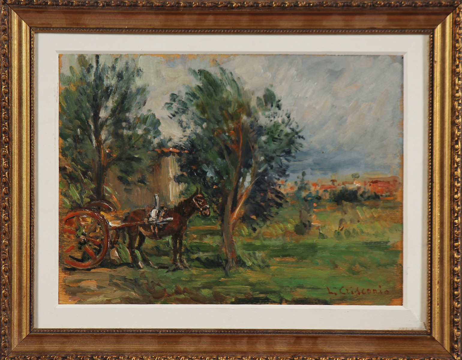 CRISCONIO LUIGI (1893 - 1943) Carrozza con cavallo in un prato. Olio su tavola. Cm 34,00 x 25,00. Firma in baso a destra. Cornice presente