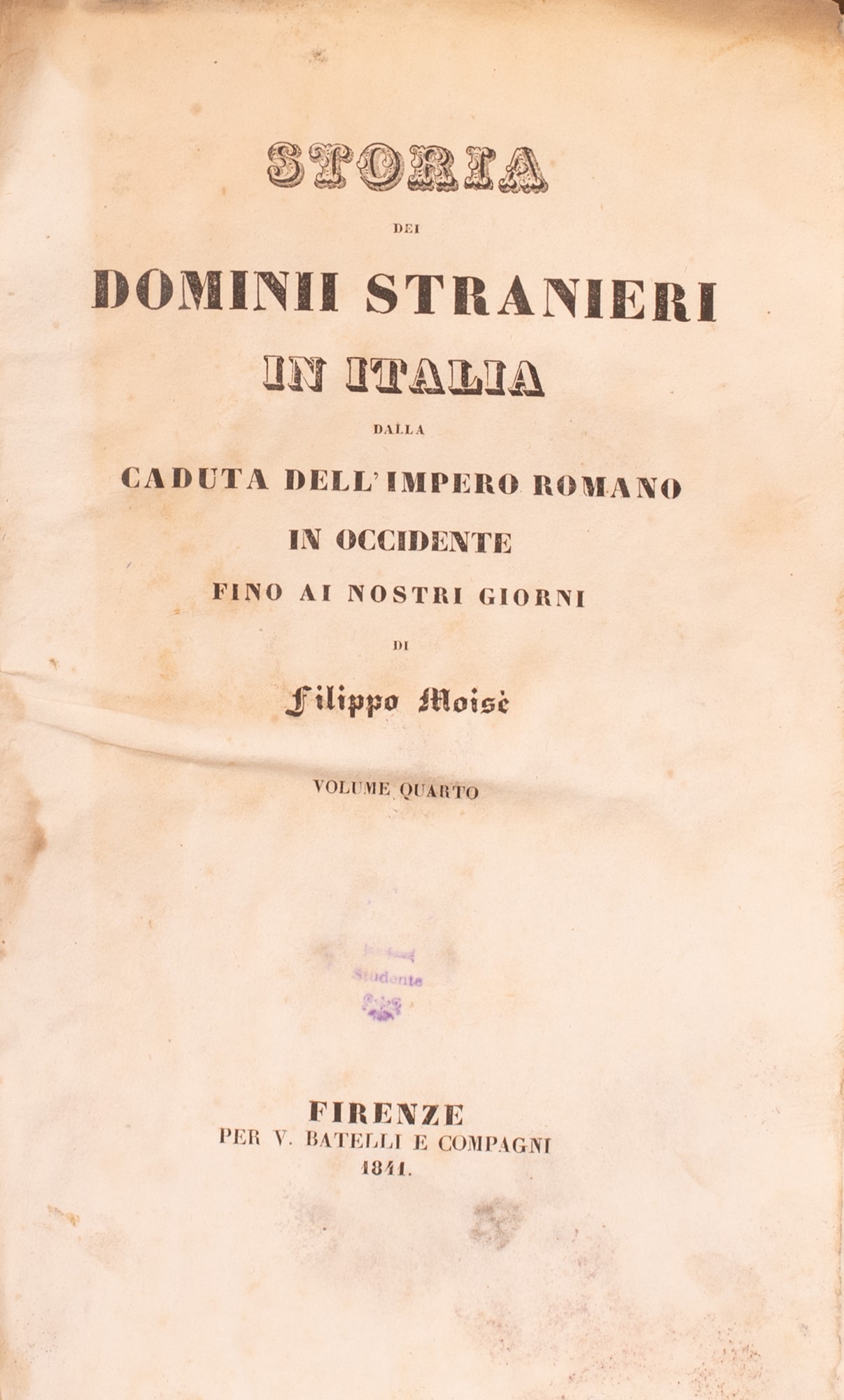 Lot 182 | Filippo MOISE’ – Storia dei dominii stranieri in Italia dalla caduta dell’Impero Romano in Occidente fino ai nostri giorni di Filippo Moisè – 1839. Firenze per V. Batelli e compagni