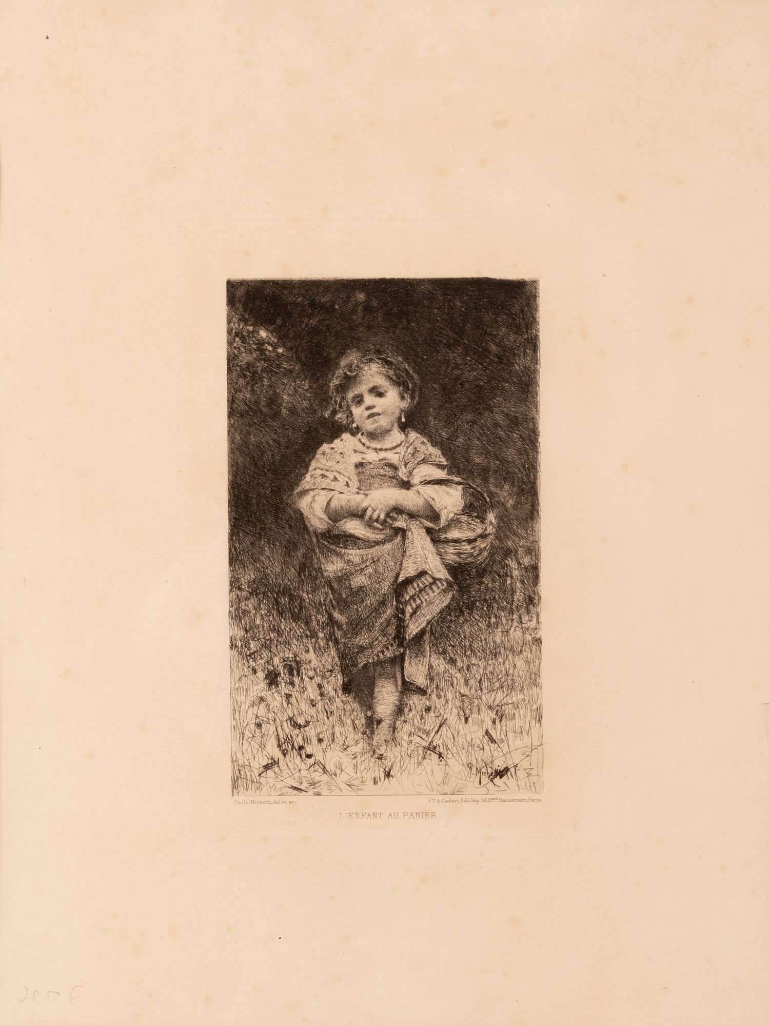 Pittore, incisore e fotografo abruzzese. Si forma presso l'Accademia di Belle Arti di Napoli sotto Domenico Morelli che ne riconobbe immediatamente le doti. L'ambiente napoletano lo spingerà a dedicarsi ad una pittura realista e naturalista grazie anche ai contatti con Filippo Palizzi, Giuseppe De Nittis e Marco De Gregorio, artisti della cosiddetta Scuola di Resina. Abbandonata l'Accademia per la troppa rigidità torna in Abruzzo a Francavilla. Nel 1871 parte per Parigi per partecipare al Salons, apprezzato dal pubblico e dalla critica riesce a farsi conoscere da un pubblico internazionale; a Parigi presso l'editore Cadart vengono pubblicate le quattro lastre che hanno così una tiratura regolare: Cueillette d'olives dans les Abruzzes 1875, L'enfant au panier, Gardeuse de dindons, Jeunes bergers des environs de Chieti. Le altre quattro lastre note di Michetti Tatone, Ragazza alla fontana, Pastorella abruzzese e Ritratto di anziano sono ad oggi note in pochissimi esemplari. L'incontro con il pittore spagnolo Mariano Fortuny nel 1874 a Napoli favorisce un cambiamento nella tavolozza e lo avvicina a soggetti più folkloristici. Intorno al 1879 risale la sua amicizia, fratellanza con il vate Gabriele d'Annunzio che considera l'artista mei dimidium animi. Nel cosiddetto Conventino, abitazione e studio di Michetti a Francavilla, si riunisce il cenacolo michettiano: un'esperienza unica in cui il pittore Michetti, il poeta Gabriele d'Annunzio, lo scultore Costantino Barbella e il musicista Francesco Paolo Tosti - ai quali poi si uniranno altri scrittori ed artisti - lavorarono insieme e sviluppano il tema comune della natura e della gente d'Abruzzo. Una bambina in abiti tradizionali, incede frontale verso lo spettatore. La figura è in piena luce, si staglia su uno sfondo costituito da una fitta boscaglia, potente è l'uso del chiaroscuro che conosce la lezione di Rembrandt. La bimba ha le braccia appoggiate sul ventre per reggere un cestino, i capelli mossi incorniciano il volto, sembra che stia canticchiando e il particolare degli orecchini e della collana di perle accentuano la luminosità del suo incarnato. Il soggetto è già affrontato in pittura, in particolare nel dipinto La Petite Fille au panier sul mercato parigino nel 1875 come appartenente alla collezione H. Nel catalogo di vendita il dipinto è illustrato con l'incisone di Michetti che dunque costituisce un termine ante quem di datazione della lastra. La figura è costruita con il tipico segno fine e libero di Michetti, un segno graffiato, elegante; i volumi sono costruiti con un fitto e irregolare intrecciarsi di tratti delicati e punti, morsure successive marcano progressivamente le zone in ombra. Firma nella lastra in basso a destra P Michetti. Nel margine inferiore oltre l'immagine a sinistra "Paolo Michetti del. et sc. ", titolo al centro, a destra "Imp.Cadart, Paris" e a sinistra "Gazzette de Beaux-Arts". L'esemplare è tratto da La Gazette des Beaux-arts numero del marzo 1880, foglio mm 278 x 184. Impressione eccellente. Ottimo stato di conservazione. Margini regolari oltre la battuta del rame. Stato: V/VI con tutte le scritte relative all'edizione della Gazette. Un altro esemplare è conservato presso Milano (MI), Civiche Raccolte Grafiche e Fotografiche. Civica Raccolta delle Stampe Achille Bertarelli. Bibliografia: Davoli, 5; Prandi 4 (ill.); V. Bindi, Artisti abruzzesi, Napoli 1883, pp. 172-176; G. DAnnunzio, Nota su F.P. M., in Convito, VIII (1896), pp. 583-592; R. De Logu, Per un profilo di M., in Mostra dei disegni, incisioni e pastelli di F.P. M., Francavilla al Mare 1966, pp. 11-27.