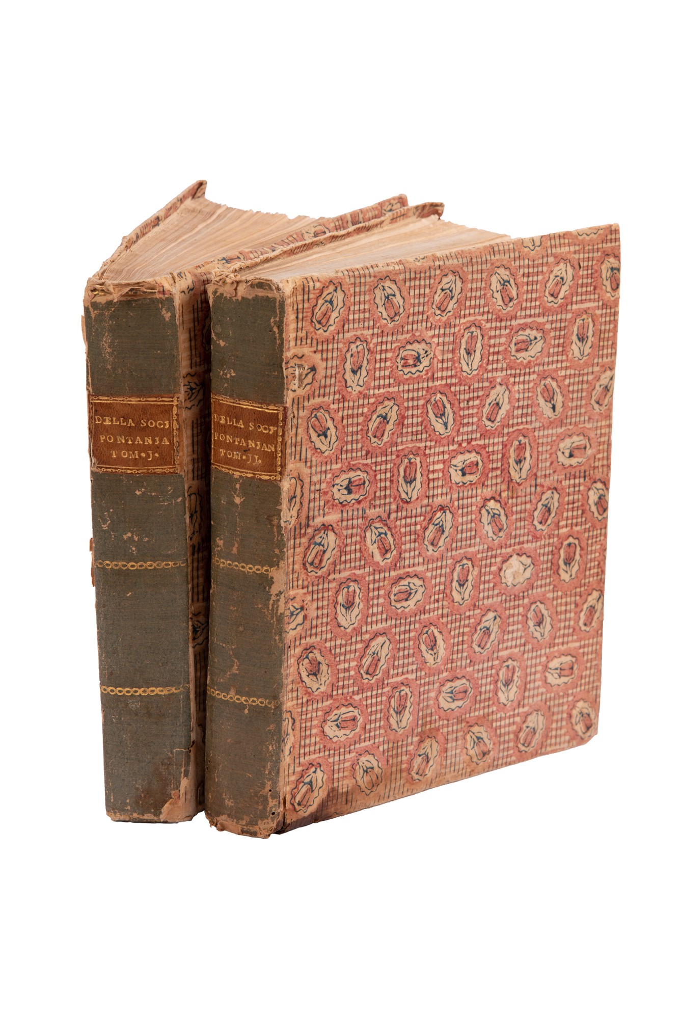 due volumi in mezza pelle con piatti marezzati. grande macchia di umidità nel frontespizio degli Atti