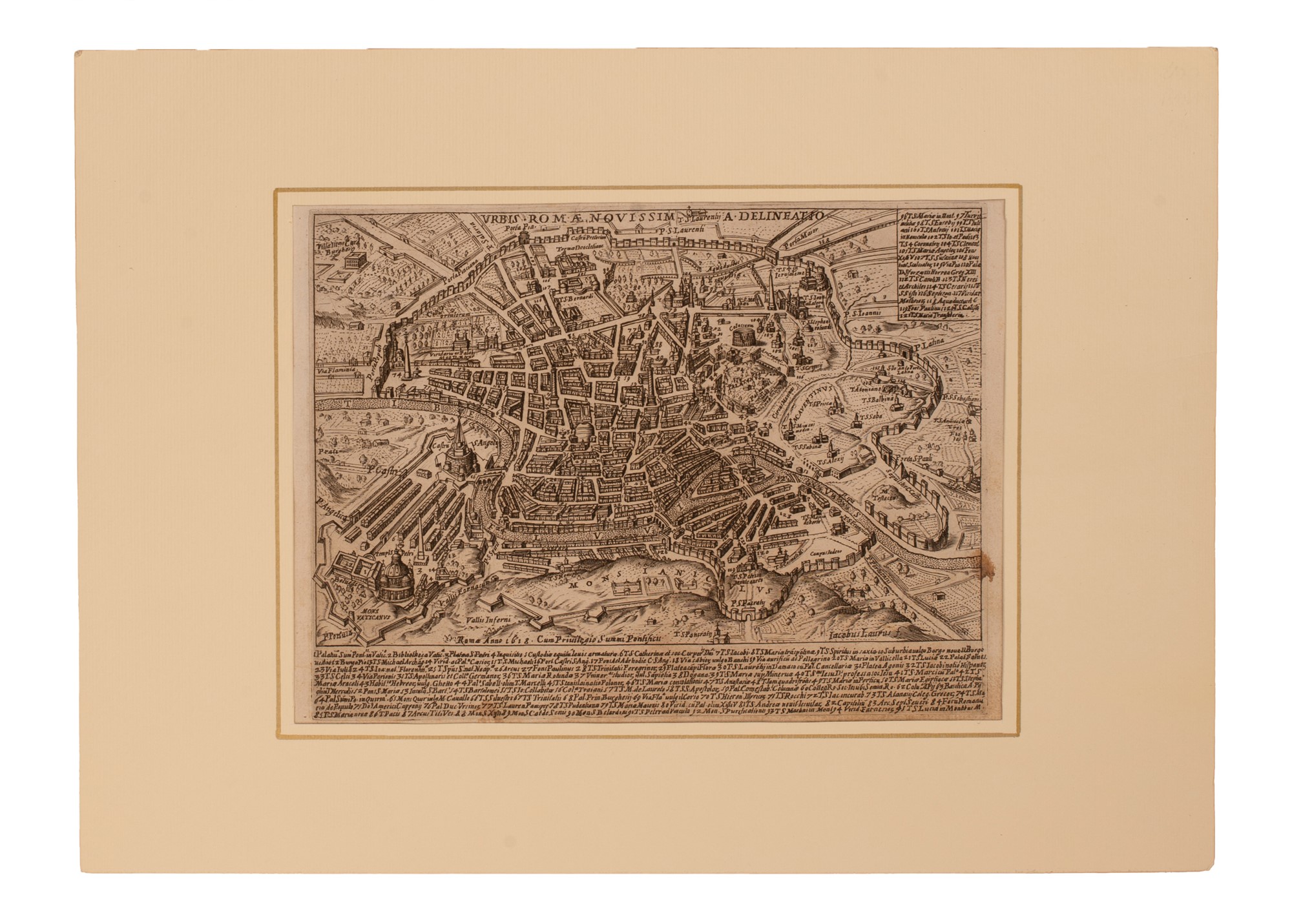 Piccola pianta di Roma proiezione obliqua, orientata col nord a sinistra.  "E' evidente la derivazione di questa pianta da quella più grande del Florimi, come giustamente rilevato dalla Jatta nel catalogo Roma Veduta. In basso a sinistra si legge Romae Anno 1618 cum privilegio Summi POntifici ed a destra: Jacobus Laurus f. Sul margine inferiore una legenda di 95 numeri che prosegue nel cartiglio in alto a destra fino al n. 121" (cfr. Marigliani, p. 185).  Tuttavia, ci sembra improbabile che sia derivazione del Florimi - che, tra l'altro, comprende una legenda di soli 86 numeri di legenda. Sembra più probabile la derivazione con le piante incise da Ambrogio Brambilla per il Franzini prima e per Nicola van Aelst poi (1590). Pianta tratta dall'Antiquae Urbis Splendor di Giacomo Lauro, opera per la prima volta pubblicata nel 1612, importante e ricercata raccolta di vedute e antichità romane, rappresenta il più importante lavoro del Lauro e godette di una incredibile fortuna. L'opera interamente illustrata con sintetici testi didascalici sulle bellezze e gli splendori di Roma antica e Roma moderna venne ristampata ed accresciuta. Le edizioni posteriori fanno sempre riferimento alla data di pubblicazione del 1612. La data e lo stampatore sono però dedotti dalla dedica di Giovanni Alto (jan Alten) da Lucerna, curatore del volume, ai lettori. Acquaforte e bulino, stampata su carta vergata coeva, in ottimo stato di conservazione. Bibliografia Frutaz n. 26; Scaccia Scarafoni n. 180; Huelsen 49; Roma Veduta n. 22; Marigliani p. 185, n. 90.