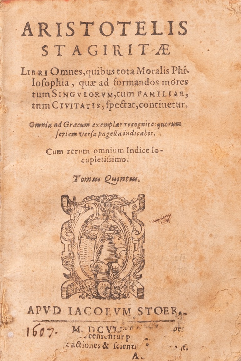 - ARISTOTELIS STAGIRITAE. LIBRI OMNES, QUIBUS TOTA MORALIS PHILOSOPHIA, QUAE AD FORMANDOS MORES TUM SINGULORUM, TUM FAMILIAS, TUM CIVITATIS, SPECTAT, CONTINETUR. TOMUS QUINTUS.