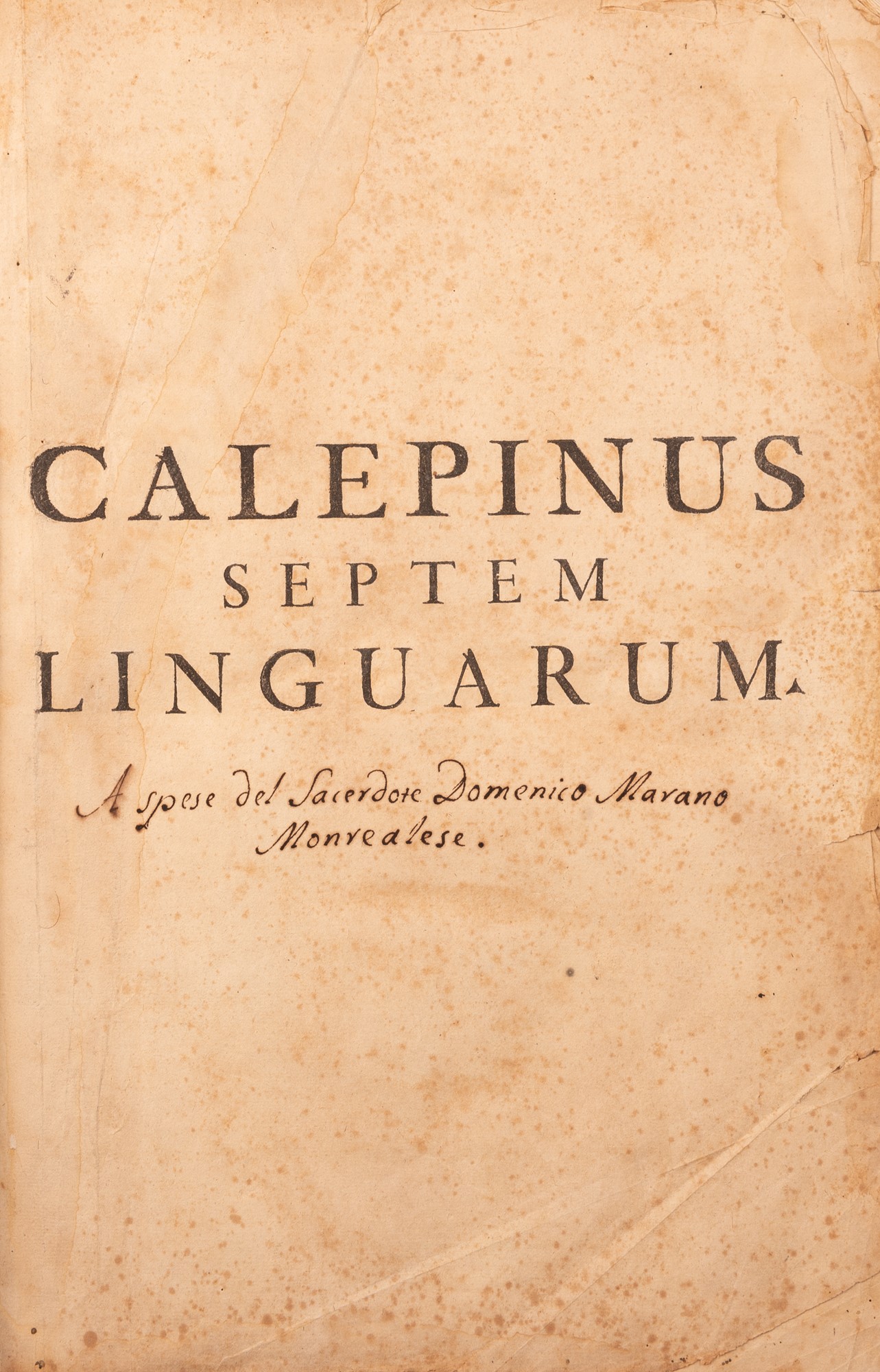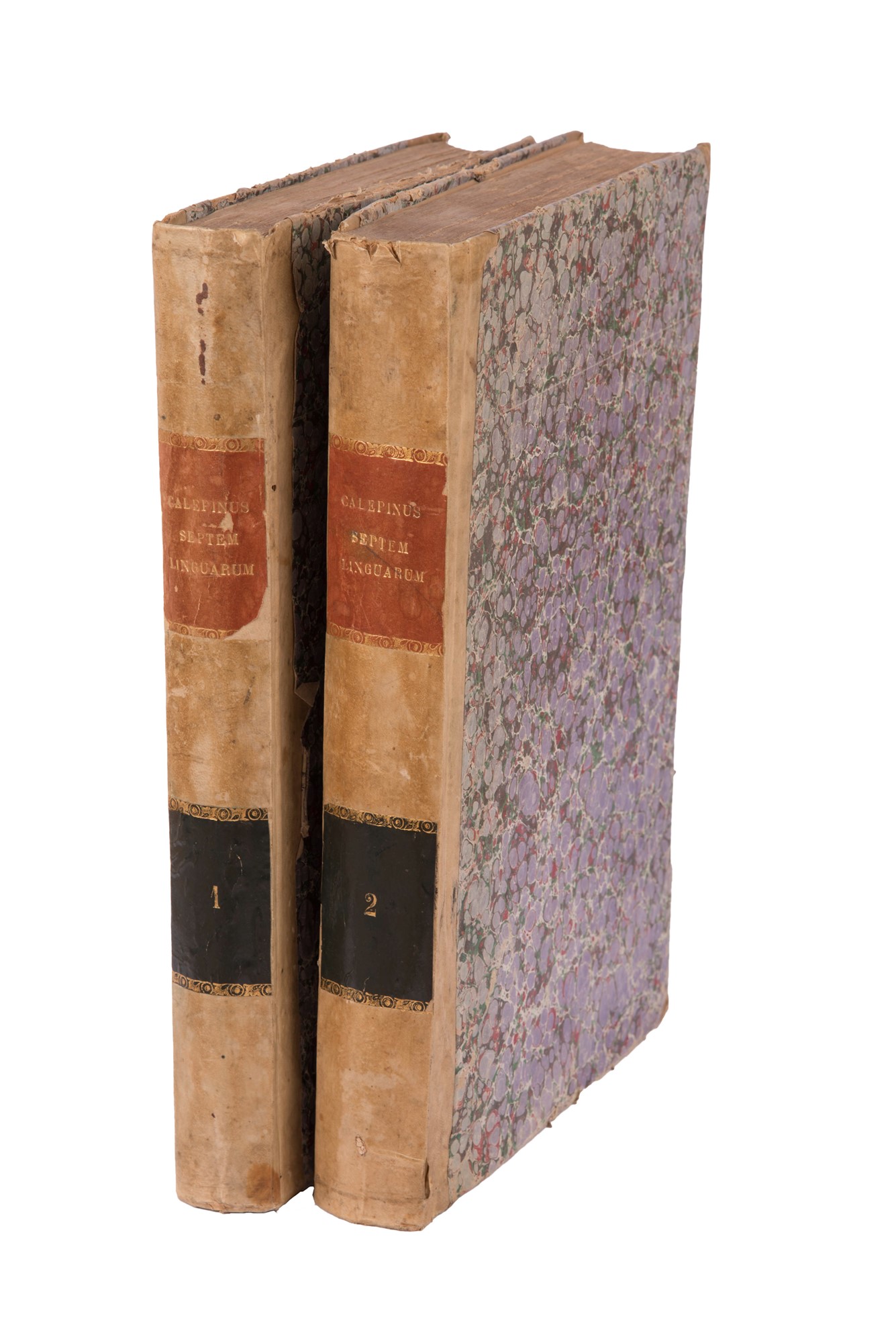 Foglio grande, 2 voll. (1a v.: fronte, 2 h., 464 p.; 2a v.: fronte, 481 p., 86 p.). Stampato in doppia colonna. Pergamena, lettere dipinte al dorso. Ex libris. Buona copia. Dizionario molto prezioso, apparso per la prima volta in latino, ma ampiamente ristampato, e in ogni edizione si aggiungeva una nuova lingua, fino a raggiungere sette o otto, tra le quali compare sempre il castigliano. Questa ottava edizione è una ristampa ritoccata della settima. Alla fine del secondo volume compare, in 86 pagine di propria numerazione, il supplemento: "Verba barbara, ex Calepini, Passeratii, Stephani & Fabri Lexicis expulsa". Palau cita questa edizione, senza descriverla (40373). Graesse descrive la settima edizione del 1752, e cita anche questa ottava, del 1758 (Graesse, II, 15). Brunet descrive anche la settima (B., I, p. 1474). Lingua latina. Dizionari. Lingua latina. Dizionari.