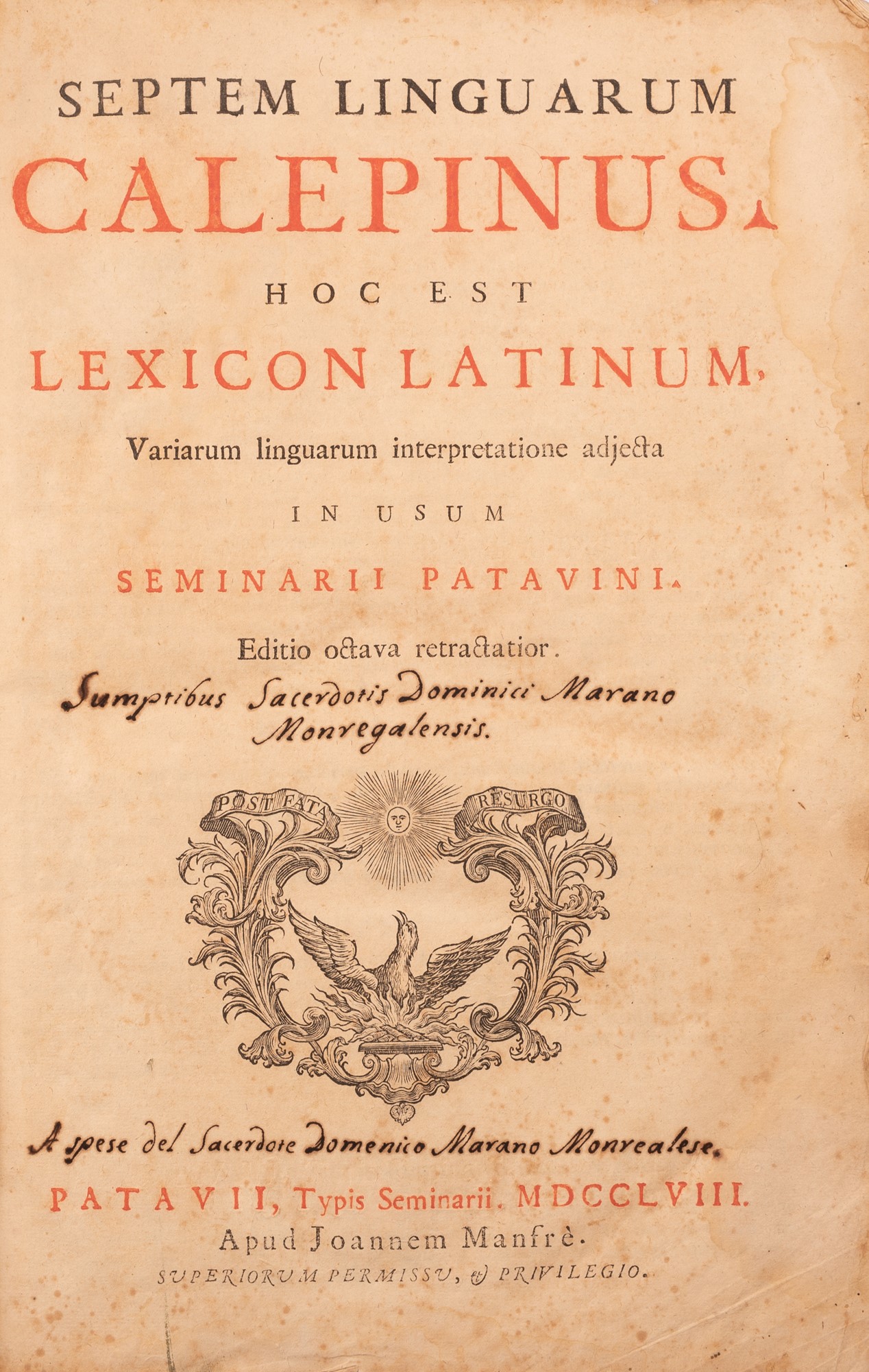 Septem linguarum Calepinus, hoc est Lexicon latinum. Variarum linguarum interpretatione adjecta in usum Seminarii Paravini. Editio octava retractiorCalepino, Ambrogio