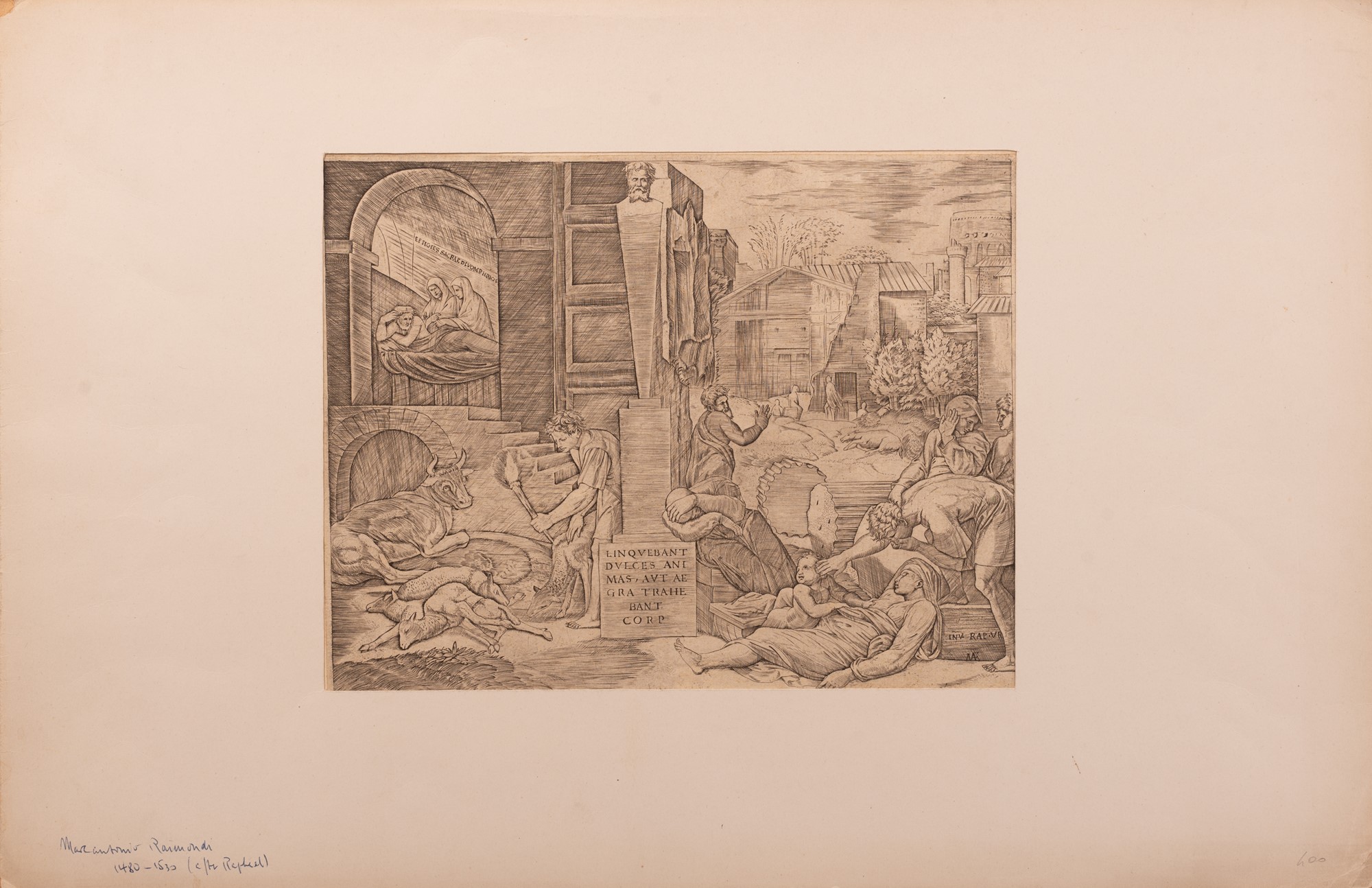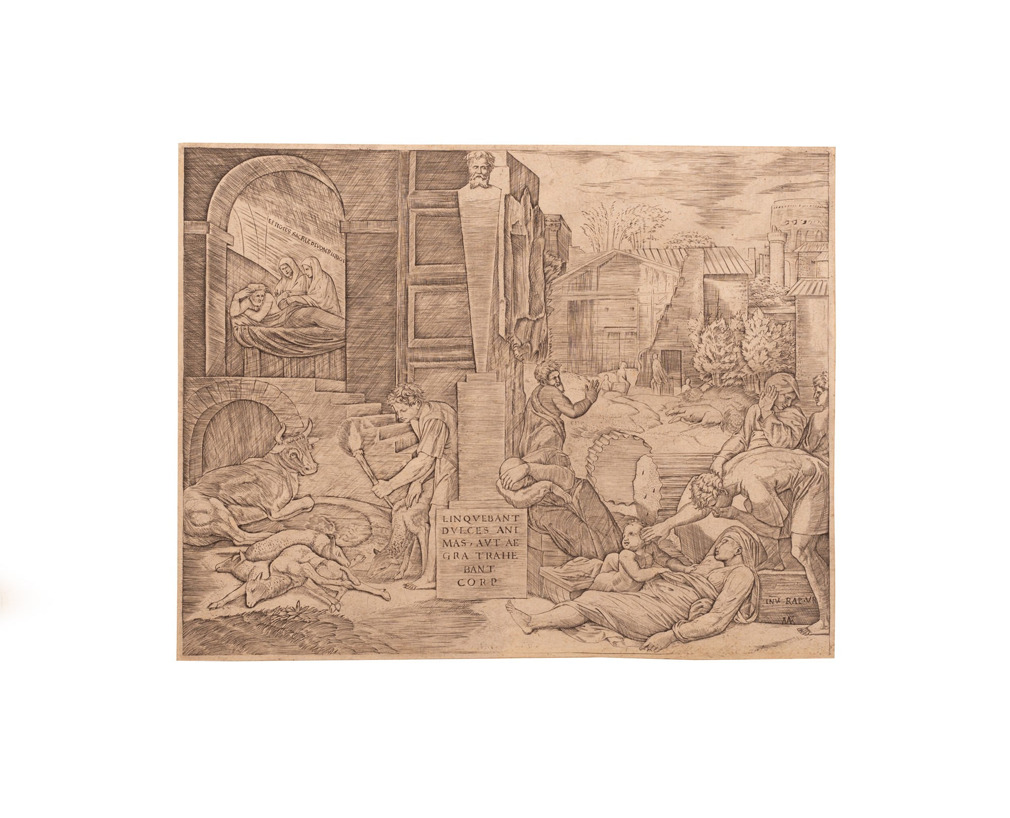 (Bologna, 1480 - Bologna, 1534) - In questa immagine Raimondi riproduce un disegno di Raffaello, probabilmente creato per essere inciso. Il tema che ha ispirato il disegno è stato tratto dall'Eneide di Virgilio, in particolare dal Libro III, che descrive un'epidemia di peste che colpì il gruppo di profughi troiani quando sbarcarono e si stabilirono nell'isola di Creta. Gli sforzi dei Troiani per prevenire la diffusione dell'epidemia non hanno successo e molte persone e animali muoiono a causa del devastante attacco della peste.