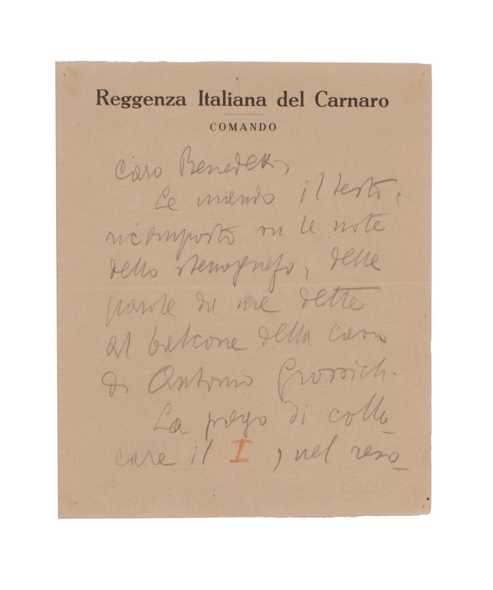lettera manoscritta su carta intestata "Reggenza Italiana del Carnaro- Comando" indirizzata a Benedetti, firmata e datata 27 settembre