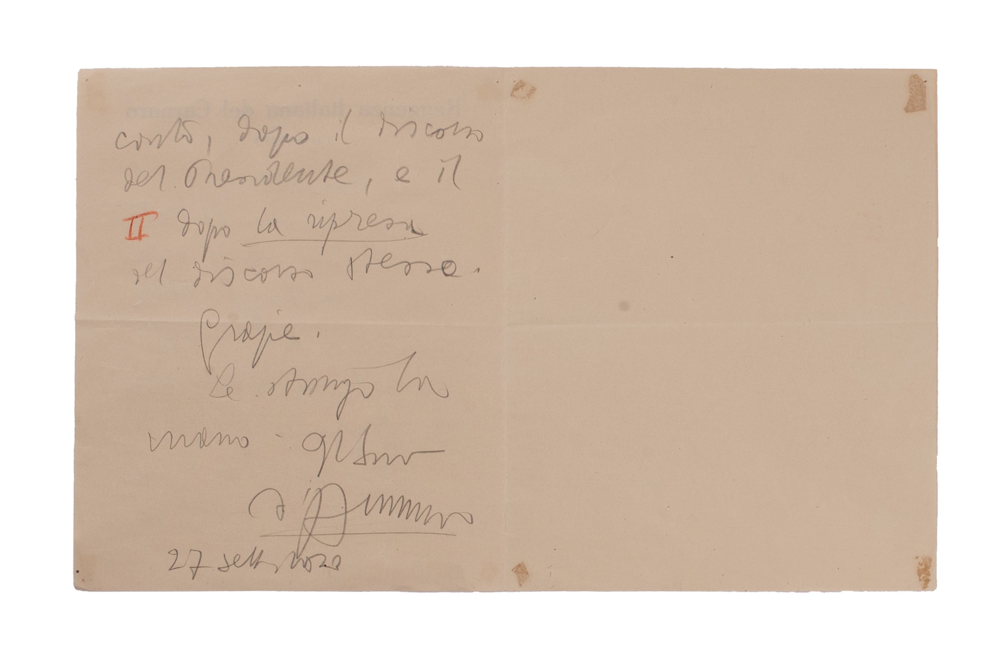 carta 34x21 cm, ripiegata in due per complessive quattro pagine (21x17 cm) e scritta al fronte e al verso delle prime due con lapis dal Vate. due segni di numerazione con lapis rosso (I e II)