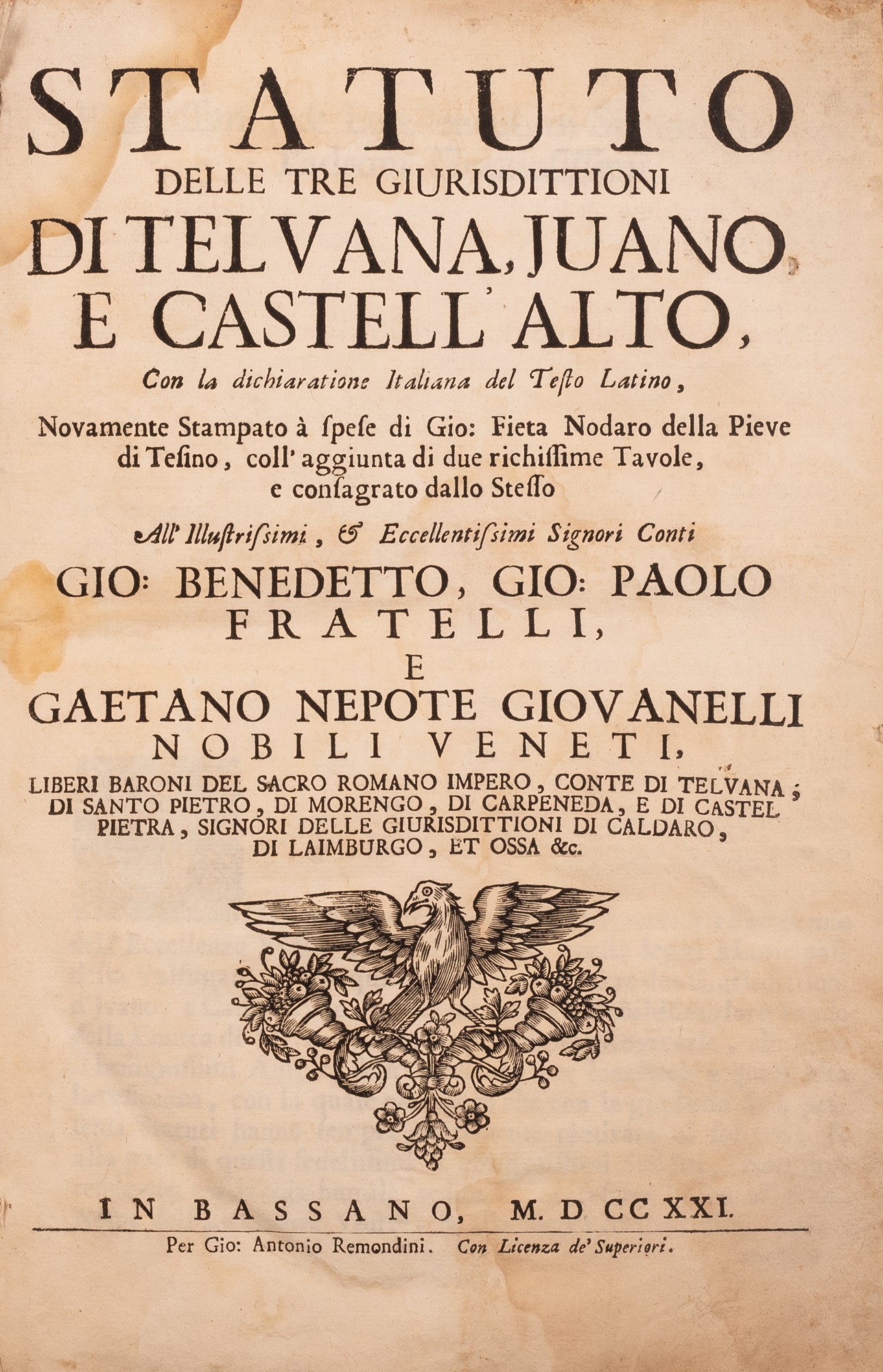 - STATUTO DELLE TRE GIURISDITTIONI DI TELVANA, JUANO, E CASTELL'ALTO, CON LA DICHIARATIONE ITALIANA DEL TESTO LATINO. NOVAMENTE STAMPATO A SPESE DI GIO. FIETA NODARO DELLA PIEVE DI TESINO, COLL'AGGIUNTA DI DUE RICHISSIME TAVOLE CONSAGRATO DALLO STESSO ALL'ILLUSTRISSIMI & ECCELLENTISSIMI CONTI GIO. BENEDETTO, GIO. PAOLO FRATELLI E GAETANO NEPOTE GIOVANELLI NOBILI VENETI(...) 1721 PER GIO. ANTONIO REMONDINI, IN BASSANO