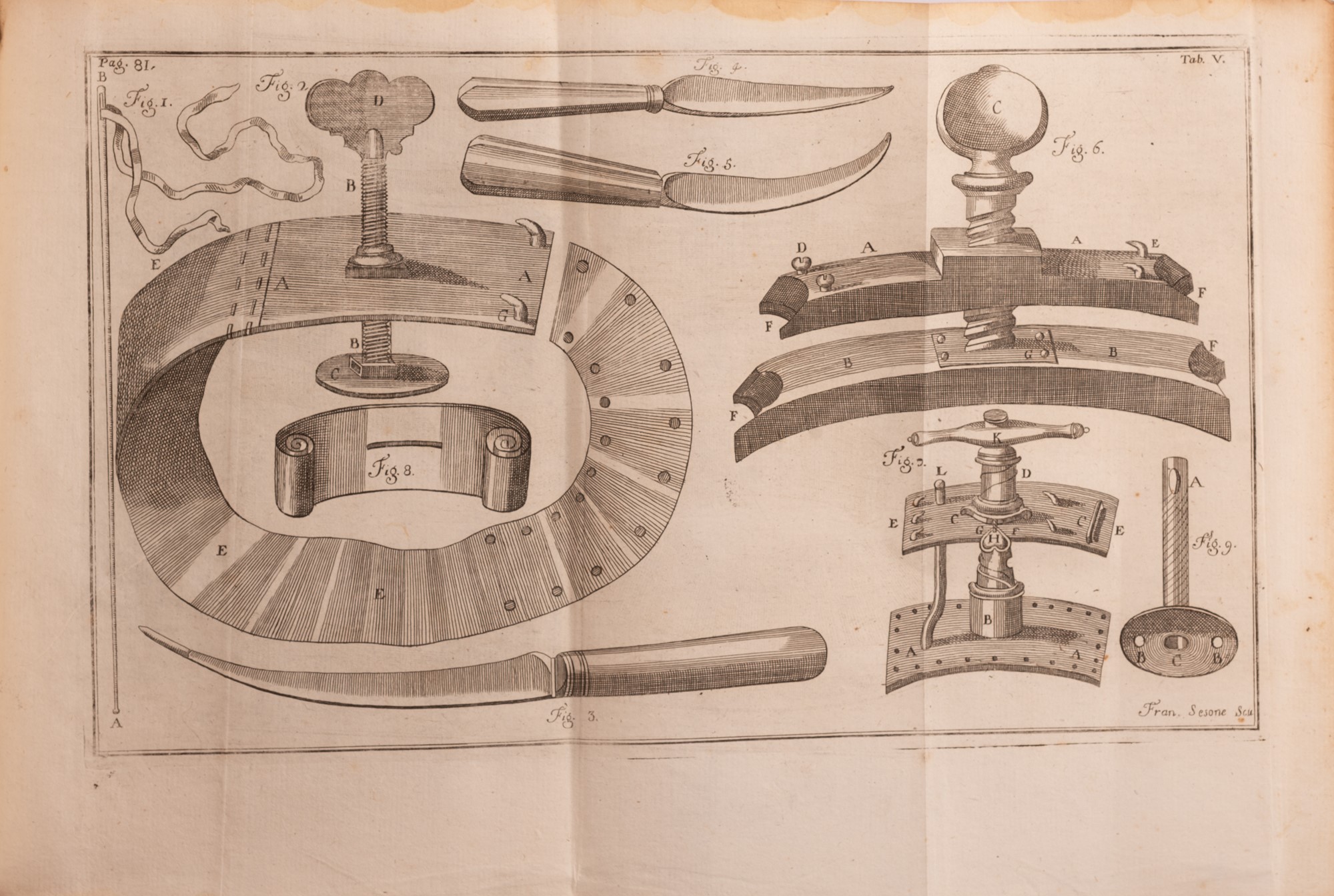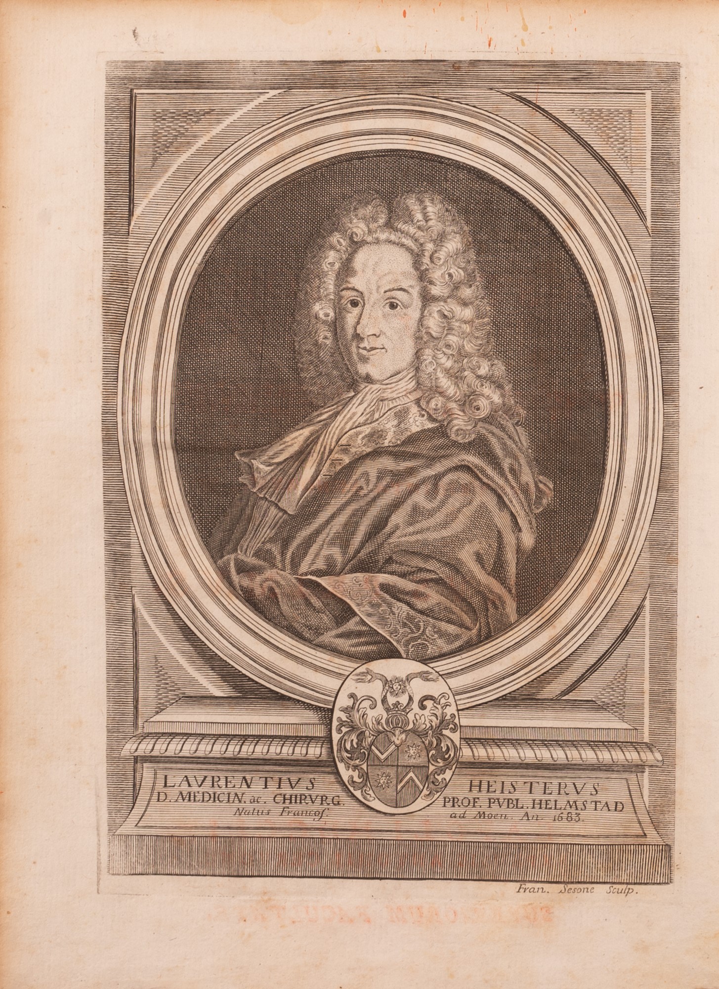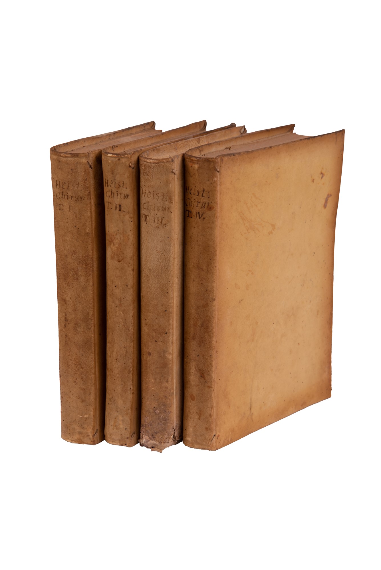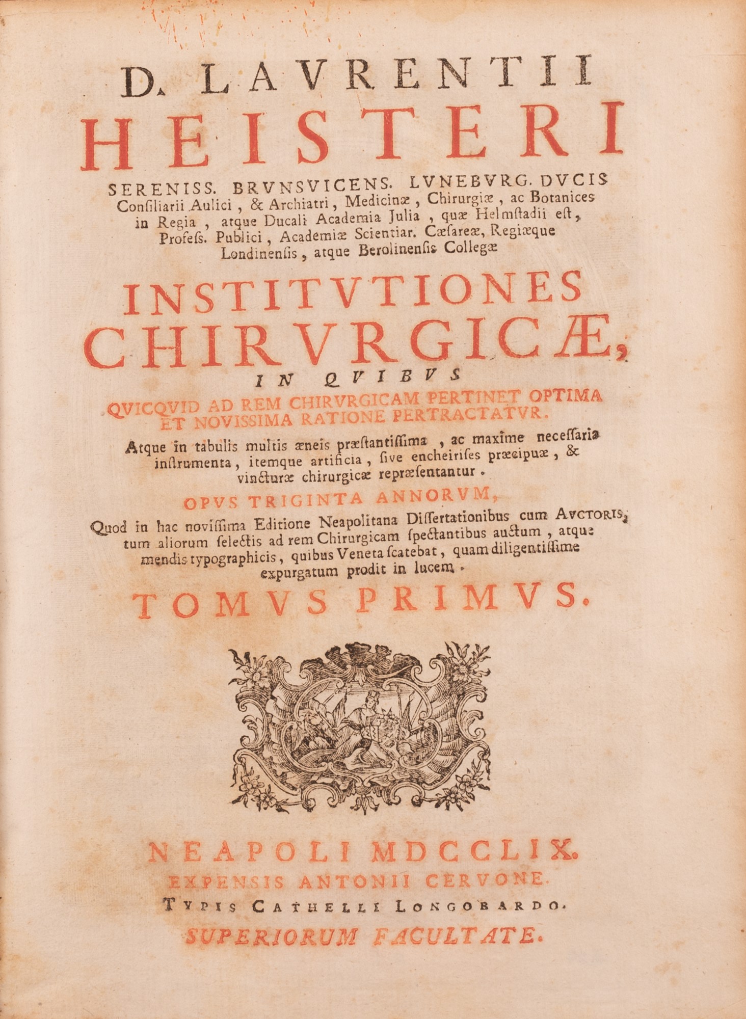 HEISTER Lorenz. D. Laurentii Heisteri Institutiones Chirurgicae in quibus quicquid ad rem chirgurgicam pertinet optima et novissima ratione pertractatur. Atque in tabulis multis aeneis praestantissima, ae necessaria instrumenta, itemque artificia, sive encheirises praecipuae, & vincturae chirurgicae repraesentantur. Opus triginta annorum, Quod in hac novissima Editione Neapolitina Dissertationibus cum Auctoris, tum aliorum selectis ad rem Chirurgicam spectantibus auctum, atque mendis typographicis quibus Veneta scatebat, quam dilligentissime expurgatum prodit in lucem. Neapoli, expensis Antonii Cervone, 1759. Quattro volumi in 8vo; cc.8 n.nn, pp. XLVIII,296; 263; 300; 310, 1n.n. Frontespizio del primo volume con caratteri neri e rossi. Fioriture, tracce d'umido. Ritratto all'antiporta e 38 tavole numerate e spieghevoli incise in rame. Al volume primo un'altra tavola non numerata: tavola unica (vedi foto). Foro da tarlo alle tavole 37 e 38 con lieve perdita di testo. Pergamena coeva, titolo calligrafato ai dorsi.