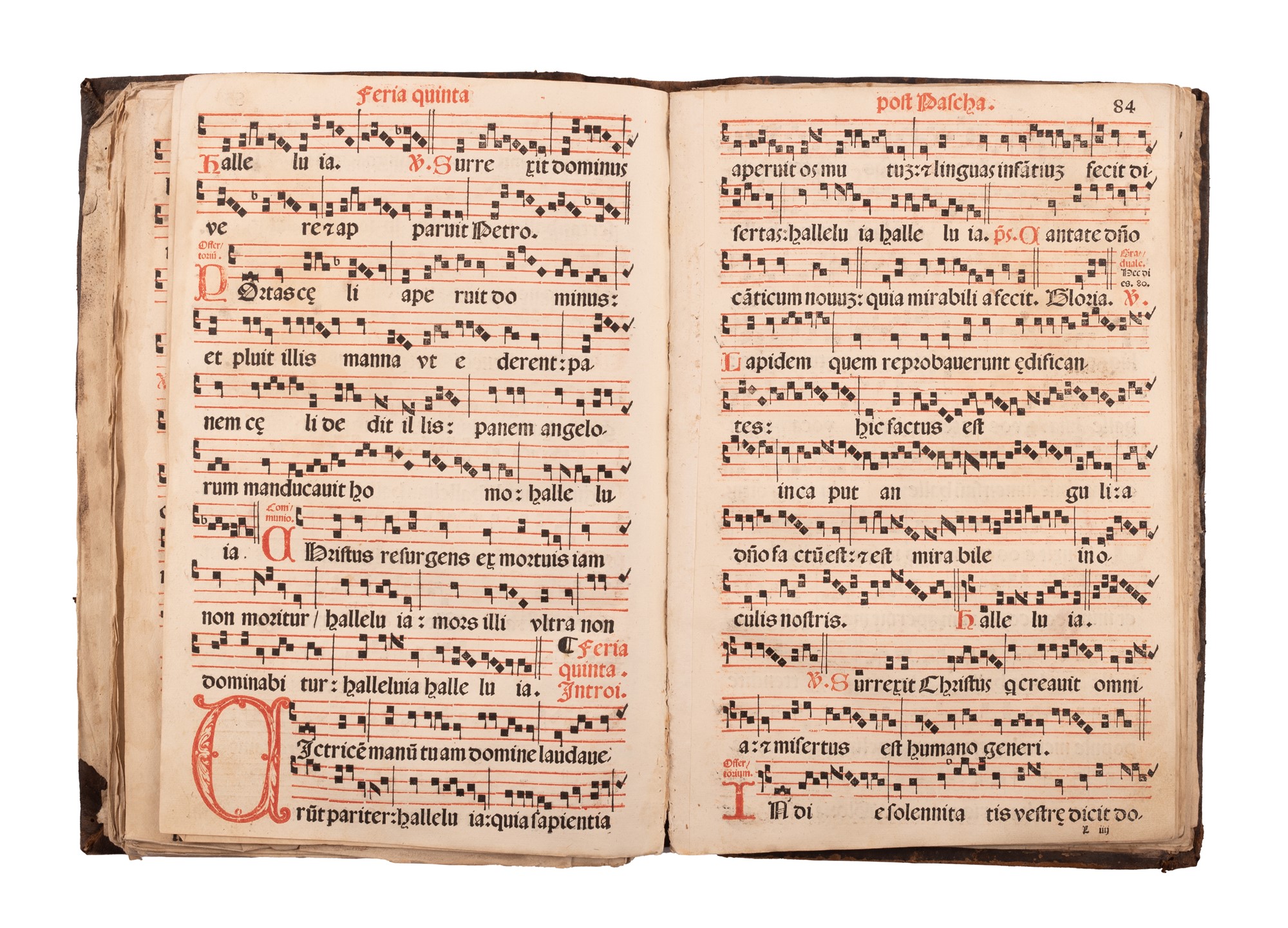 Segn.: A-Z8, Aa-Bb8. - In testa al front.: “Gloria Christo Domino. Amen”. Marca tip. (Agnus Dei) sul front. - Caratt. gotico. - Notaz. quadrata nera su tetr. rosso. - Testo quasi interamente musicato. Stampa in nero e in rosso a piena p.: 11 tetr. per p. - Qualche capil. xil.; grandi iniziali in rosso.
