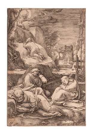 (Muhlbracht, 1558 - Haarlem, 1617) - Cristo in preghiera sul monte degli Ulivi al Getsemani; unangelo appare a Cristo e gli si rivolge; in primo piano tre degli apostoli diCristo sono rannicchiati insieme e profondamente addormentati; oltre uncontingente di soldati emerge da un varco a destra.